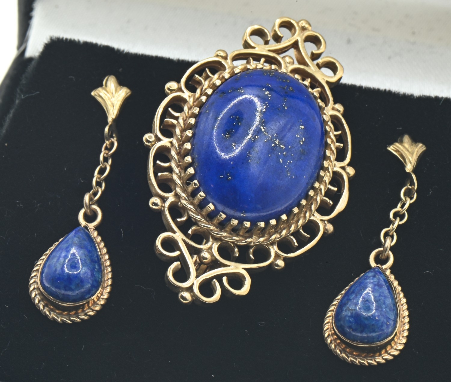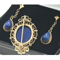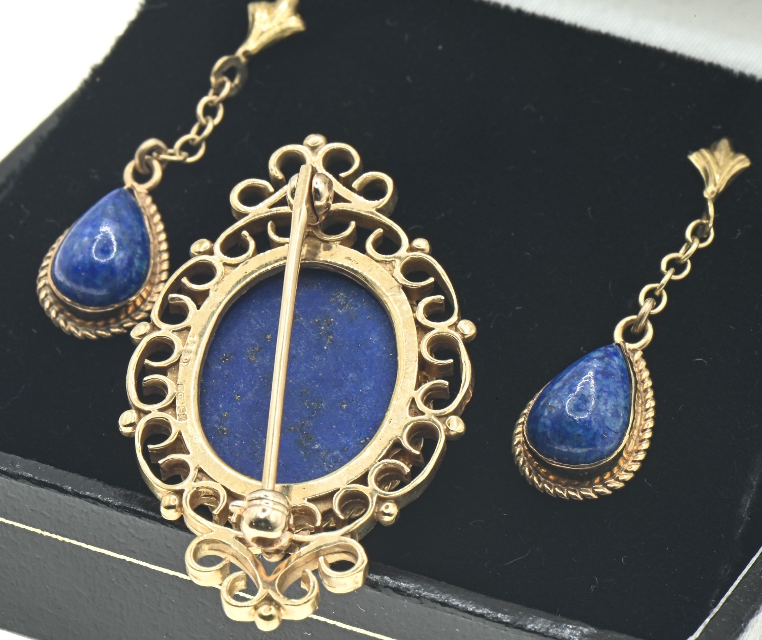 9ct gold and lapis brooch and pair of pendant earrings, hallmarked, brooch length 35mm, earring length 30mm, gross weight 8 grams
