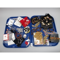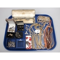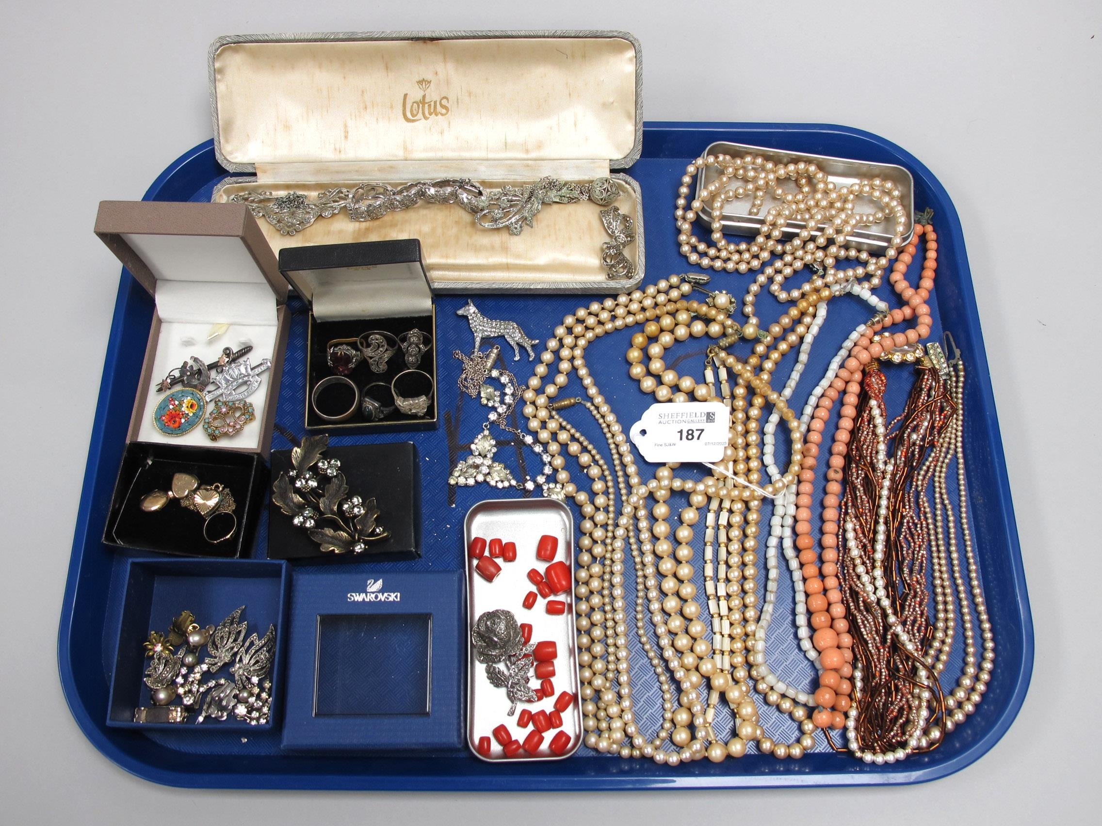 A 9ct Gold Danity Oval Heart Shape Locket Pendant, together with two heart shape locket pendants, a hallmarked silver sword and horseshoe bar brooch, costume brooches, imitation pearls, marcasite set bracelet and brooches, loose beads, marcasite set dress rings, child's ring etc :- One Tray