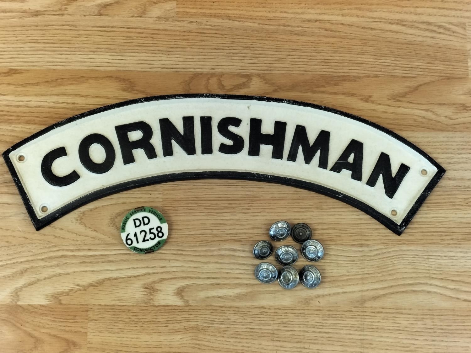 Replica 'Cornishman' Train Engine 48cm Name Plate, 6 Plus 2 British Railways Uniform Buttons plus a PSV Conductors Service Badge DD 61258.