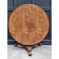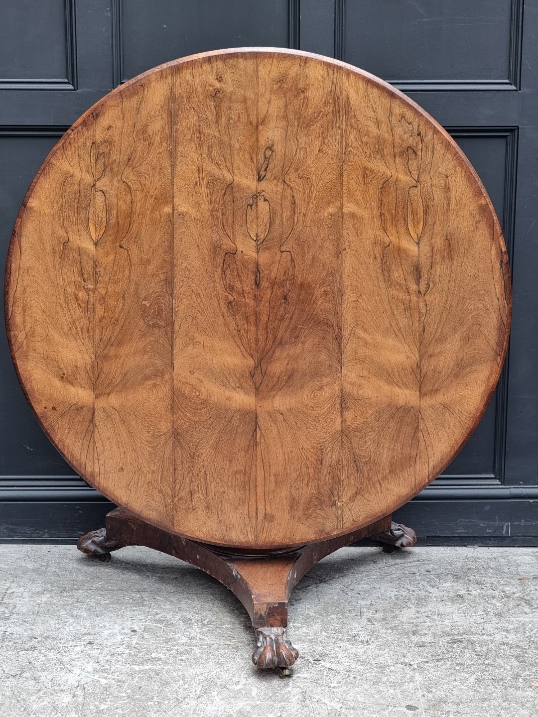 A mid 19th century rosewood circular tilt-top breakfast table, 122cm diameter, (losses to veneer on base).
