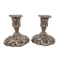 Pair of Victorian ornate silver dwarf candlesticks, with C-scroll and foliate decoration, loaded shaped circular bases, Sheffield 1898, 4.75" high (2)