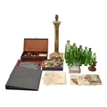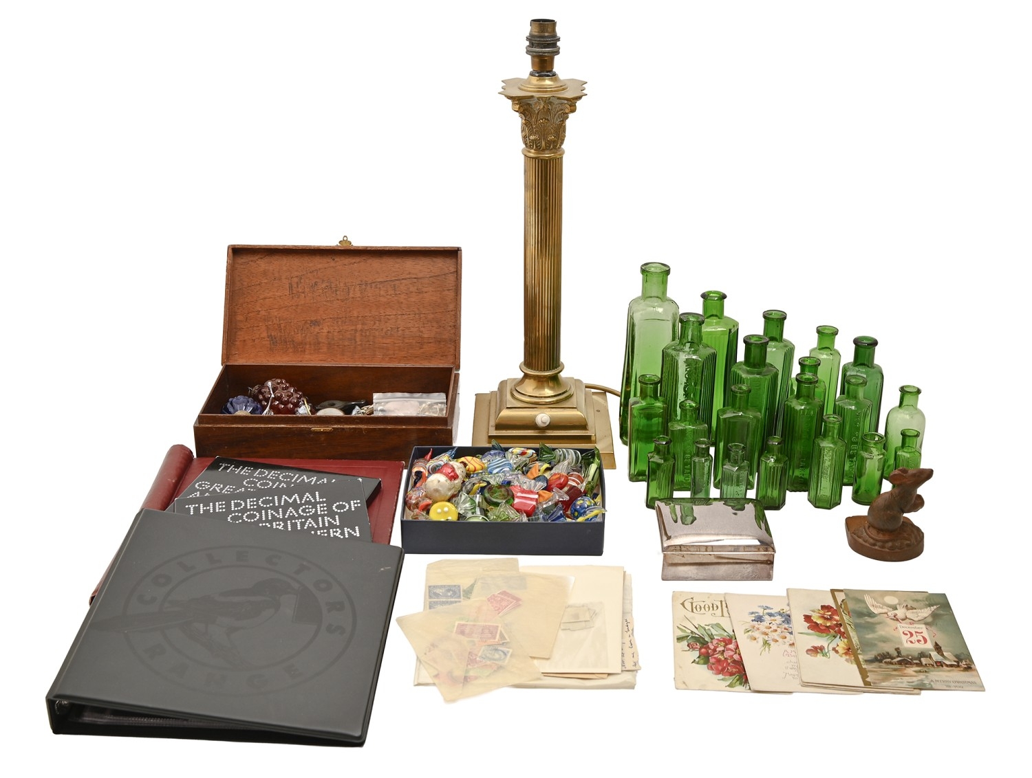 An Edwardian brass corinthian column table lamp, 37cm h excluding fitment, miscellaneous George III and later coins, Victorian and later green glass poison bottles, 19cm h and smaller, glass sweets, EPNS cigarette box, vintage Christmas decorations, etc