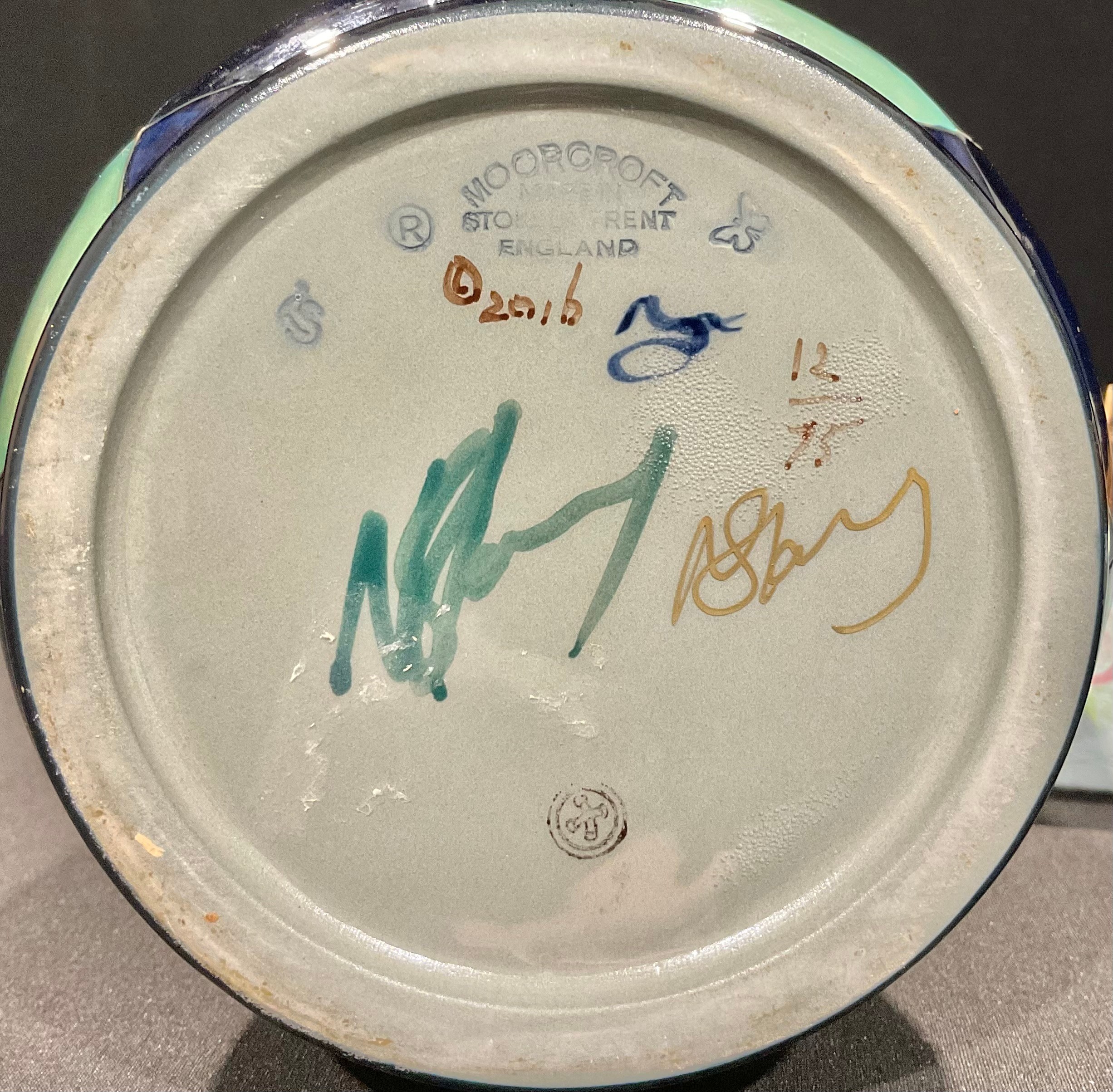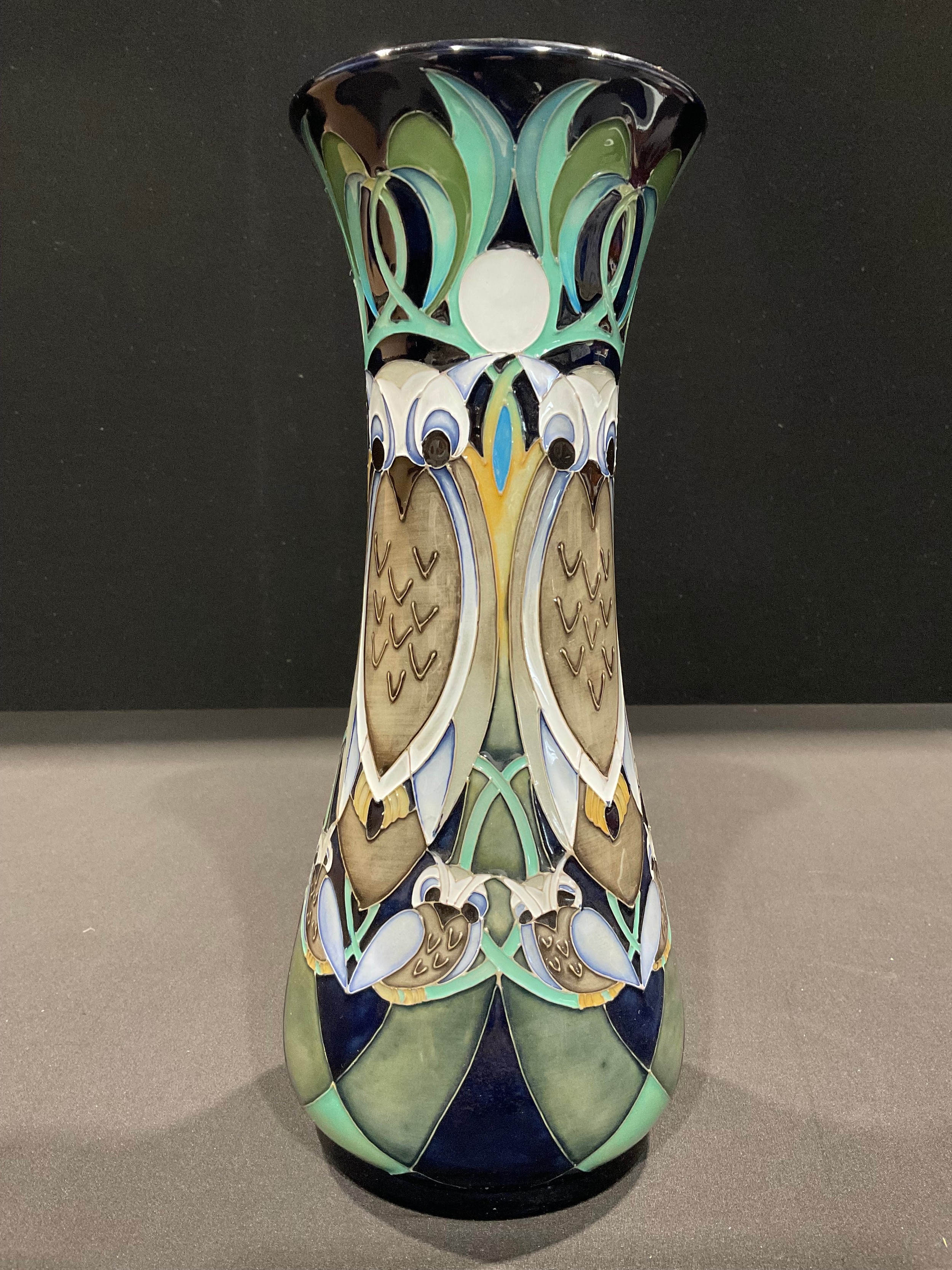 A Moorcroft waisted cylindrical vase, Hidden Wisdom pattern, designed by Nicola Slaney, tube lined with stylised owls, in polychrome, 30.5cm high, limited edition 12/75, impressed and painted marks, signed, c.2016