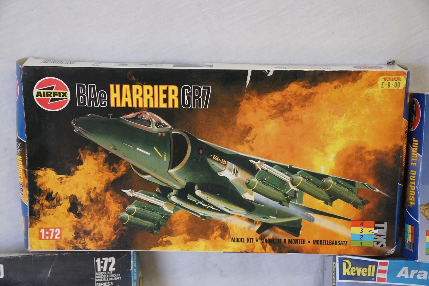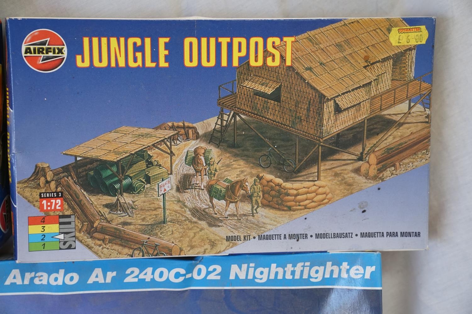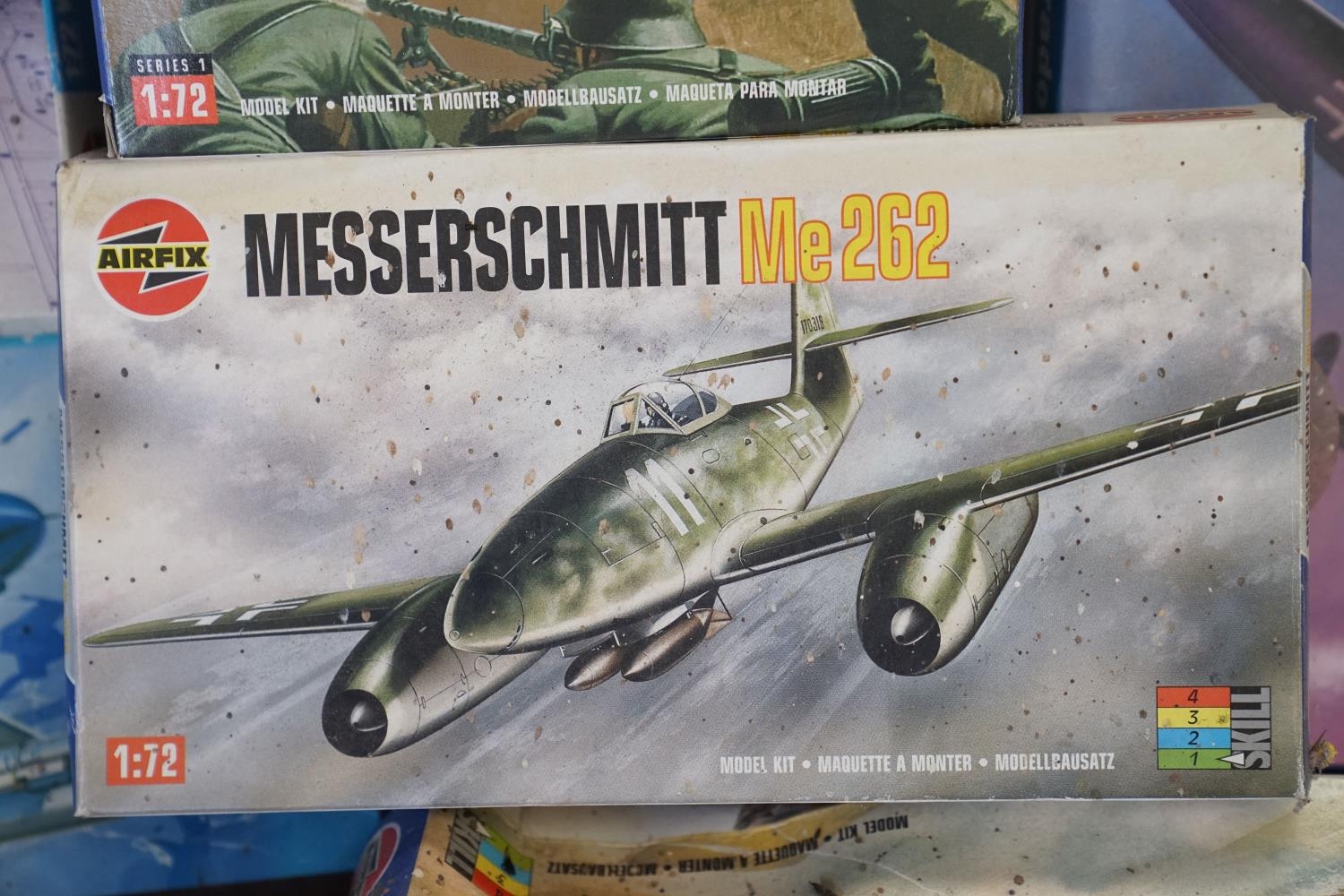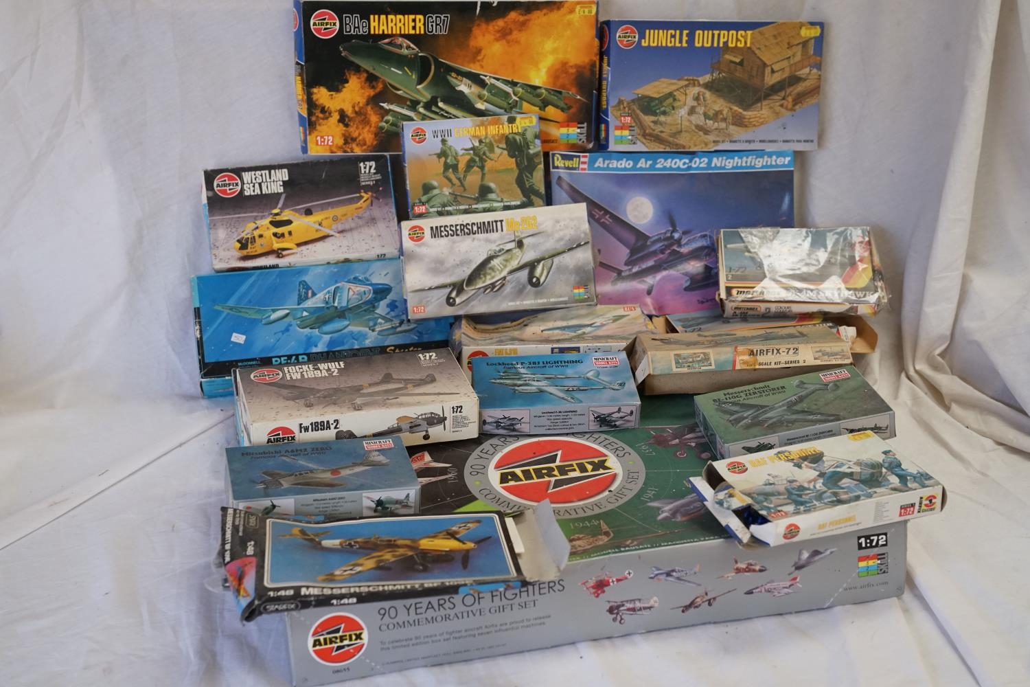 20 x Boxed, unbuilt, plastic model kits to include 10 x 1:72 Airfix featuring 01705 WWII German Infantry, 01030 Messerschmitt Me262, 04039 BAe Harrier GR7, 03043 Westland Sea King, 03382 Jungle Outpost, 03053 Fw189A-2, 01747 RAF Personnel, 08655 90 Years of Flight, Helldiver, 04027 Panavia Tornado GR.1 and 01026 Fiat G.91R, 3 x 1:72 Minicraft Models to inclyuse 14410 Lockheed P-38J Lightning, 14411 Messerchmitt BF-110G Zerstorer and 14416 Mitsubishi A6M2 Zero, 2 x 1:72 Matchbox PK-29 A-4M Skyhawk and PK-44 Dassault Mirage IIIB, 2 x 1:72 Revell 4824 Arado Ar 240C-02 Nightfighter and 04487 McDonnell Douglas AH-64A Apache, 1:48 Starfix Messerchmitt BF 4109E and Fujimi Mokeico Ltd 1:72 FR-4B Phantom-II