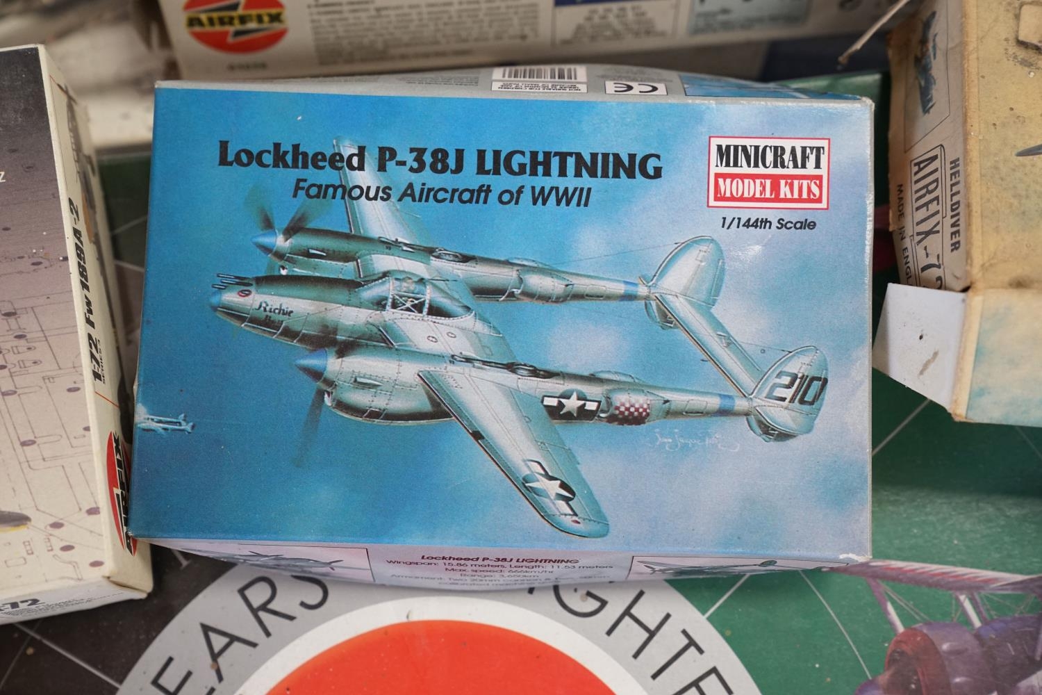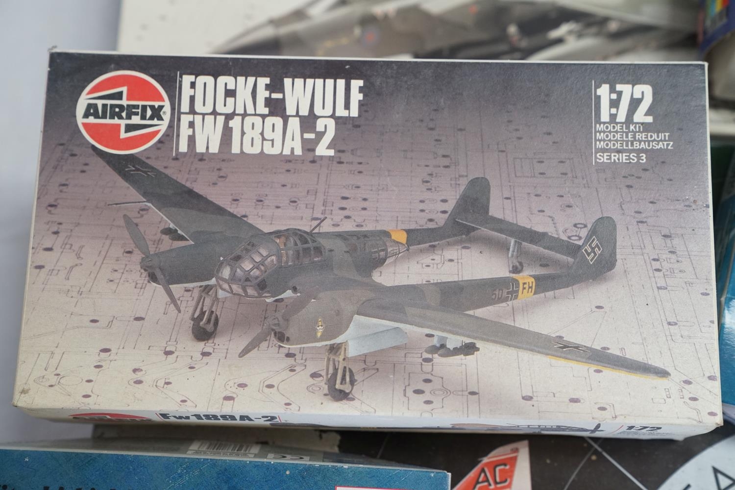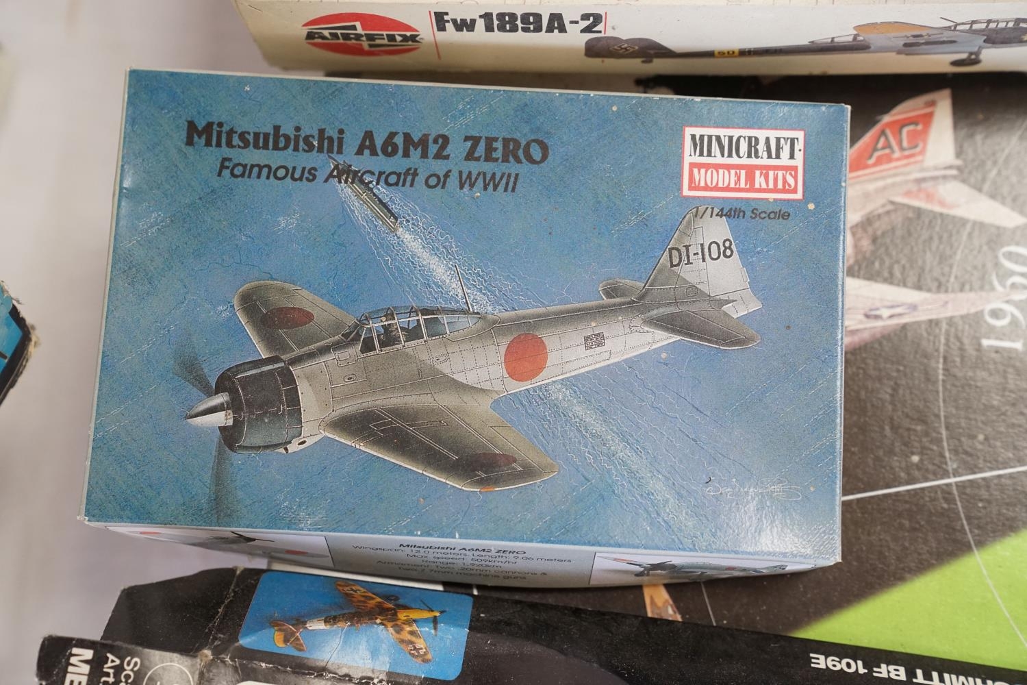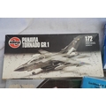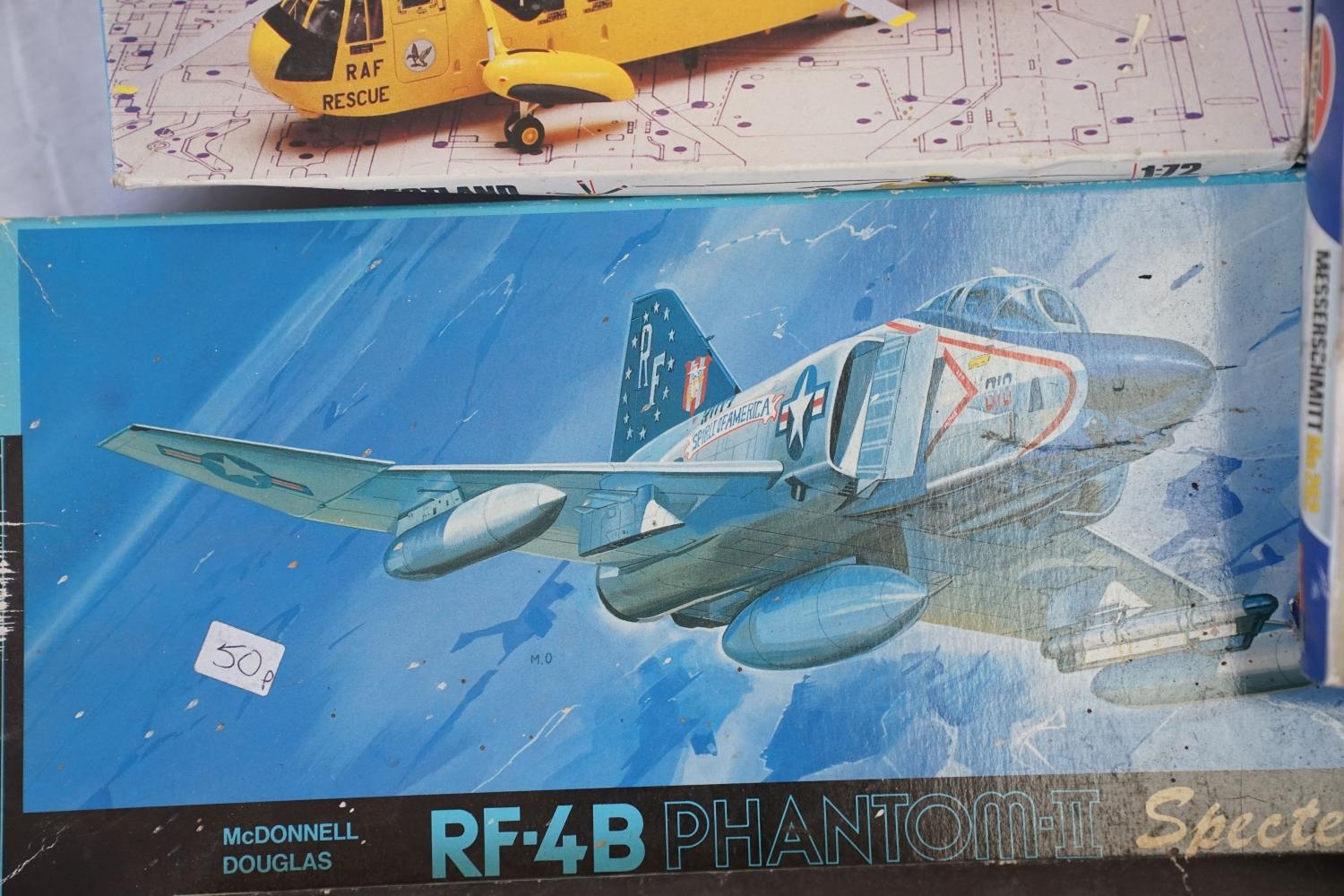 20 x Boxed, unbuilt, plastic model kits to include 10 x 1:72 Airfix featuring 01705 WWII German Infantry, 01030 Messerschmitt Me262, 04039 BAe Harrier GR7, 03043 Westland Sea King, 03382 Jungle Outpost, 03053 Fw189A-2, 01747 RAF Personnel, 08655 90 Years of Flight, Helldiver, 04027 Panavia Tornado GR.1 and 01026 Fiat G.91R, 3 x 1:72 Minicraft Models to inclyuse 14410 Lockheed P-38J Lightning, 14411 Messerchmitt BF-110G Zerstorer and 14416 Mitsubishi A6M2 Zero, 2 x 1:72 Matchbox PK-29 A-4M Skyhawk and PK-44 Dassault Mirage IIIB, 2 x 1:72 Revell 4824 Arado Ar 240C-02 Nightfighter and 04487 McDonnell Douglas AH-64A Apache, 1:48 Starfix Messerchmitt BF 4109E and Fujimi Mokeico Ltd 1:72 FR-4B Phantom-II