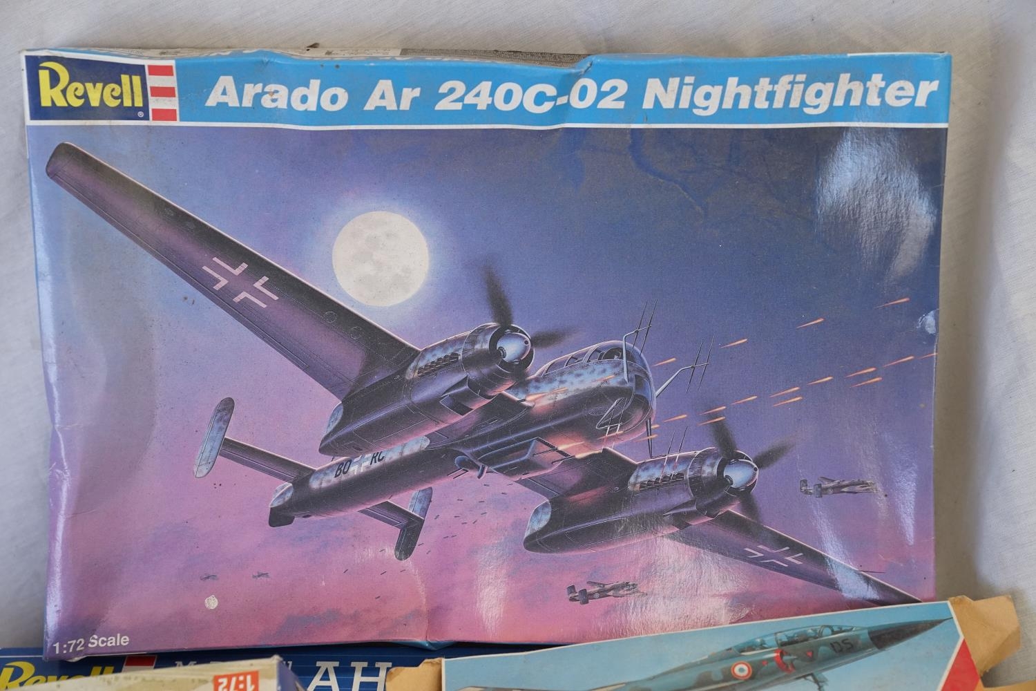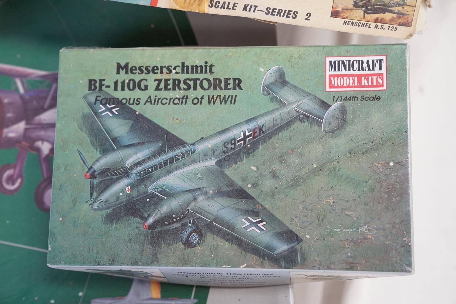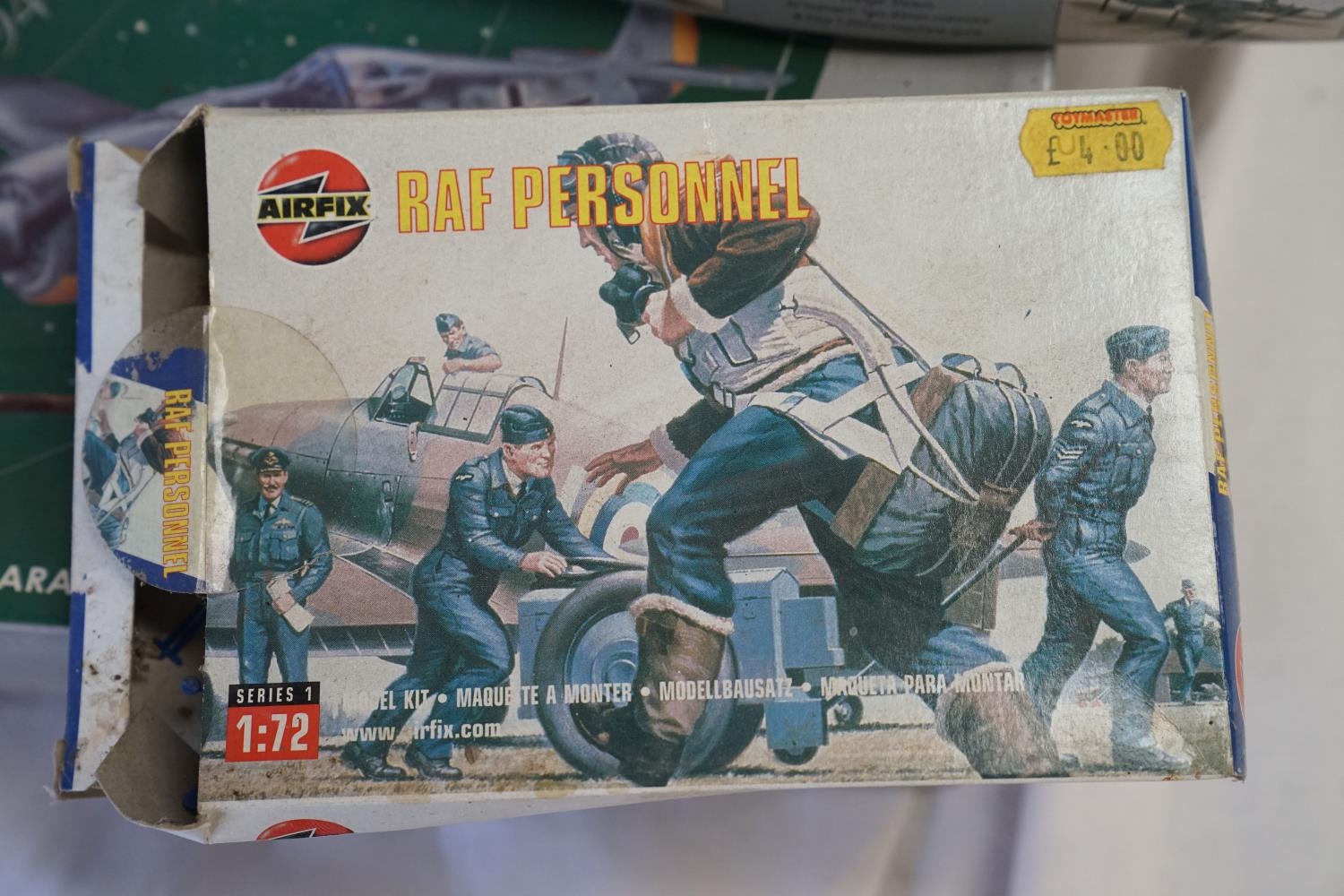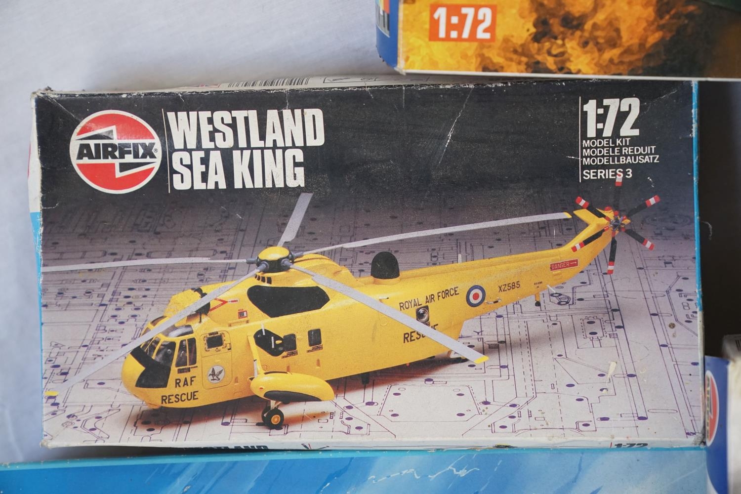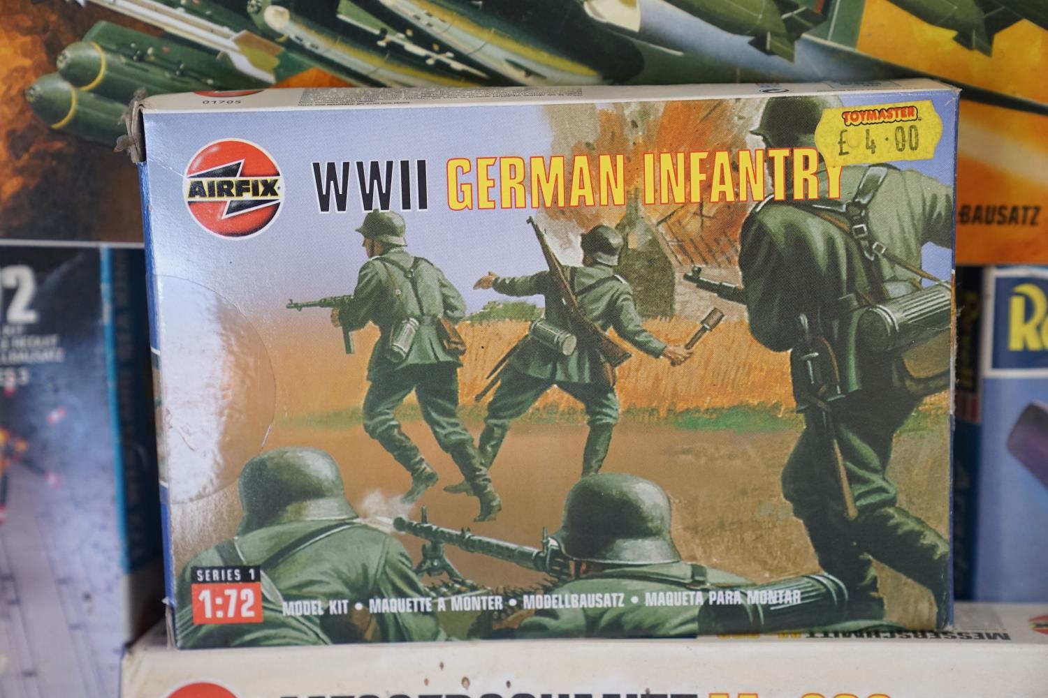 20 x Boxed, unbuilt, plastic model kits to include 10 x 1:72 Airfix featuring 01705 WWII German Infantry, 01030 Messerschmitt Me262, 04039 BAe Harrier GR7, 03043 Westland Sea King, 03382 Jungle Outpost, 03053 Fw189A-2, 01747 RAF Personnel, 08655 90 Years of Flight, Helldiver, 04027 Panavia Tornado GR.1 and 01026 Fiat G.91R, 3 x 1:72 Minicraft Models to inclyuse 14410 Lockheed P-38J Lightning, 14411 Messerchmitt BF-110G Zerstorer and 14416 Mitsubishi A6M2 Zero, 2 x 1:72 Matchbox PK-29 A-4M Skyhawk and PK-44 Dassault Mirage IIIB, 2 x 1:72 Revell 4824 Arado Ar 240C-02 Nightfighter and 04487 McDonnell Douglas AH-64A Apache, 1:48 Starfix Messerchmitt BF 4109E and Fujimi Mokeico Ltd 1:72 FR-4B Phantom-II