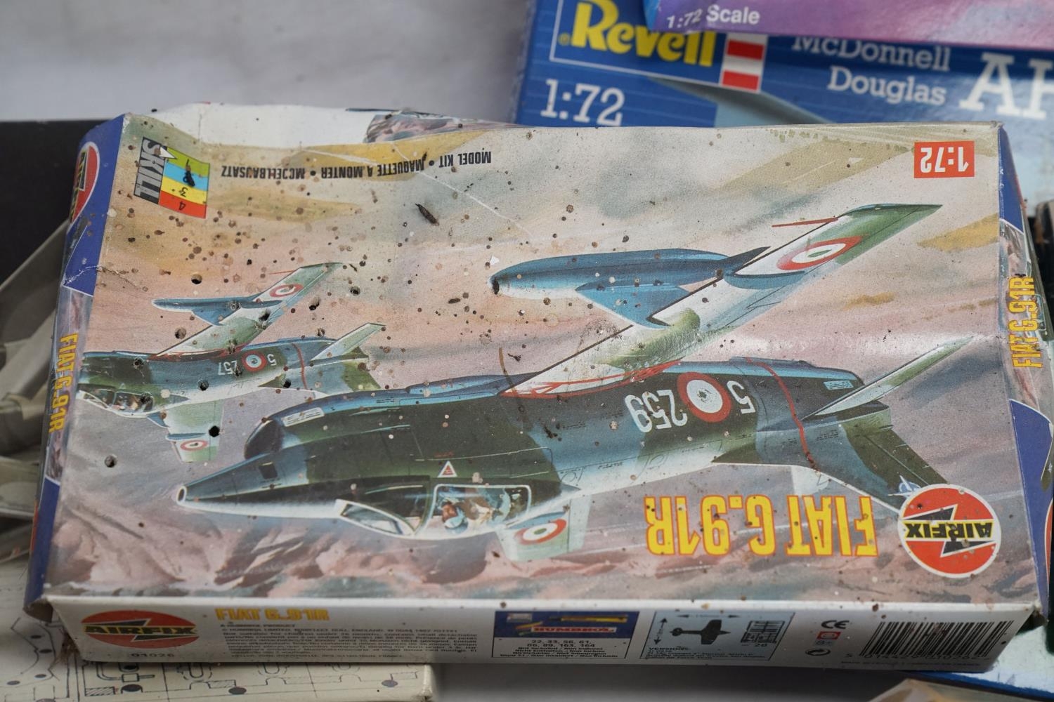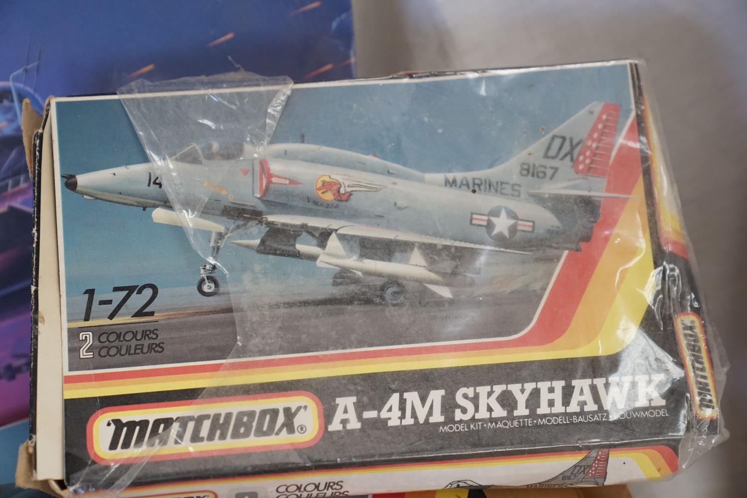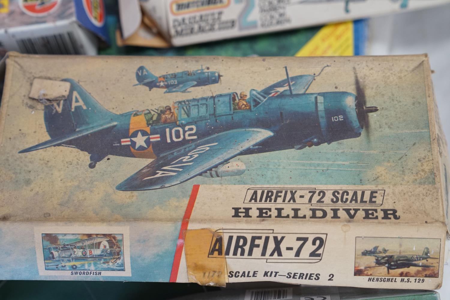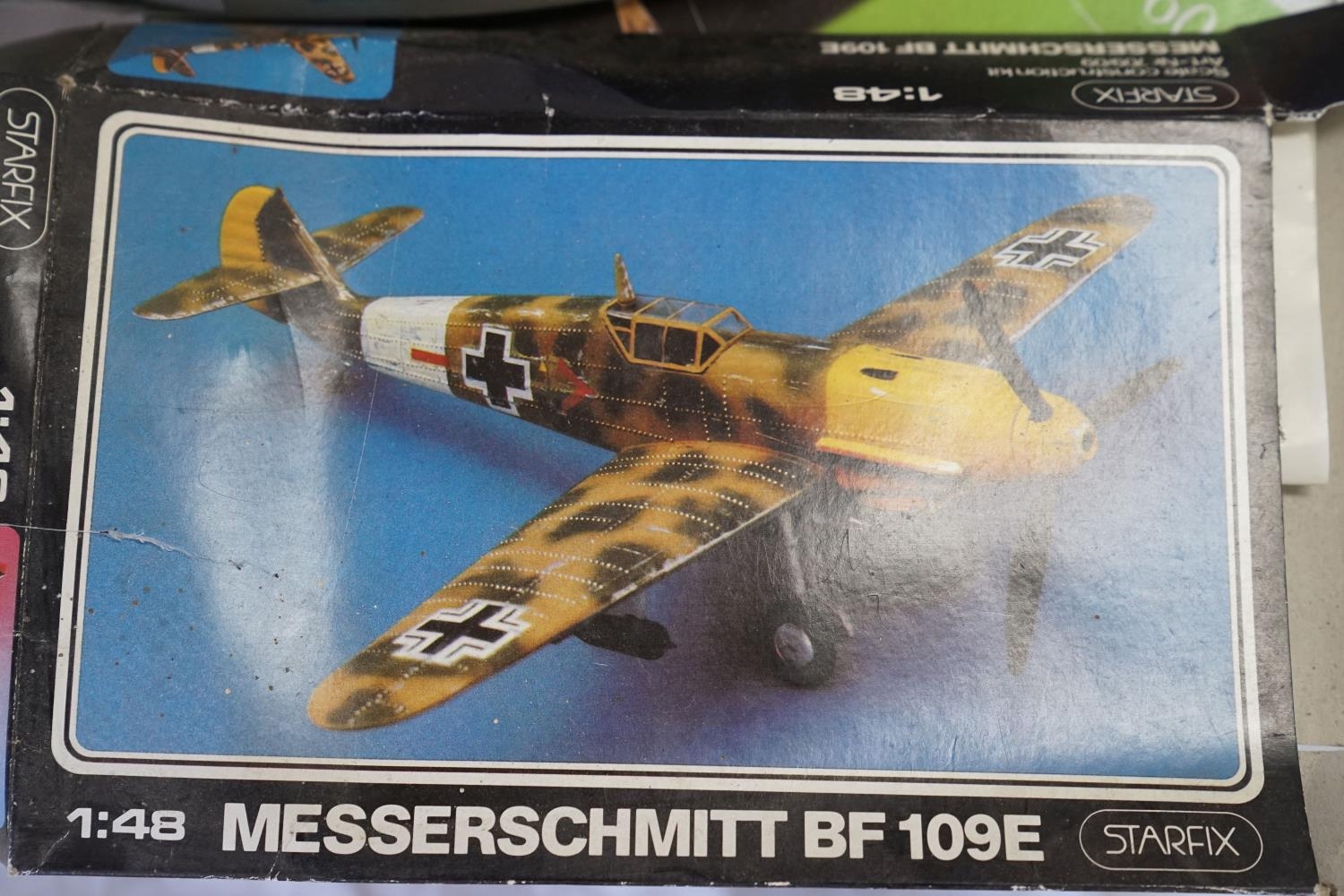 20 x Boxed, unbuilt, plastic model kits to include 10 x 1:72 Airfix featuring 01705 WWII German Infantry, 01030 Messerschmitt Me262, 04039 BAe Harrier GR7, 03043 Westland Sea King, 03382 Jungle Outpost, 03053 Fw189A-2, 01747 RAF Personnel, 08655 90 Years of Flight, Helldiver, 04027 Panavia Tornado GR.1 and 01026 Fiat G.91R, 3 x 1:72 Minicraft Models to inclyuse 14410 Lockheed P-38J Lightning, 14411 Messerchmitt BF-110G Zerstorer and 14416 Mitsubishi A6M2 Zero, 2 x 1:72 Matchbox PK-29 A-4M Skyhawk and PK-44 Dassault Mirage IIIB, 2 x 1:72 Revell 4824 Arado Ar 240C-02 Nightfighter and 04487 McDonnell Douglas AH-64A Apache, 1:48 Starfix Messerchmitt BF 4109E and Fujimi Mokeico Ltd 1:72 FR-4B Phantom-II