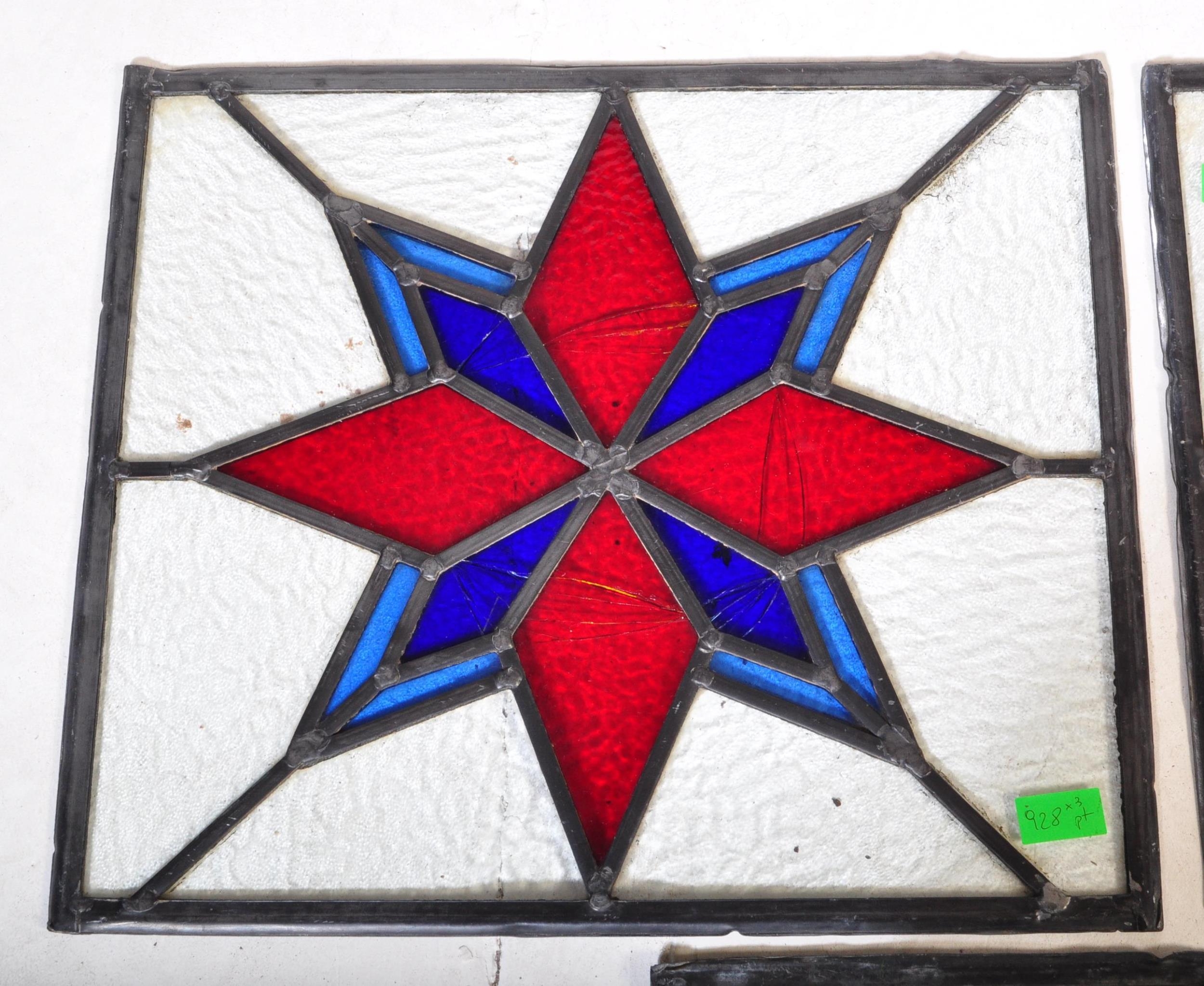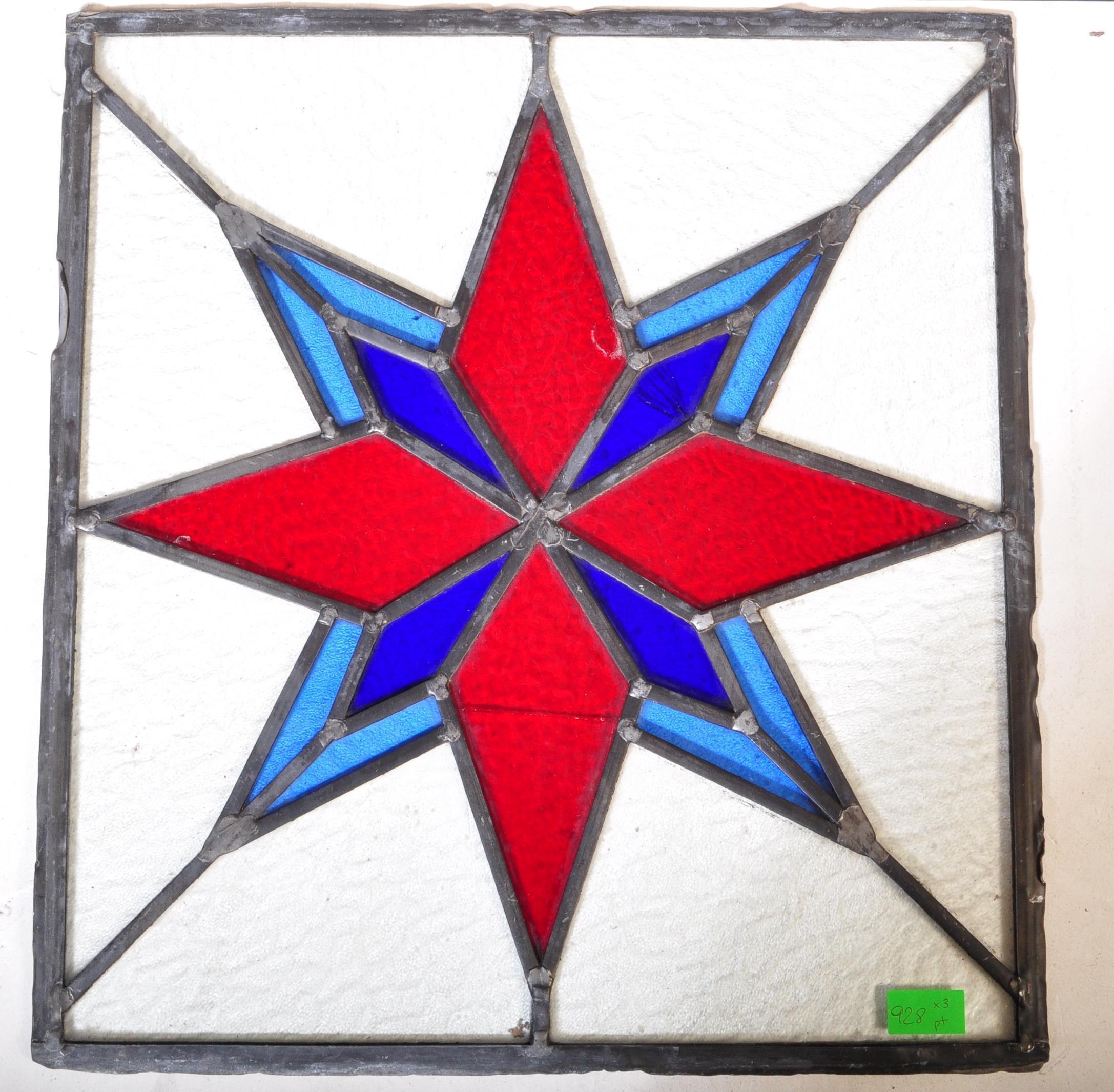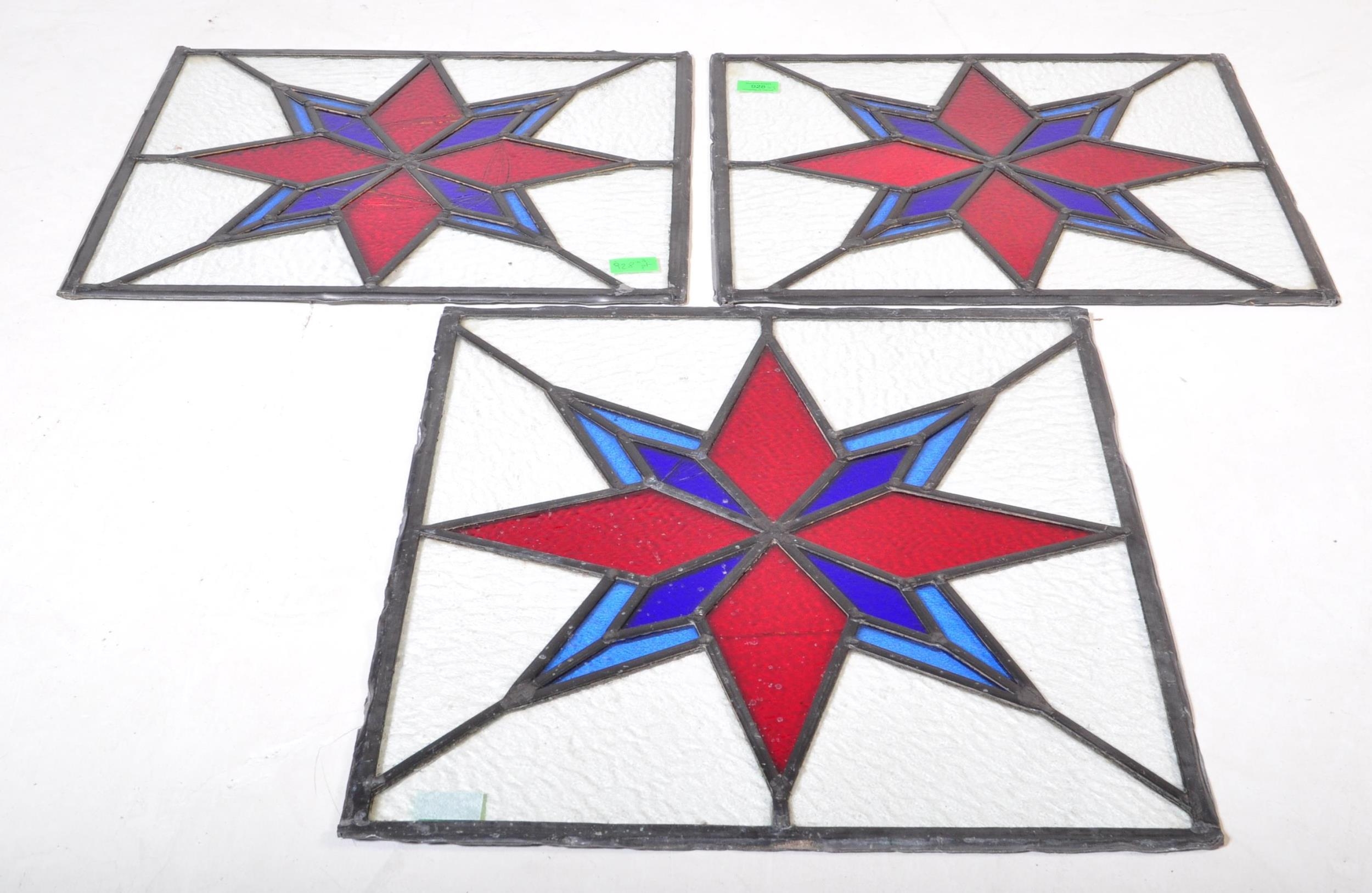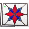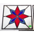 An assortment of three Victorian 19th century leaded stained glass panels of various sizes decorated with star shaped central pattern in red & blue colourways. Largest measuring approx. 50 x 54cm.
