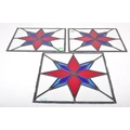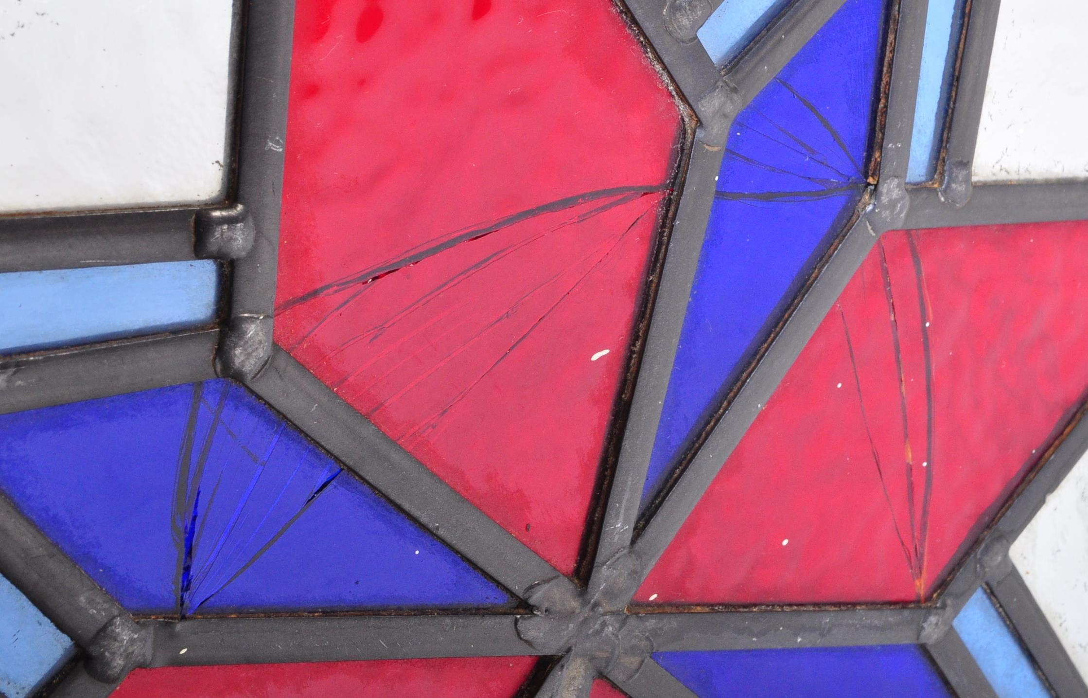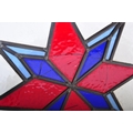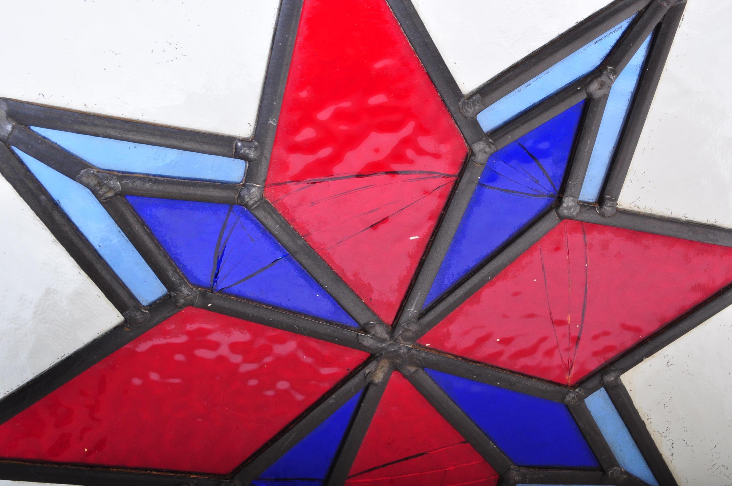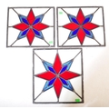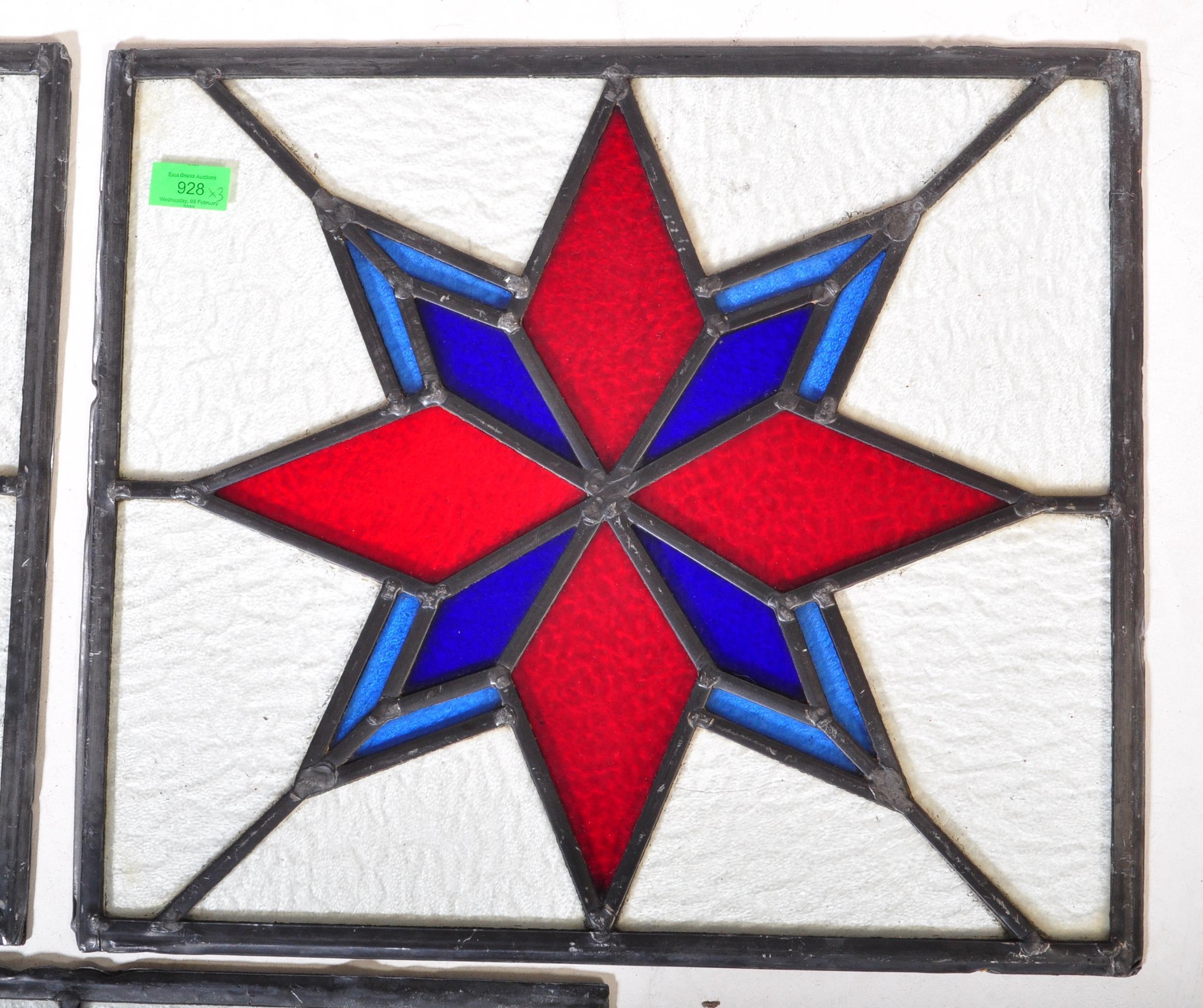 An assortment of three Victorian 19th century leaded stained glass panels of various sizes decorated with star shaped central pattern in red & blue colourways. Largest measuring approx. 50 x 54cm.