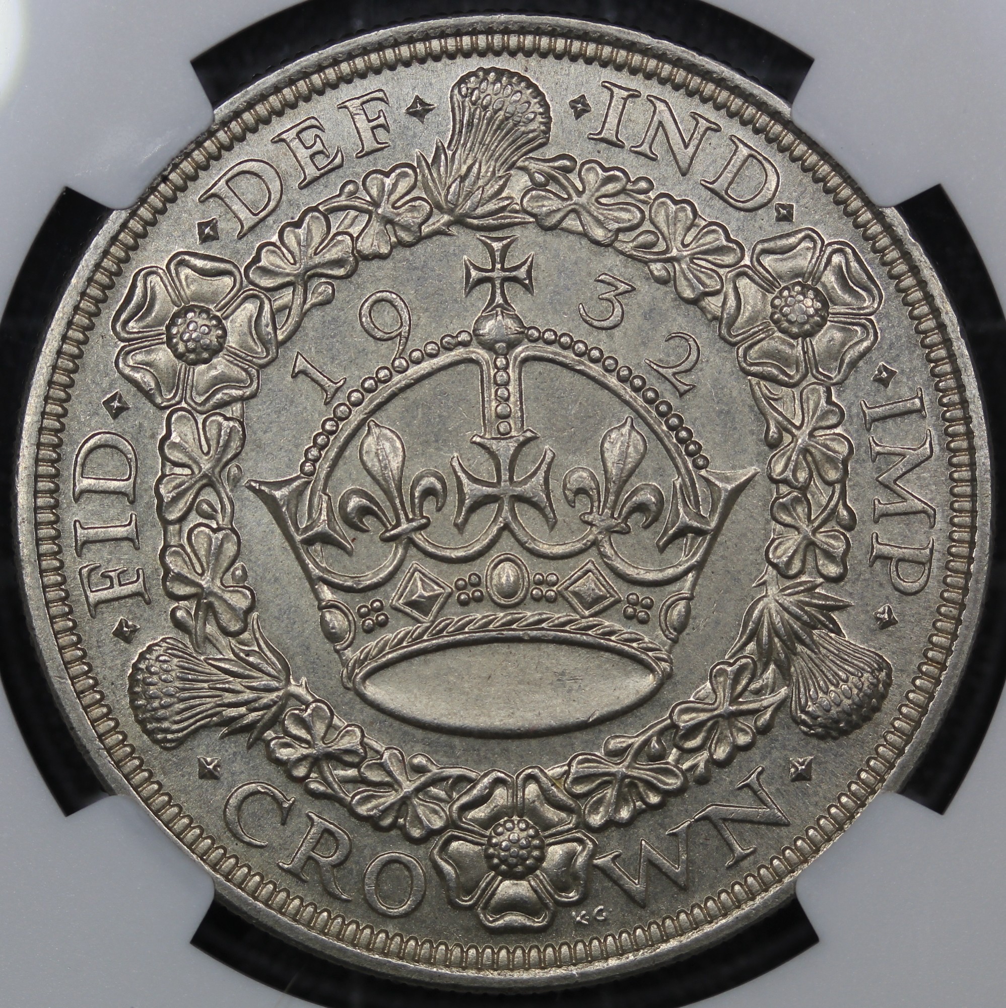 1932 Wreath Crown, George V (ESC 372, Bull 3641, S.4036). Graded NGC MS64, uncirculated, and the joint finest recorded. in the census with just one recorded higher at PCGS. An exceptional example presented in a Coinery Collection holder and one of just 2,395 coins struck, second only to the famed 1934.