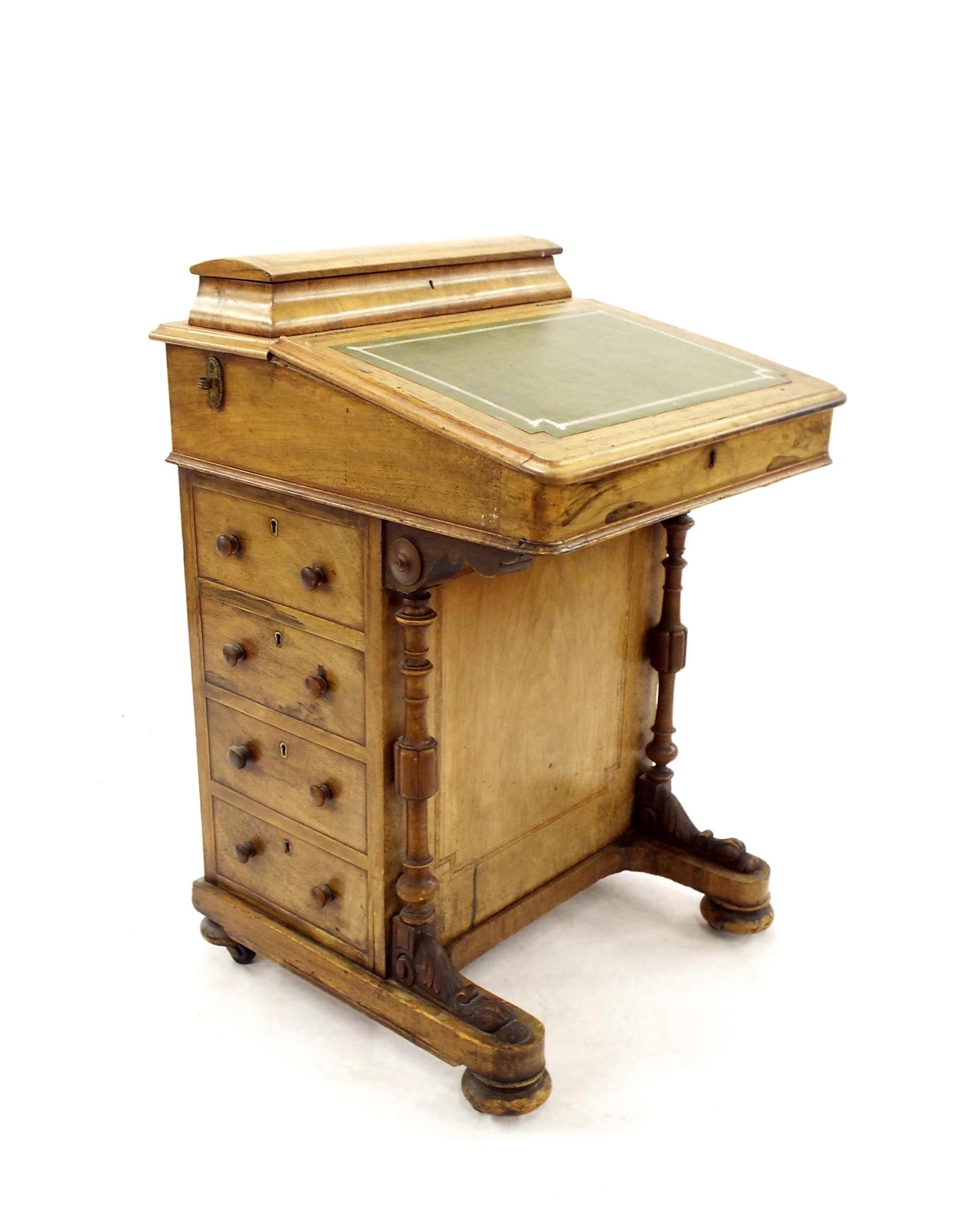 Victorian burr walnut davenport, the dome compartment over a green inset top enclosing a maple lined interior, with three short drawers opposing dummy drawers with front turned supports, 21" wide (at fault)