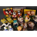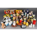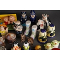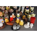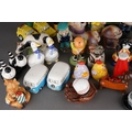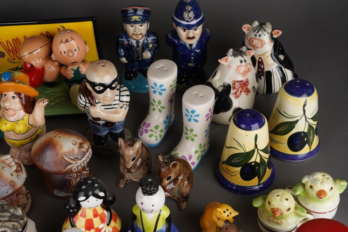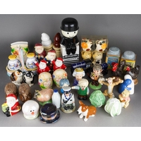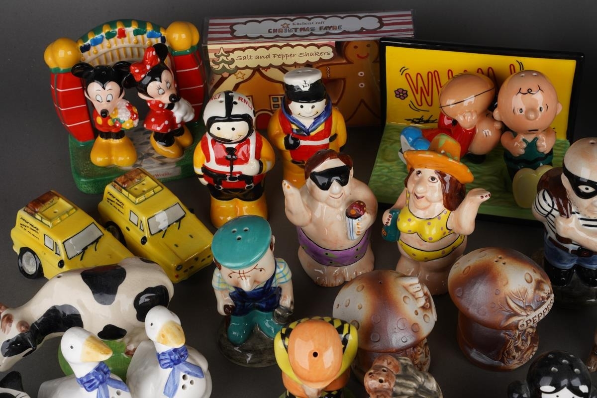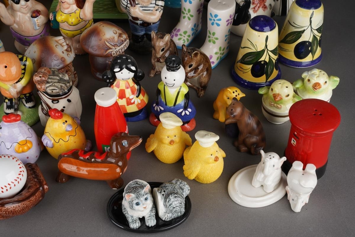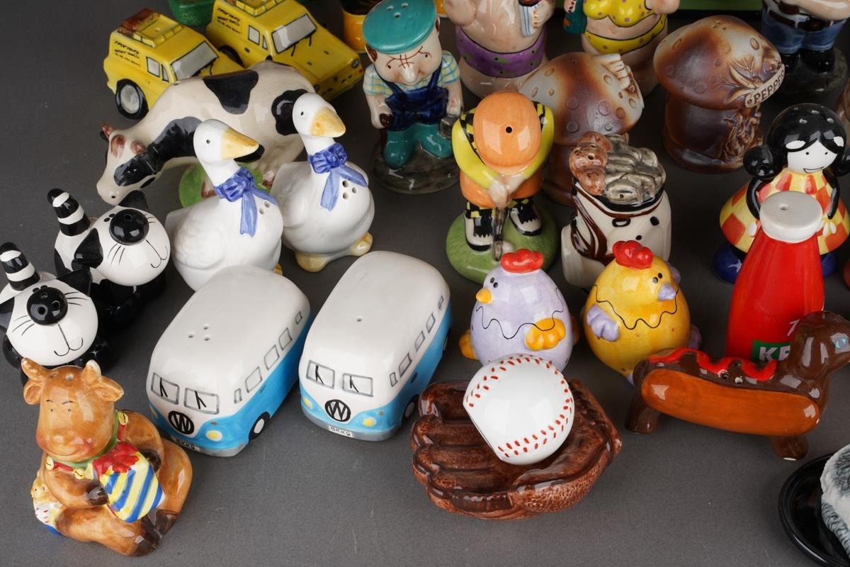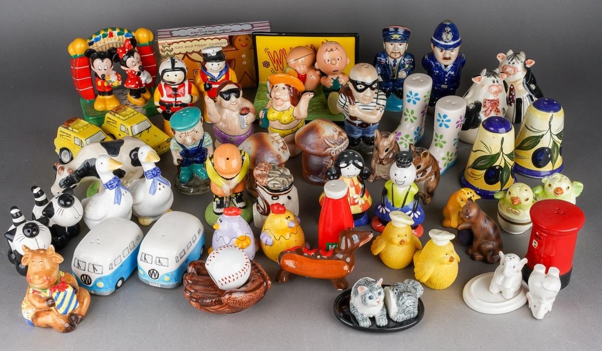 A collection of novelty salt and peppers, various factories, designs include Cows, Cats, Geese, Chicks, Peanut, Yellow Taxis, Boots, VW Camper vans, Golfers, Sausage Dog with Ketchup bottle, Holiday makers, Mickey & Minnie Mouse etc [1 box]