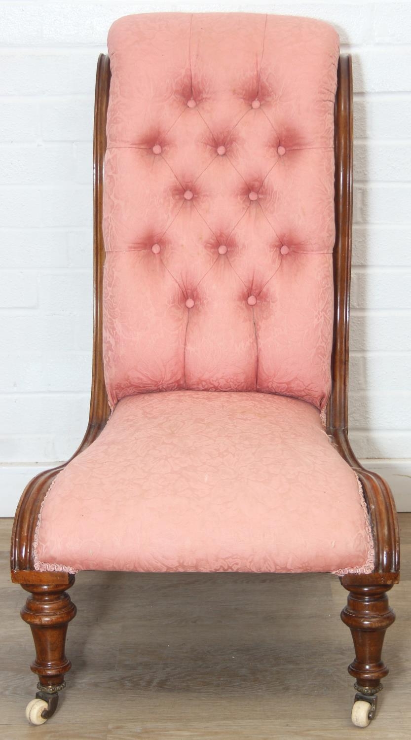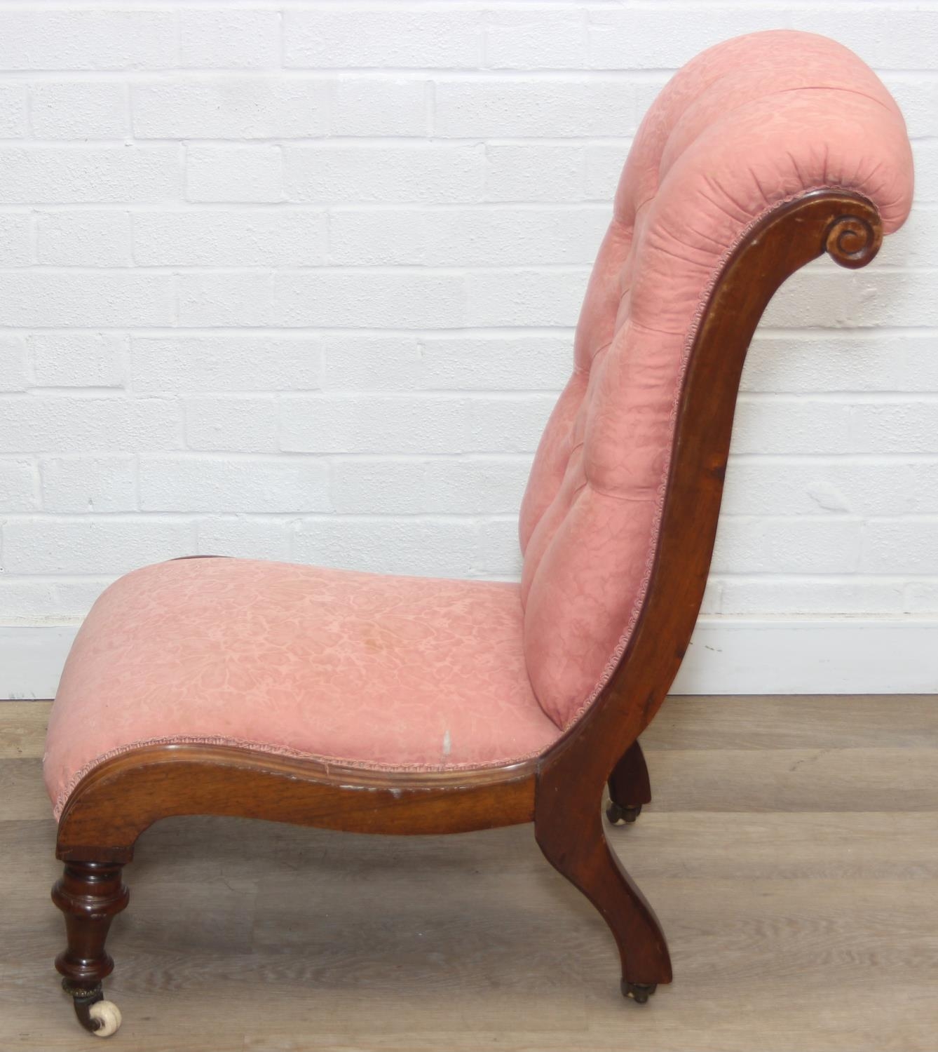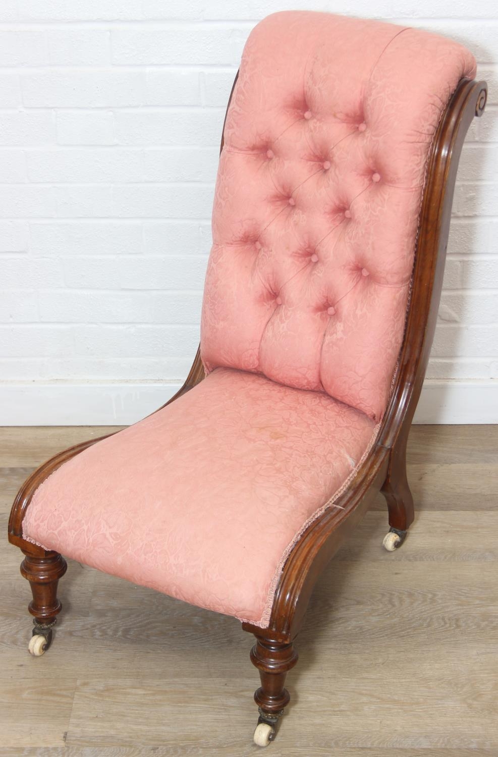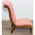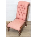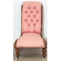 A Victorian period nursing chair with pink button back upholstery, exposed mahogany frame and brass and ceramic castors, 90cm tall