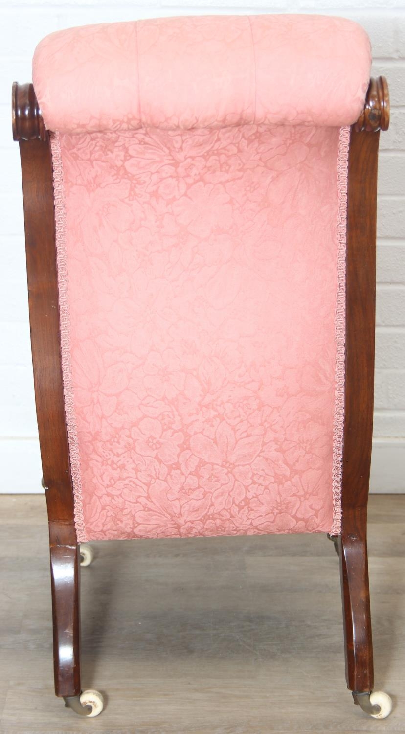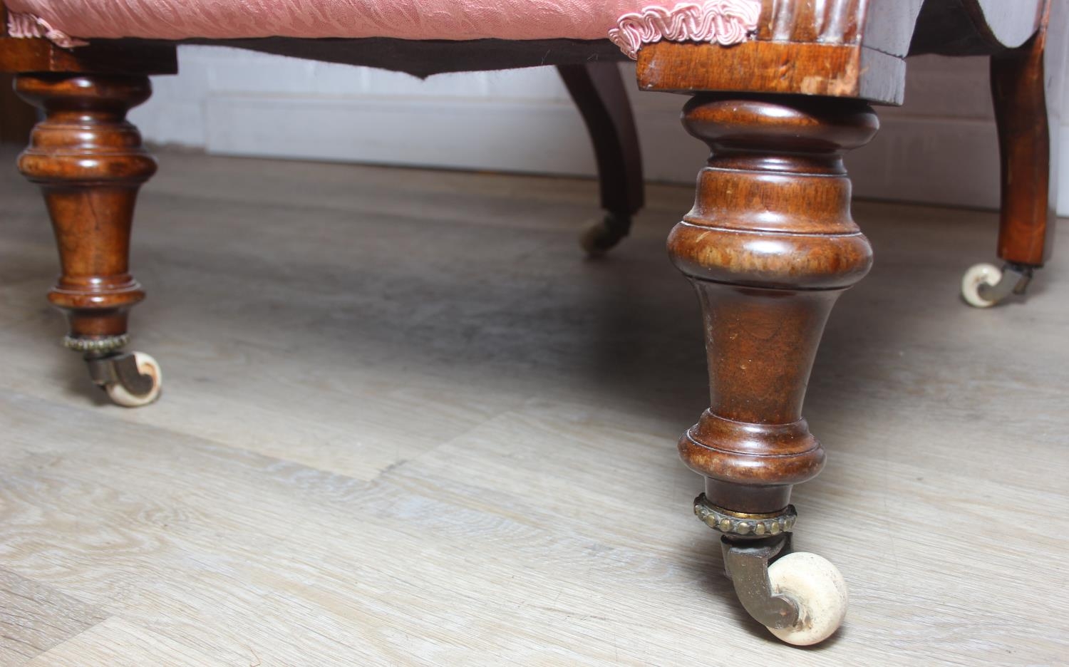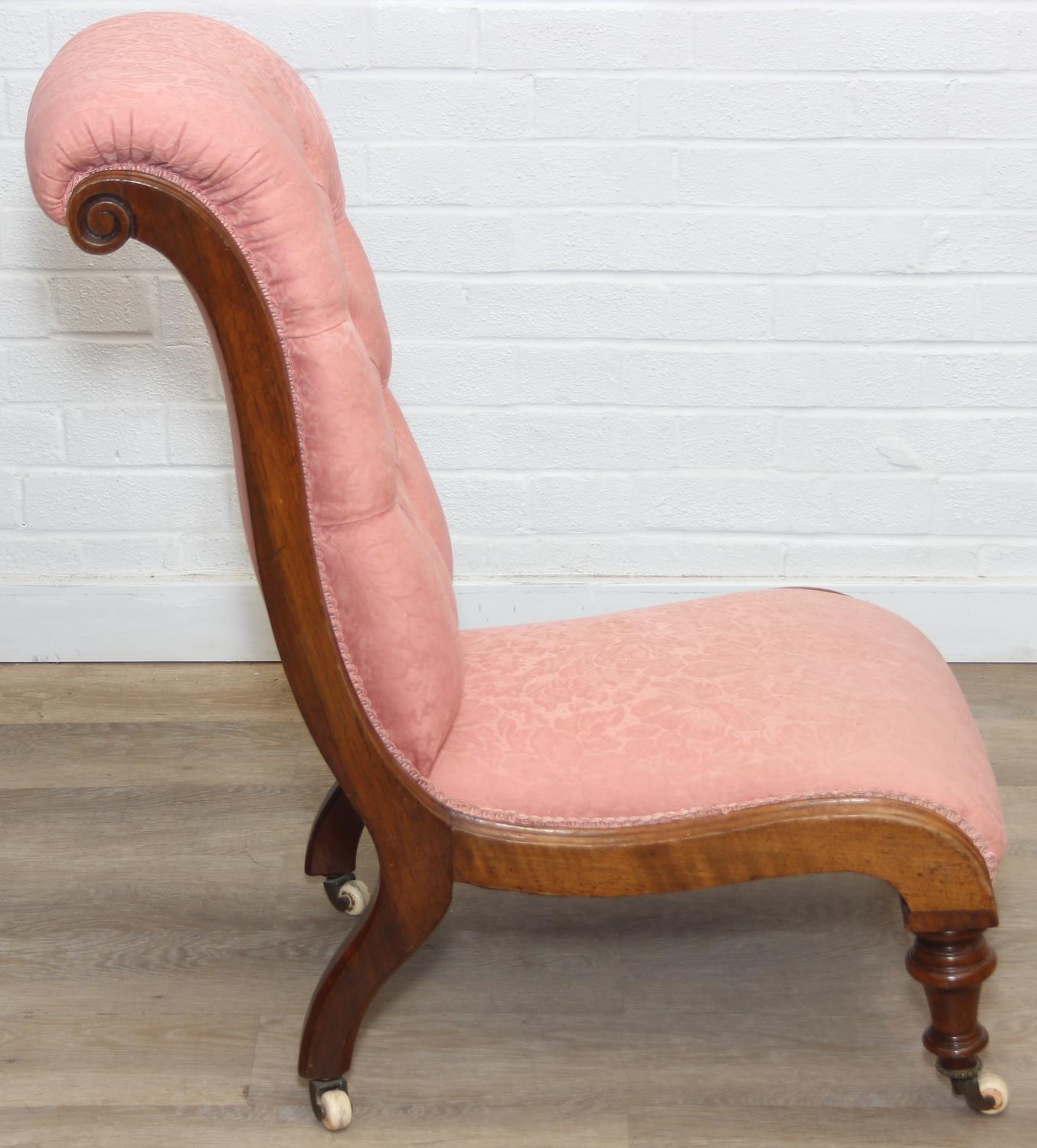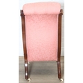 A Victorian period nursing chair with pink button back upholstery, exposed mahogany frame and brass and ceramic castors, 90cm tall
