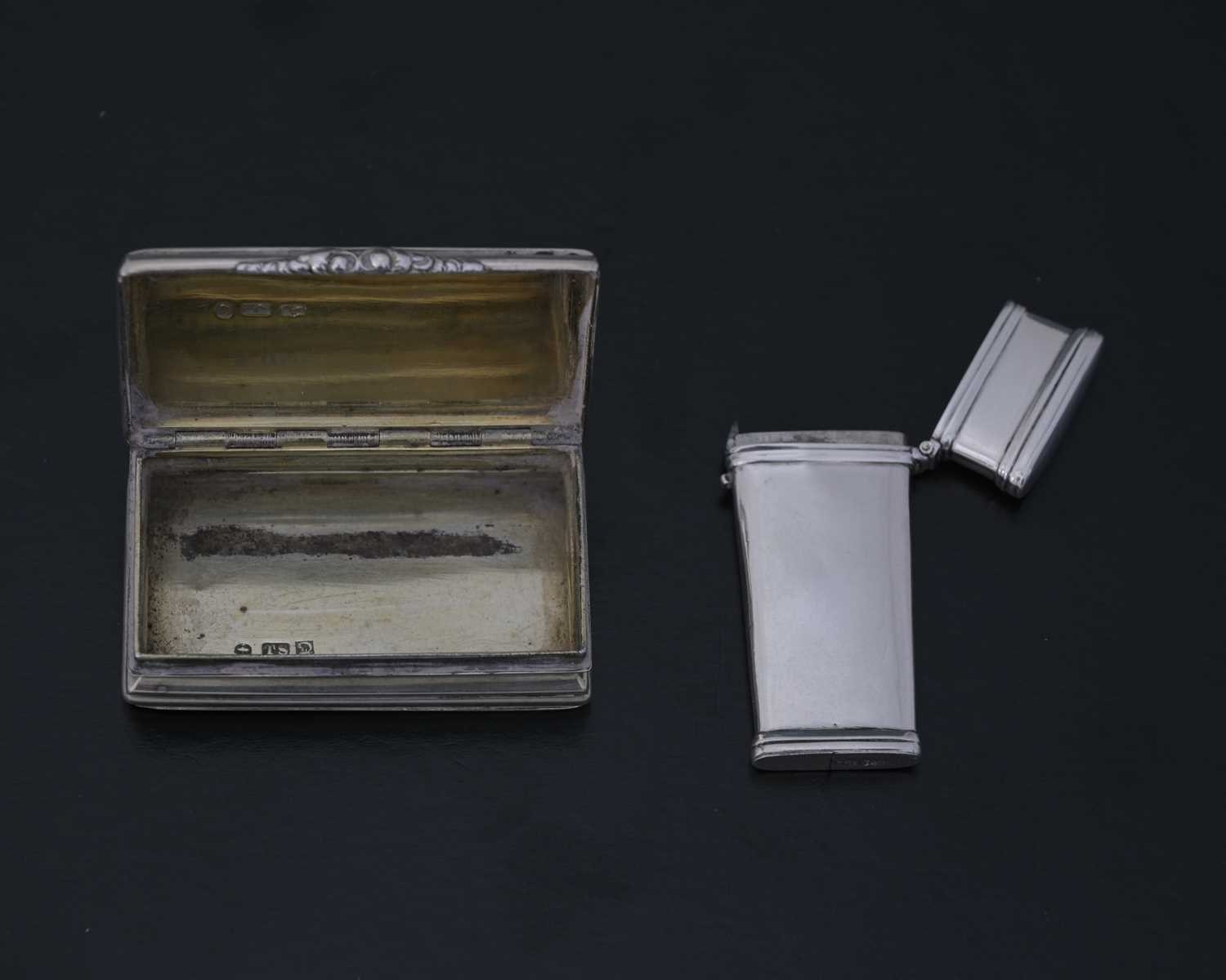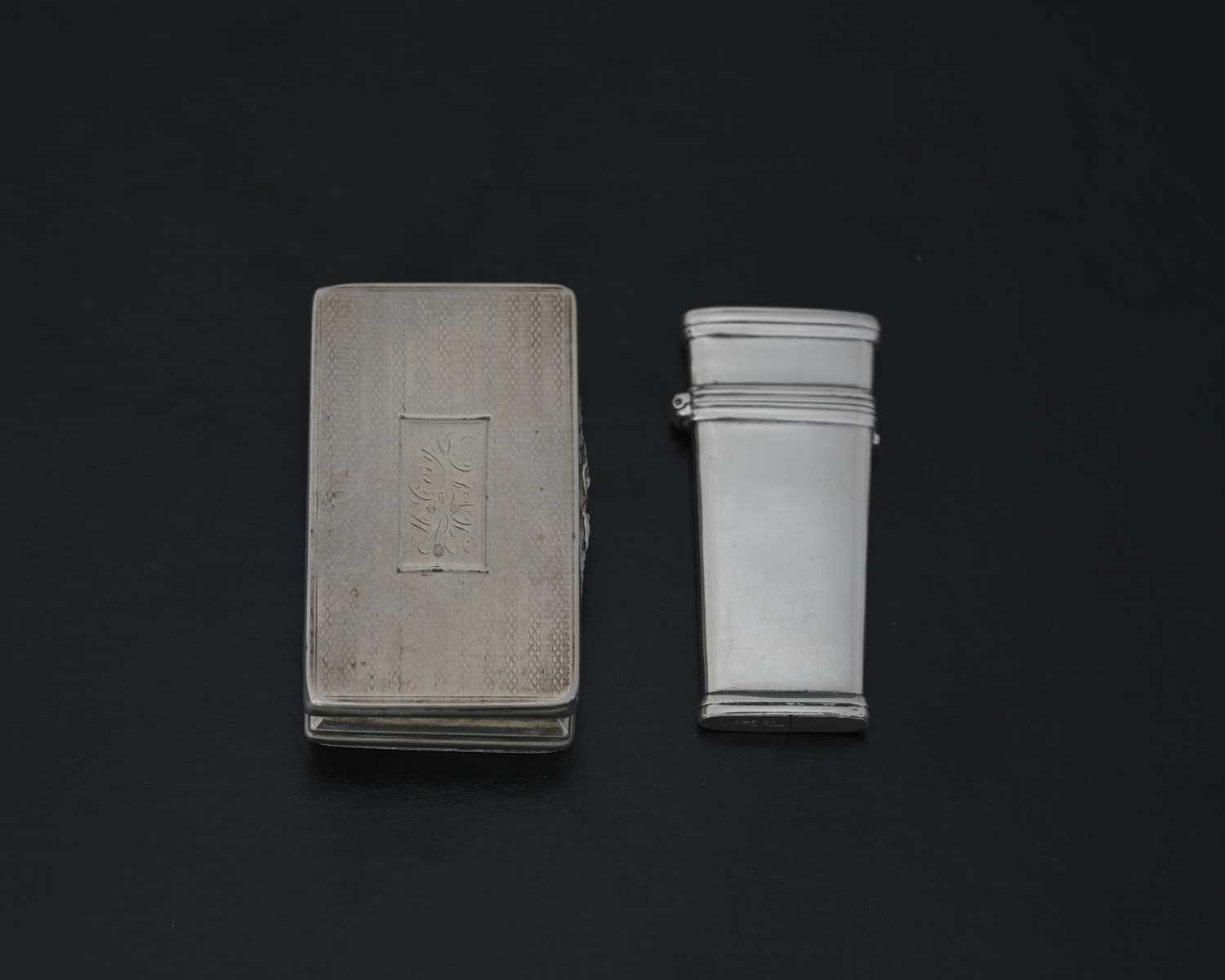 A George IV silver snuff box, by Thomas Shaw, Birmingham 1827, of rectangular form, decorated with engine-turning, length 6.6cm, together with a nineteenth-century lancet case (without lancets), circa 1800-20, combined weight 85g/2.73ozt approx (2)