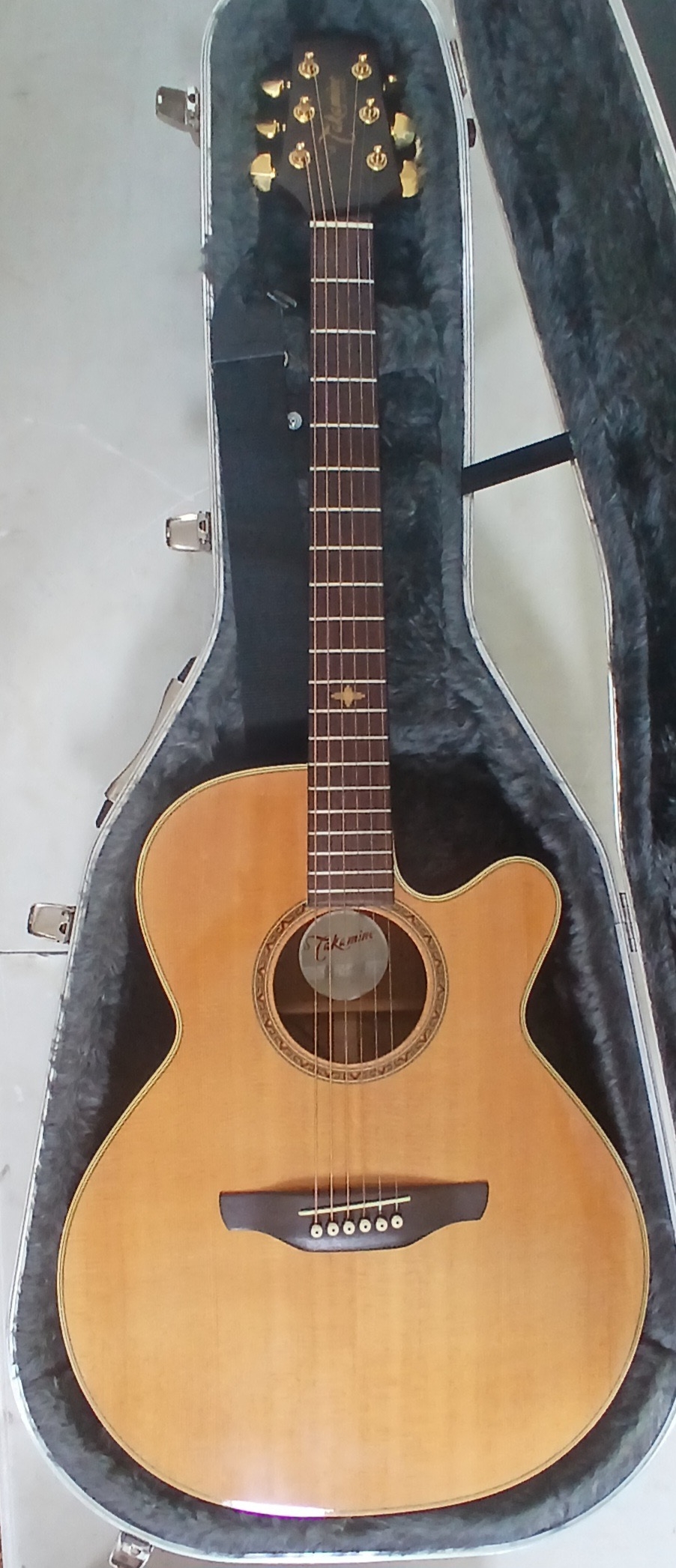 A Takamine G Series ESG-45SC steel strung acoustic guitar with electric pick up and hard case.