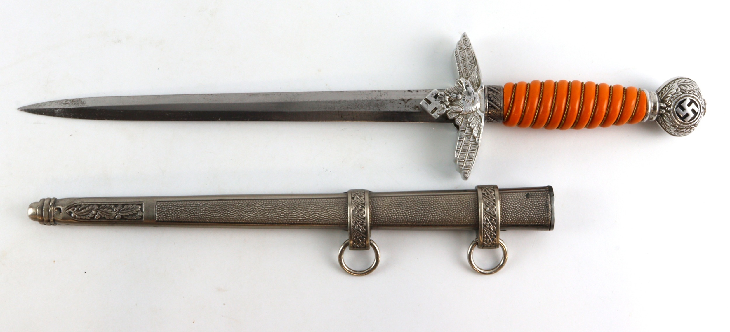 German Luftwaffe 2nd pattern Officers dagger, complete with scabbard. Blade marked 'Solingen 1939' and 'Germany'.