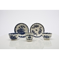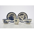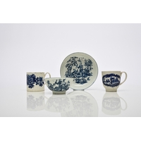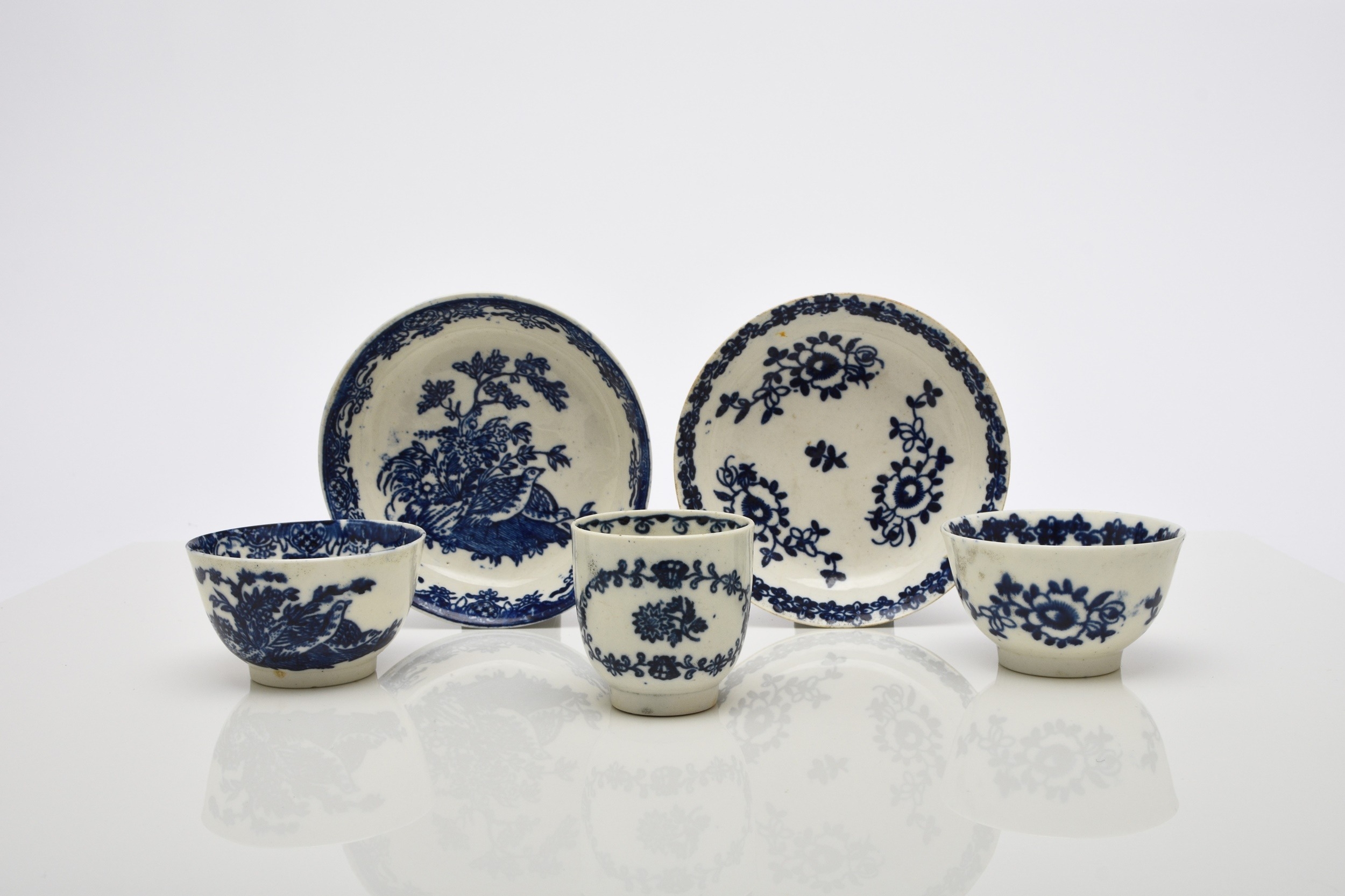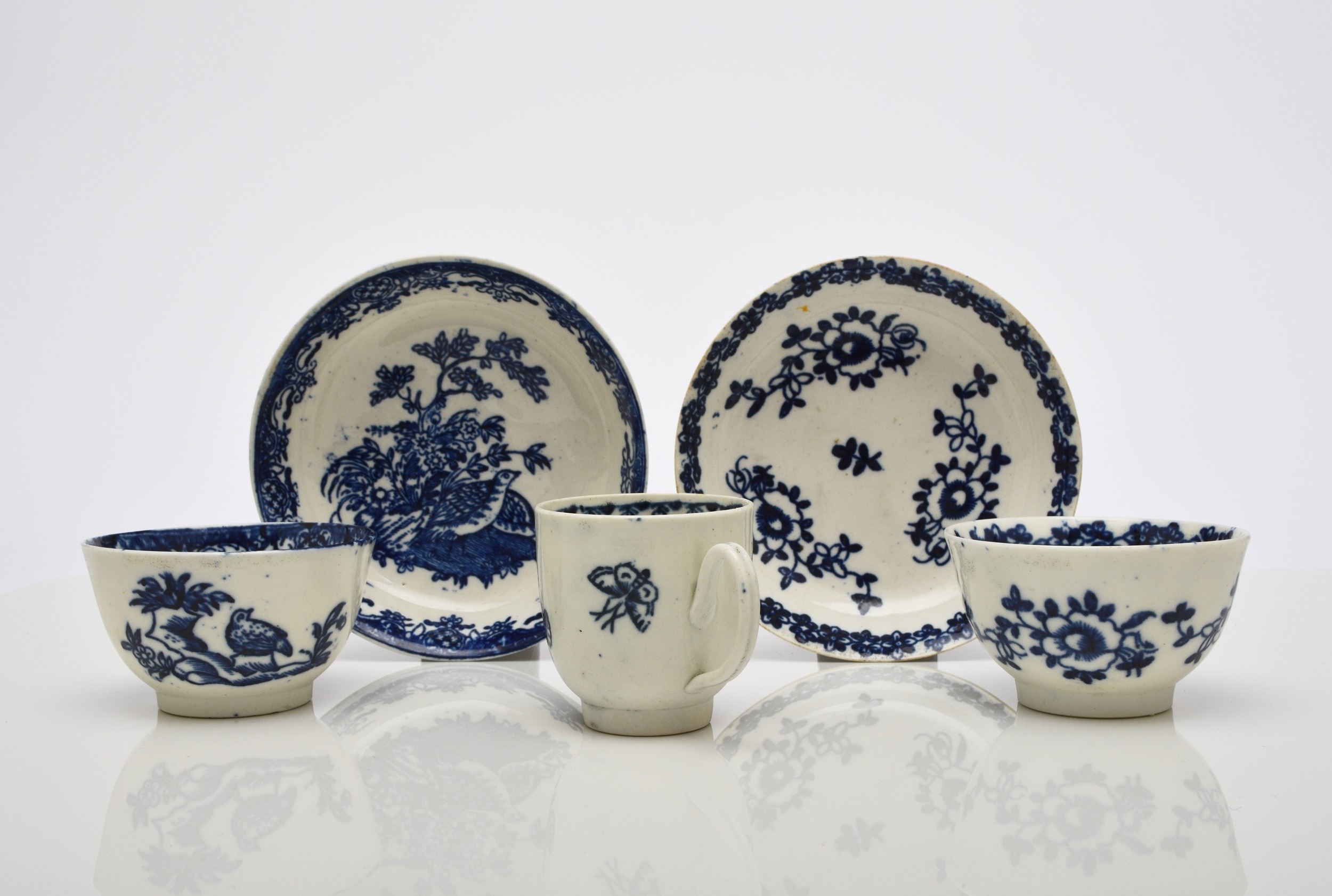 A small group of Liverpool porcelain, comprising a Seth Pennington and John Part 'Profile Bud' tea bowl and saucer, circa 1780-90, transfer-printed in underglaze blue, saucer 13cm diameter; together with a John and Jane Pennington 'Scallop Shell and Flower' coffee cup, circa 1780-85, transfer-printed in underglaze blue and a Seth Pennington and John Part 'Two Quail' tea bowl and saucer, circa 1780-90, transfer-printed in underglaze blue, saucer 13cm diameter (5) Condition:Profile Bud tea bowl and saucer - Hairline to saucer, which is also relatively scratched and has some tiny fleabites to rim. Tea bowl in good condition. Coffee cup - good condition, no damages or repairs. Two Quail - good condition with no damages or repairs.