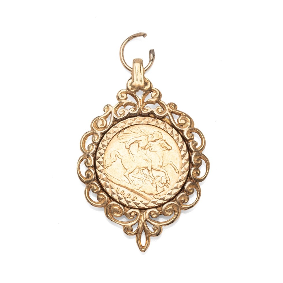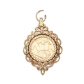 An Edward VII half sovereign, 1903, in 9ct gold rococo scroll pendant mount, total weight 8.6g.