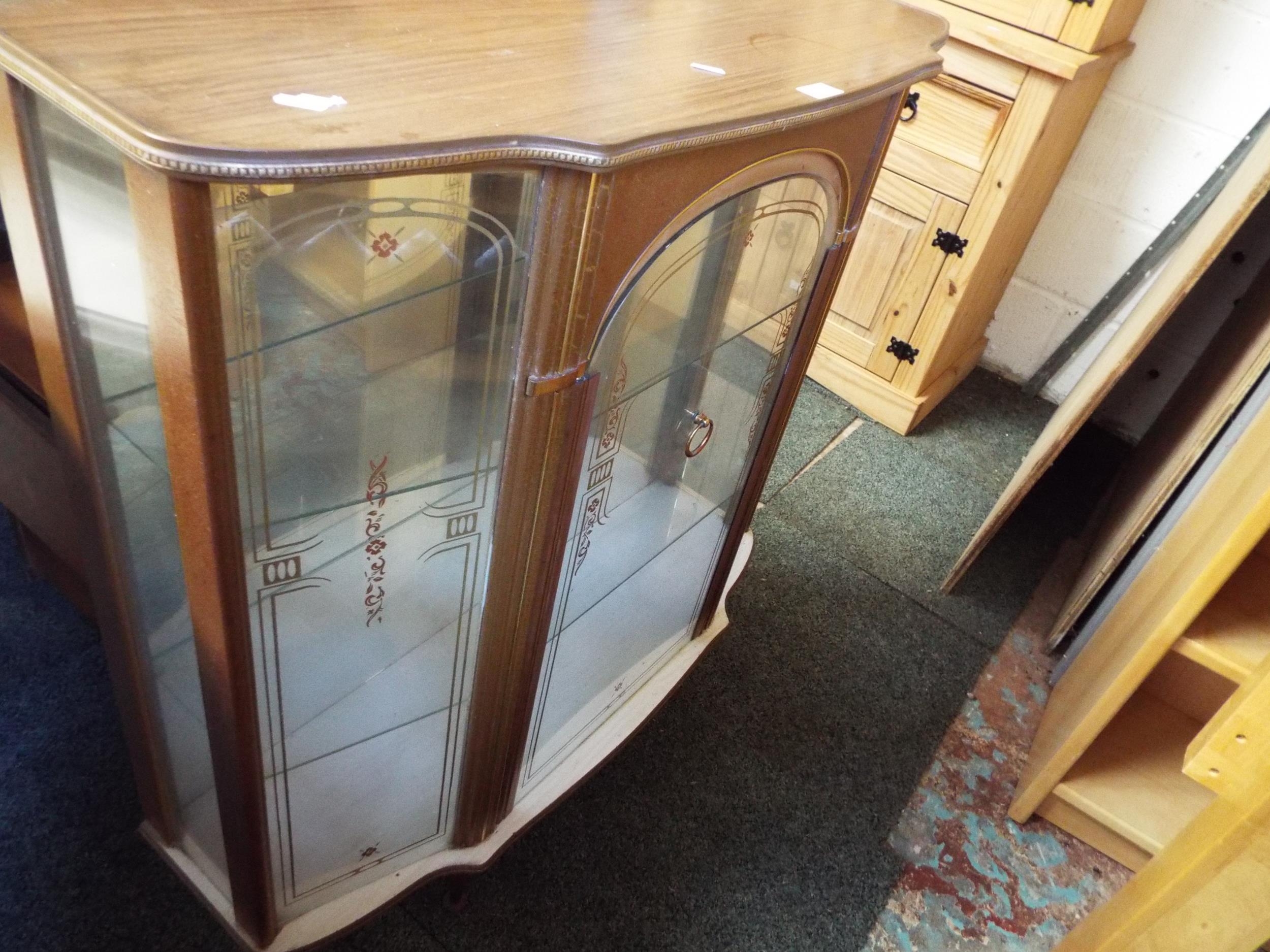 A 1950's/60's glass display cabinet with gilt painted panels and two glass shelves