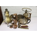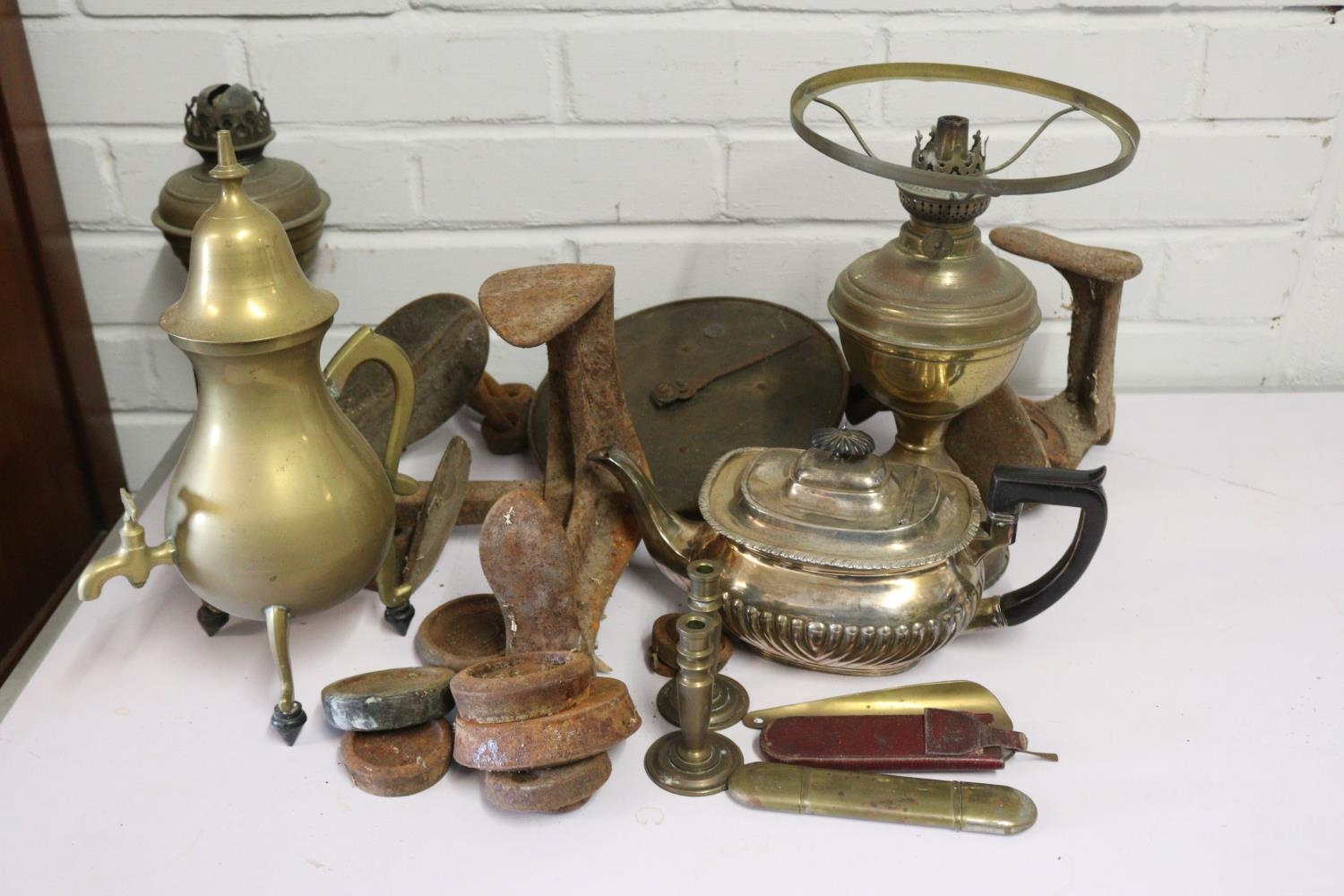 Selection of metalware to include scales, oil lamps, shoe lasts etc