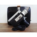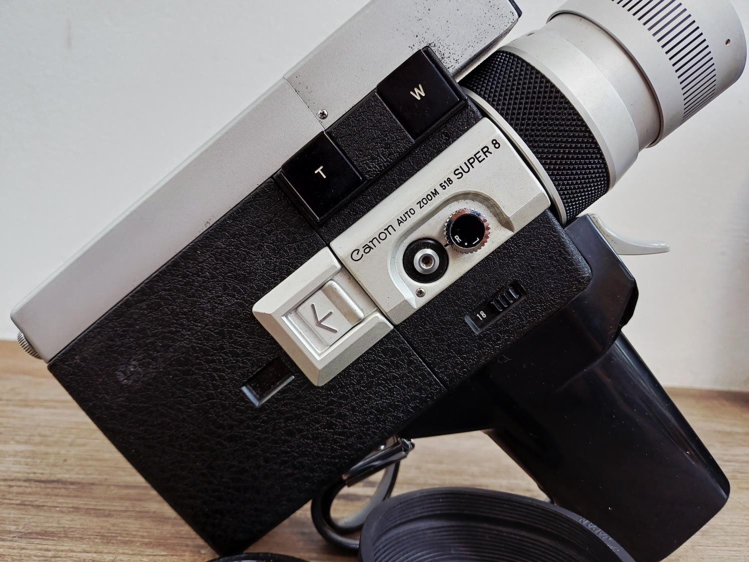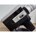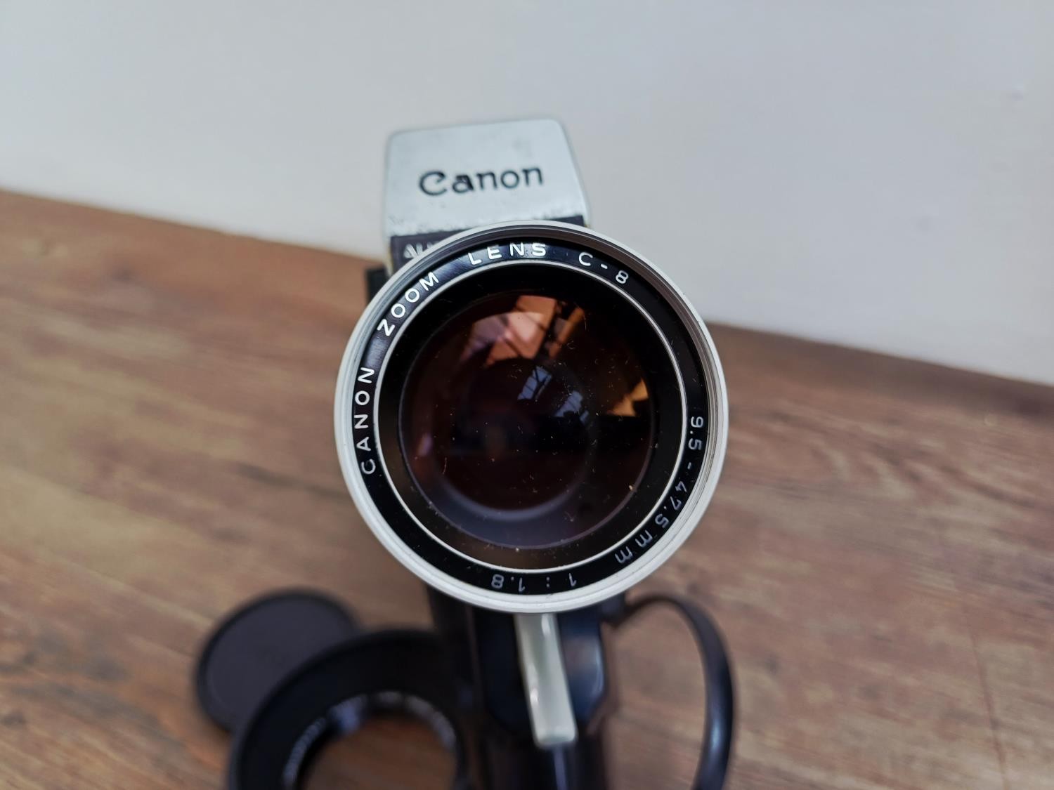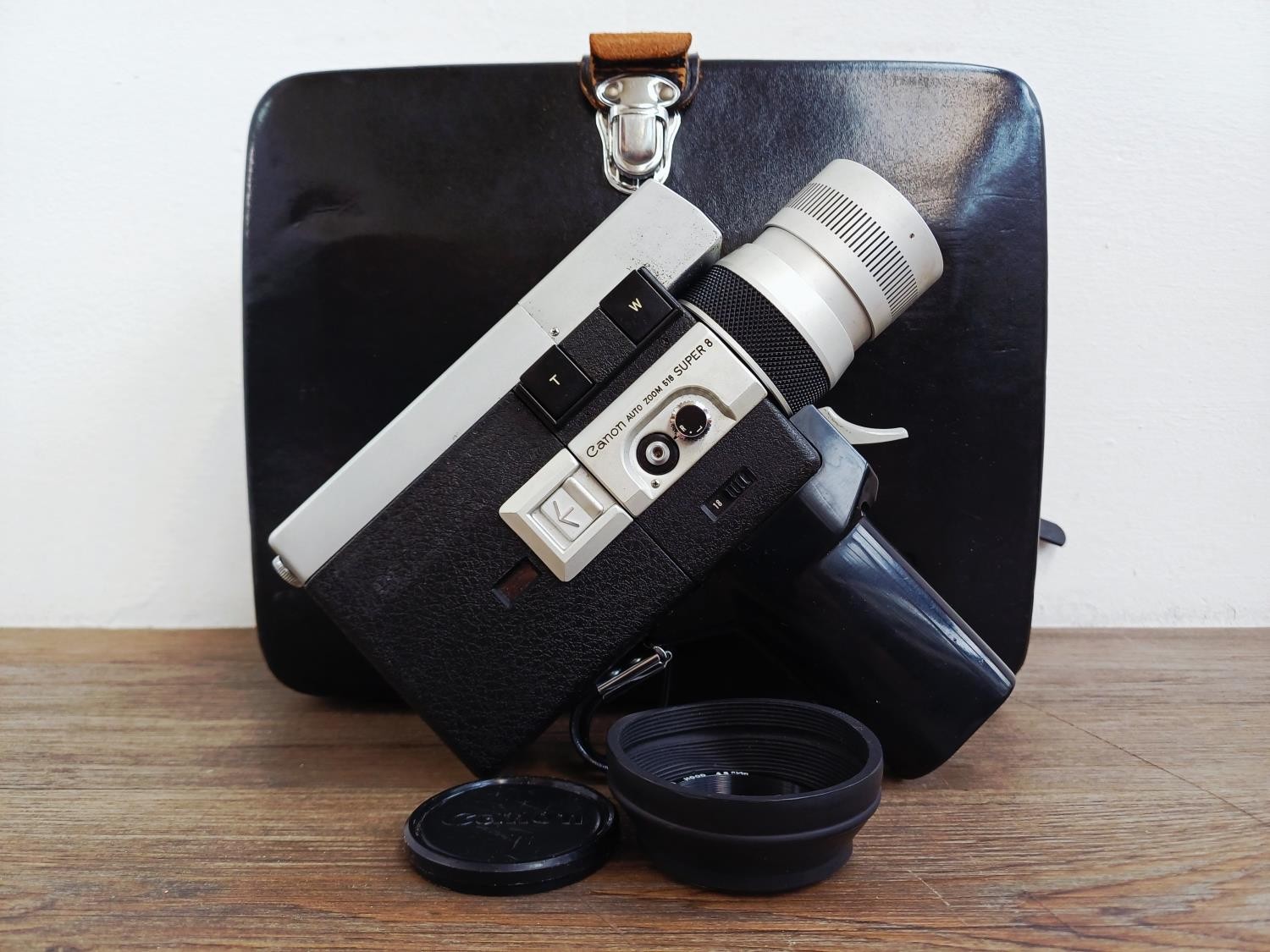 A cased Canon Auto Zoom 518 Super8 cine camera fitted with C-8 1:1.8 9.5-47.5mm zoom lens with cap and shade