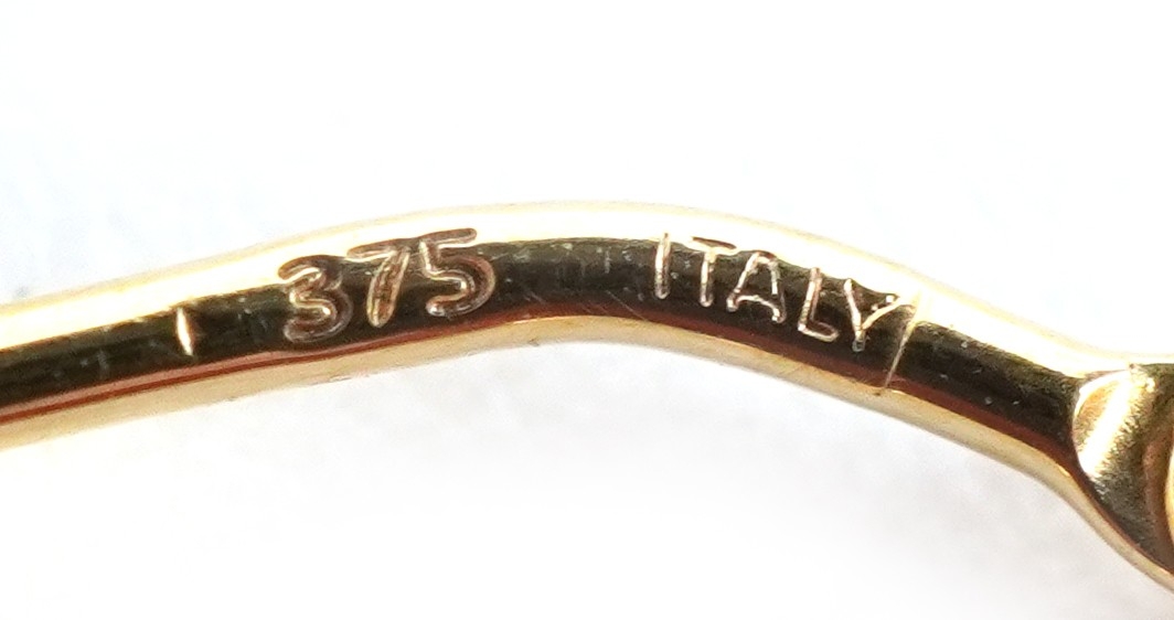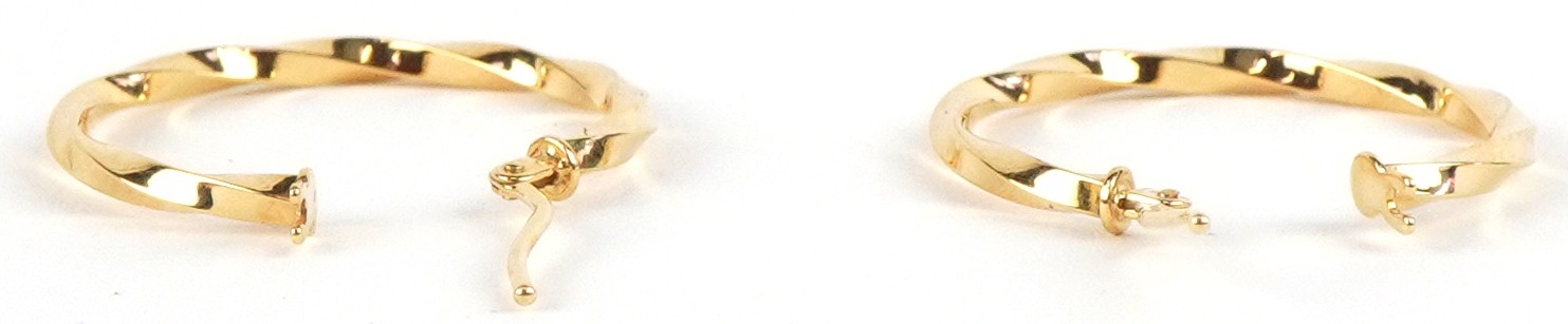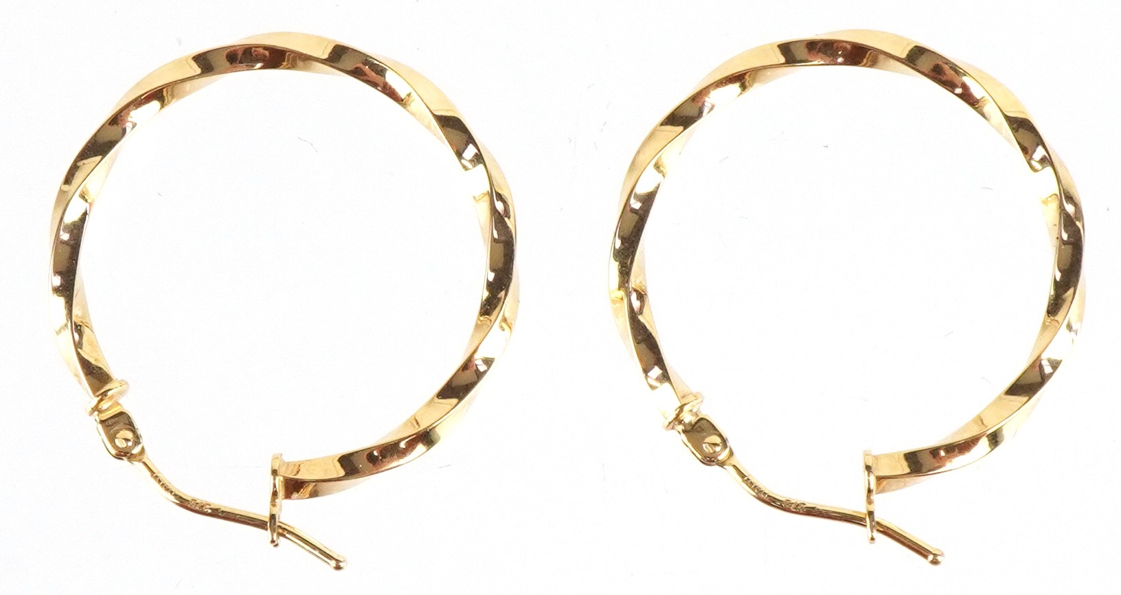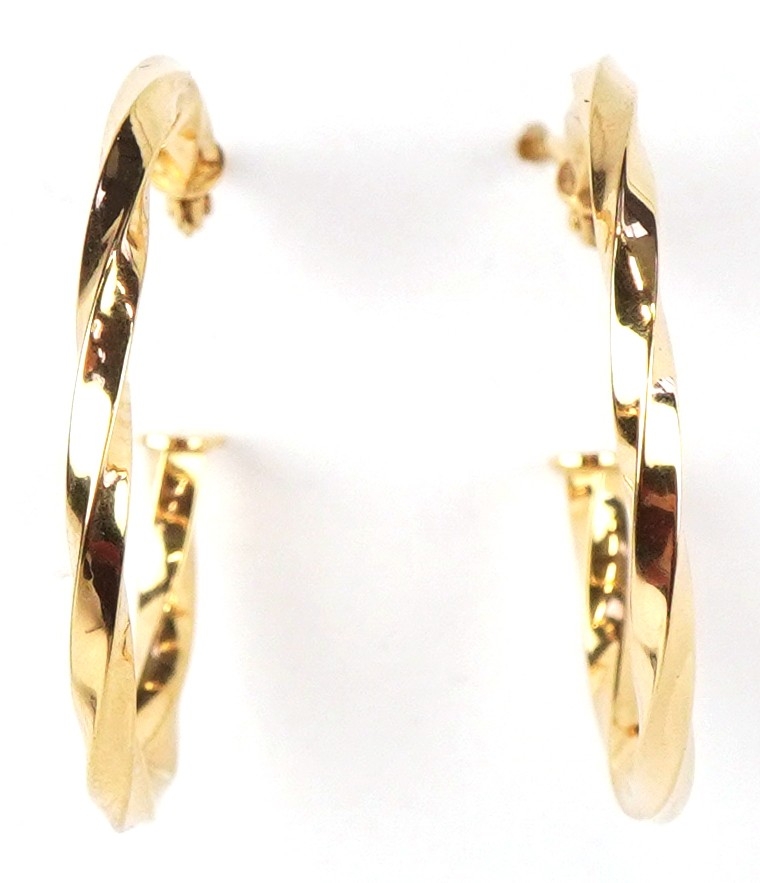 A pair of as new 9ct gold twisted hoop earrings retailed by Goldsmiths, with box, 2.3cm in diameter, total 1.0g.