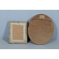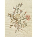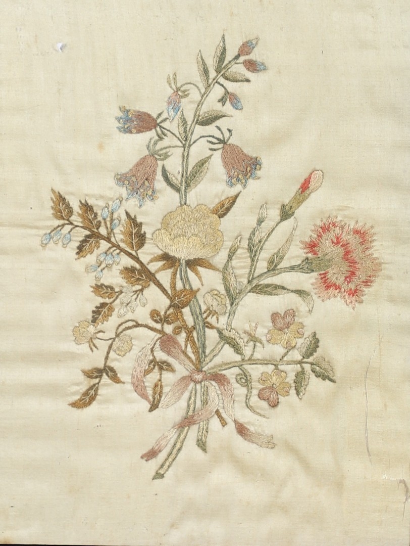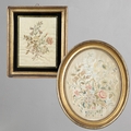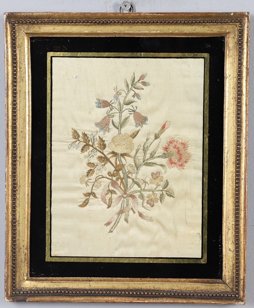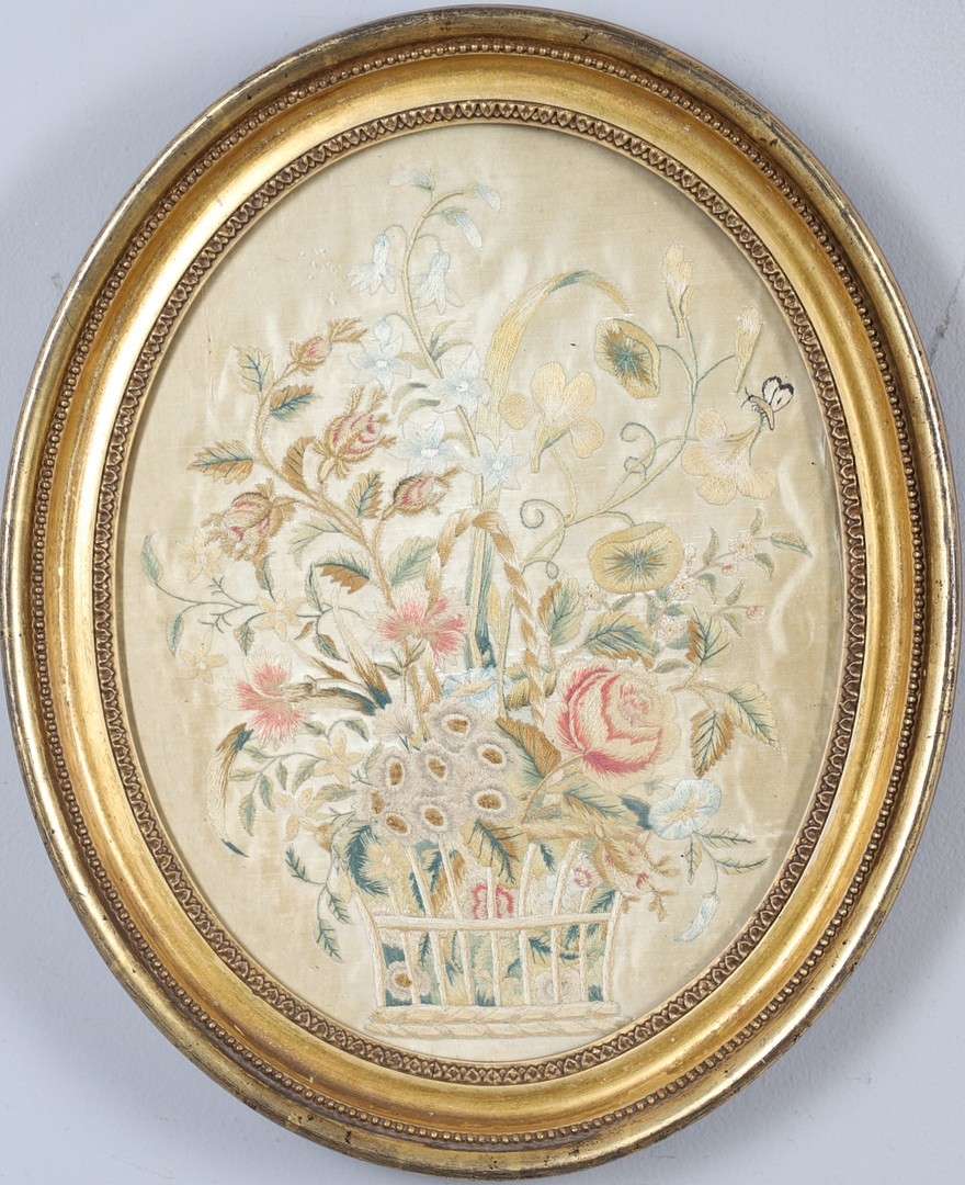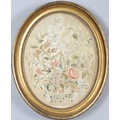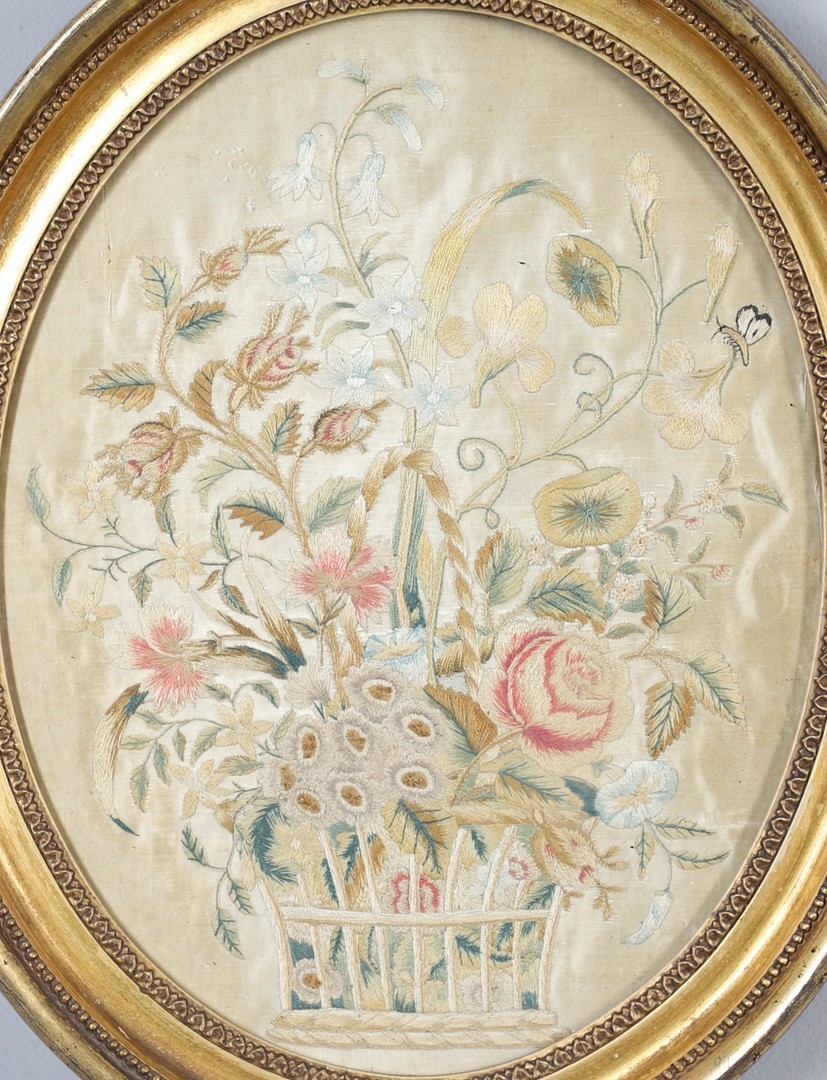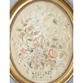 A REGENCY OVAL SILKWORK FLORAL PICTURE. depicting a basket of flowers within a gilded frame, 39cm x 32cm, and a smaller silkwork of a hand-tied bunch of flowers, within a verre eglomise and gilded frame, 28.5cm x 24cm.