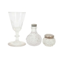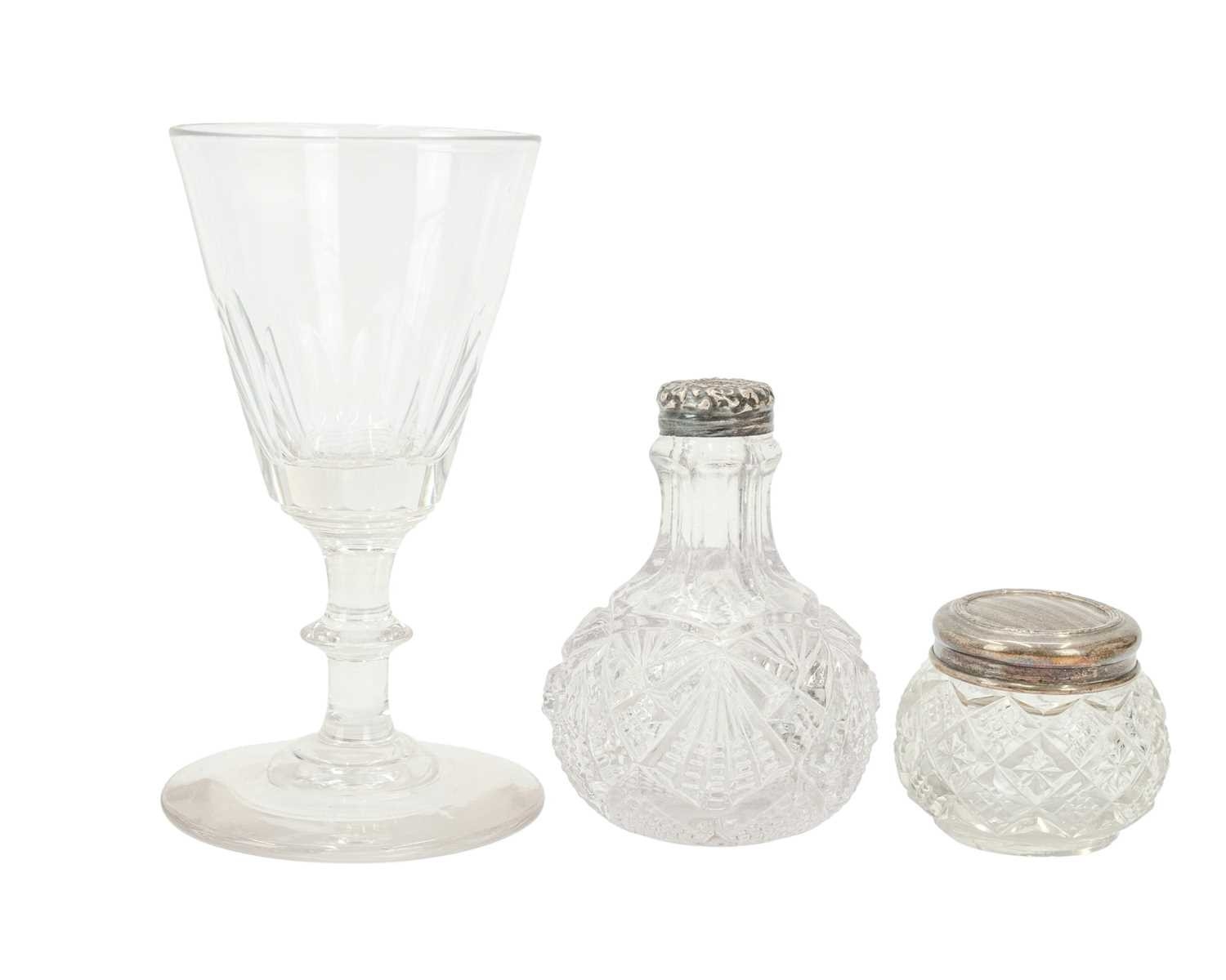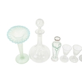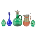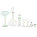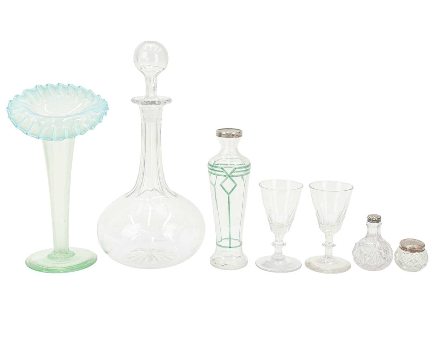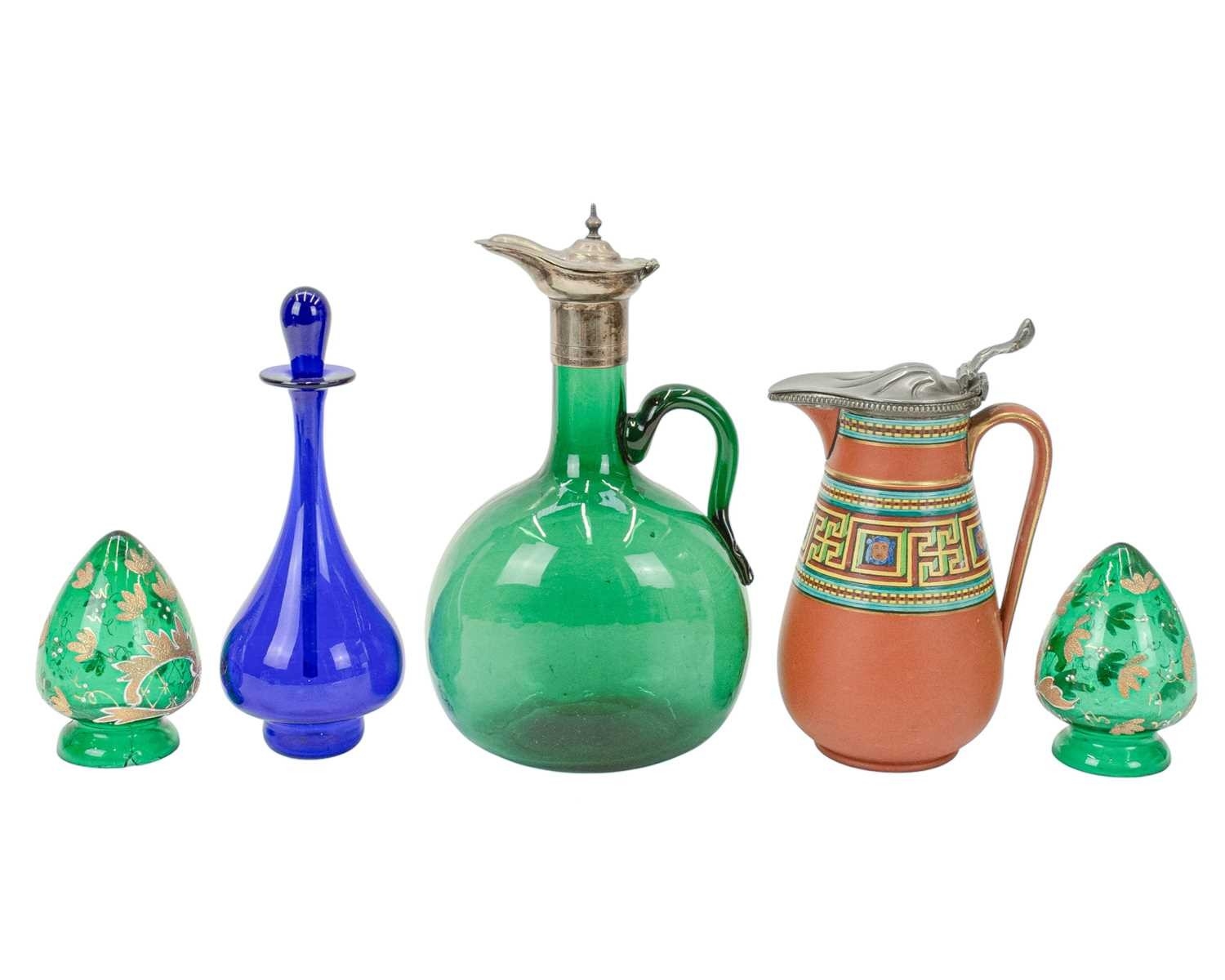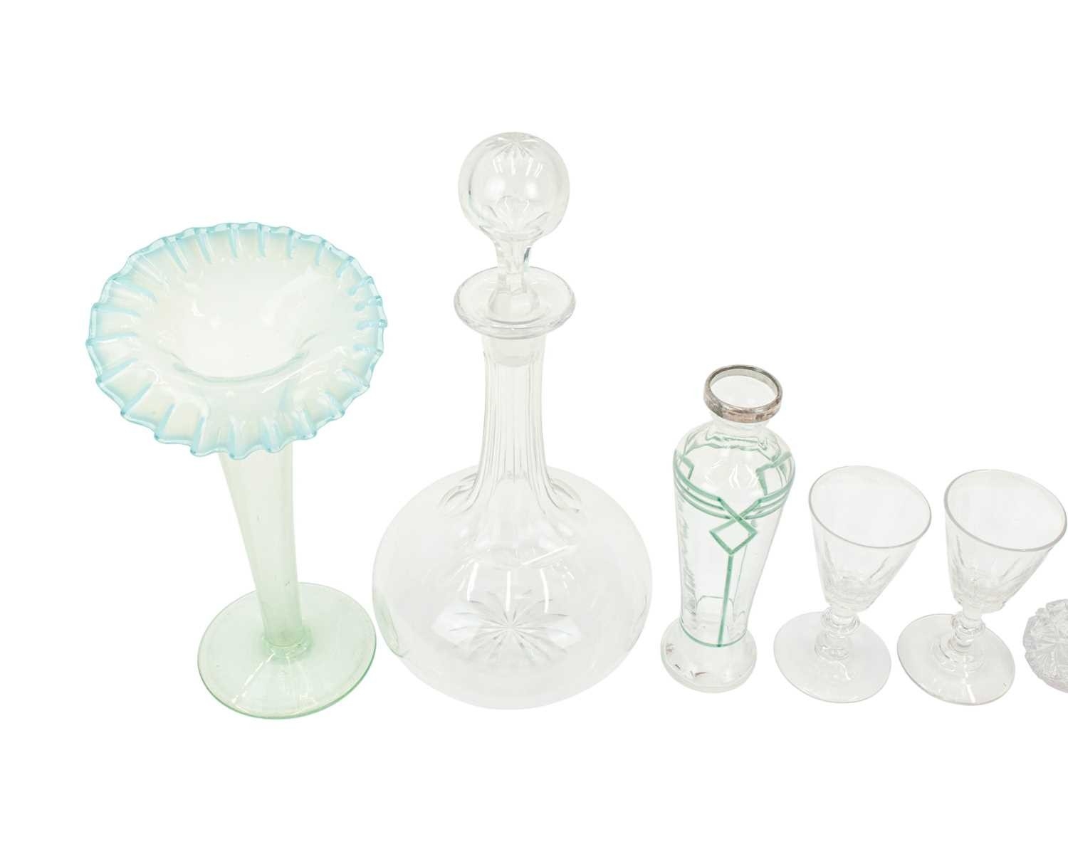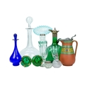 A Victorian opaline 'Jack in the Pulpit' vase. Green glass, leading to a milky blue frilled edge, height 23cm, with a Prattware jug decorated with faces and a greek key design, a green glass decanter, two green glass light shades and other glassware (12).