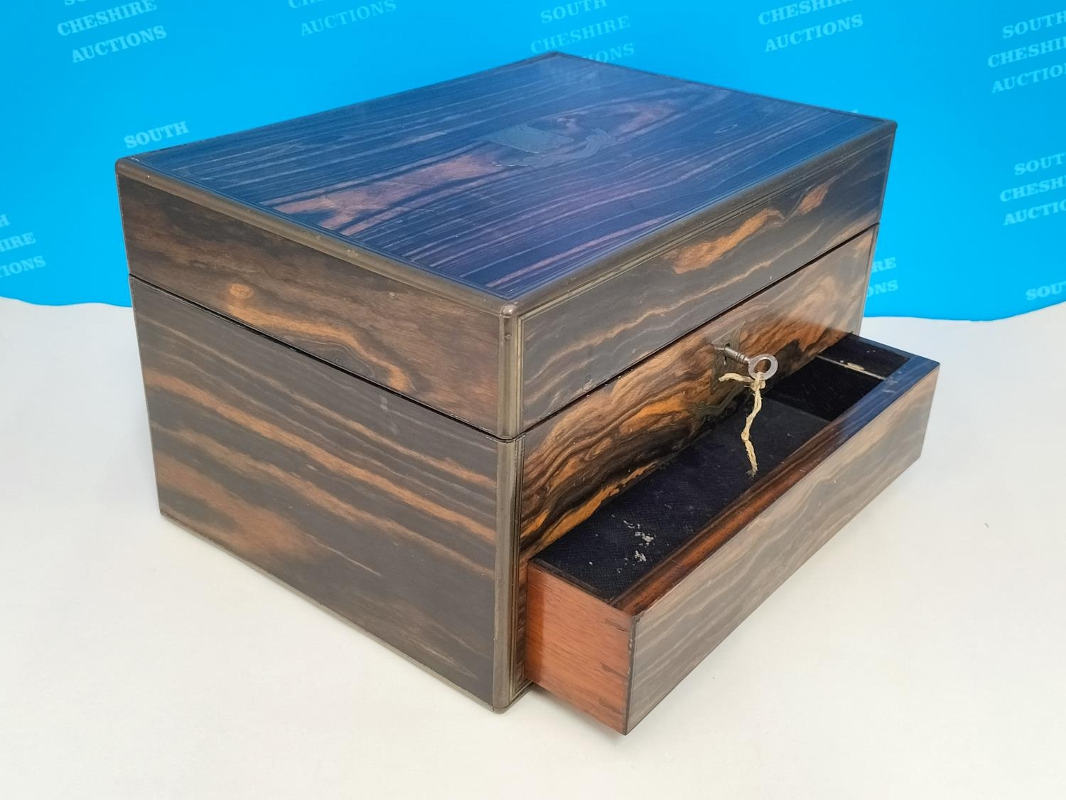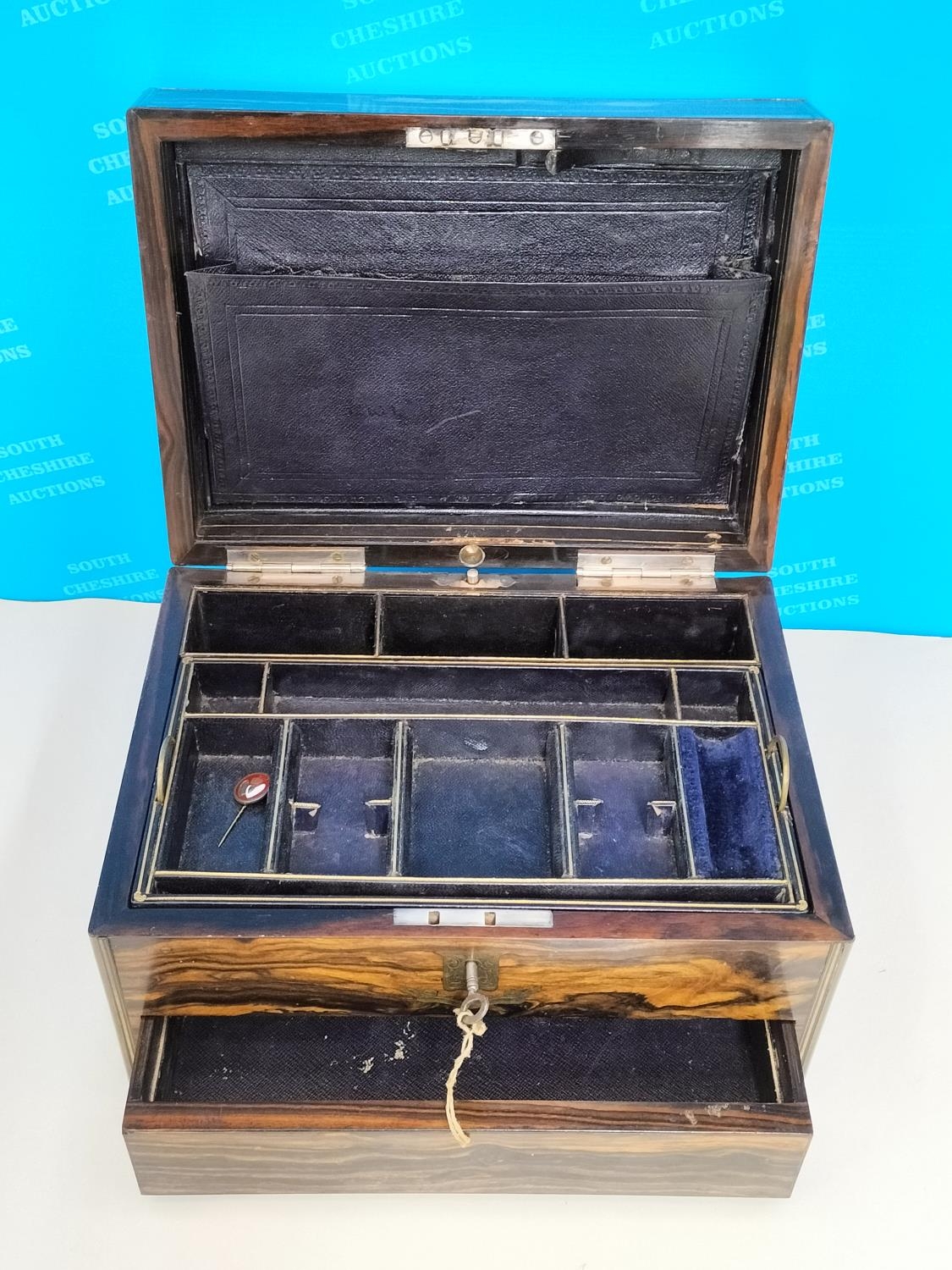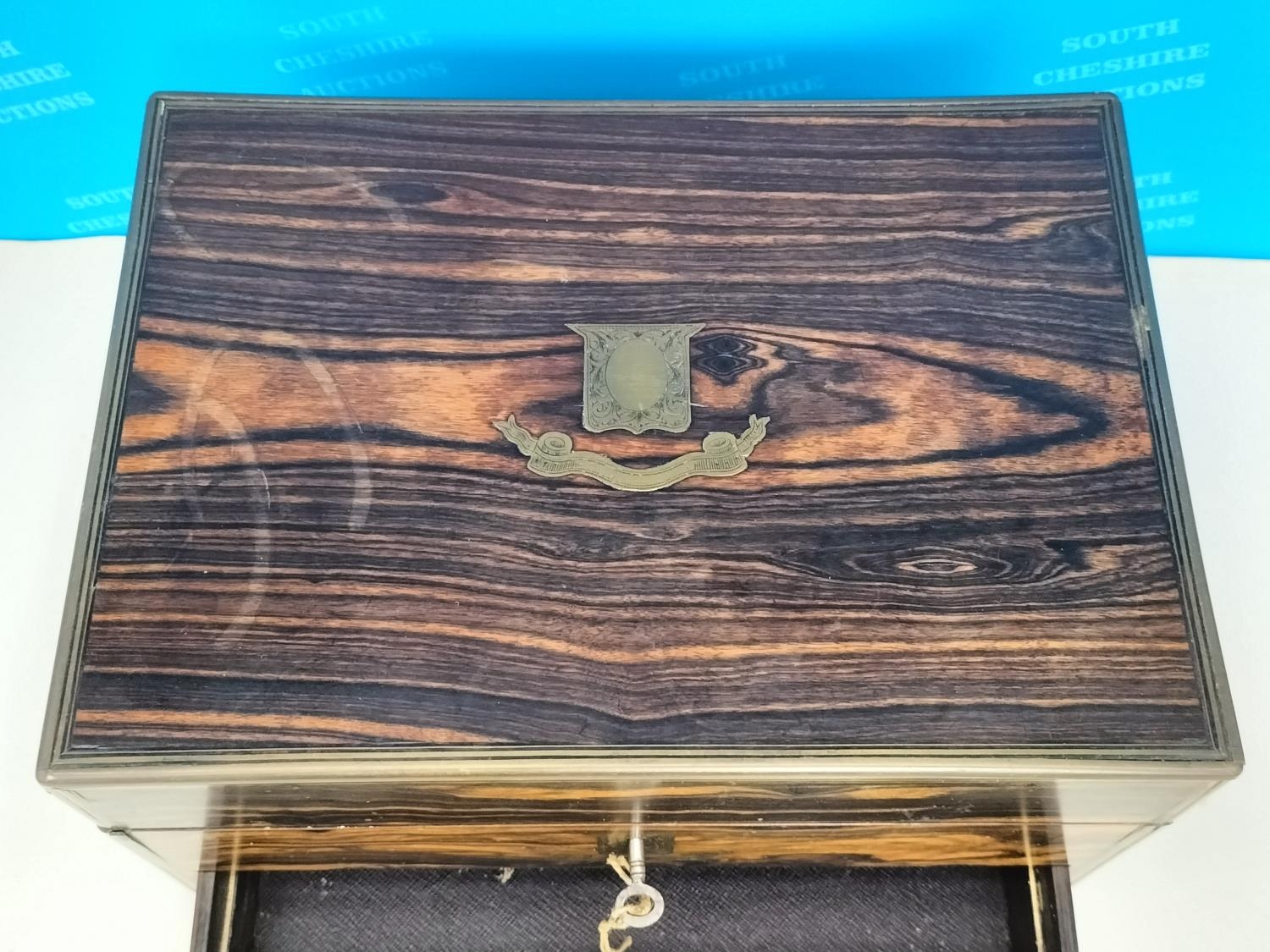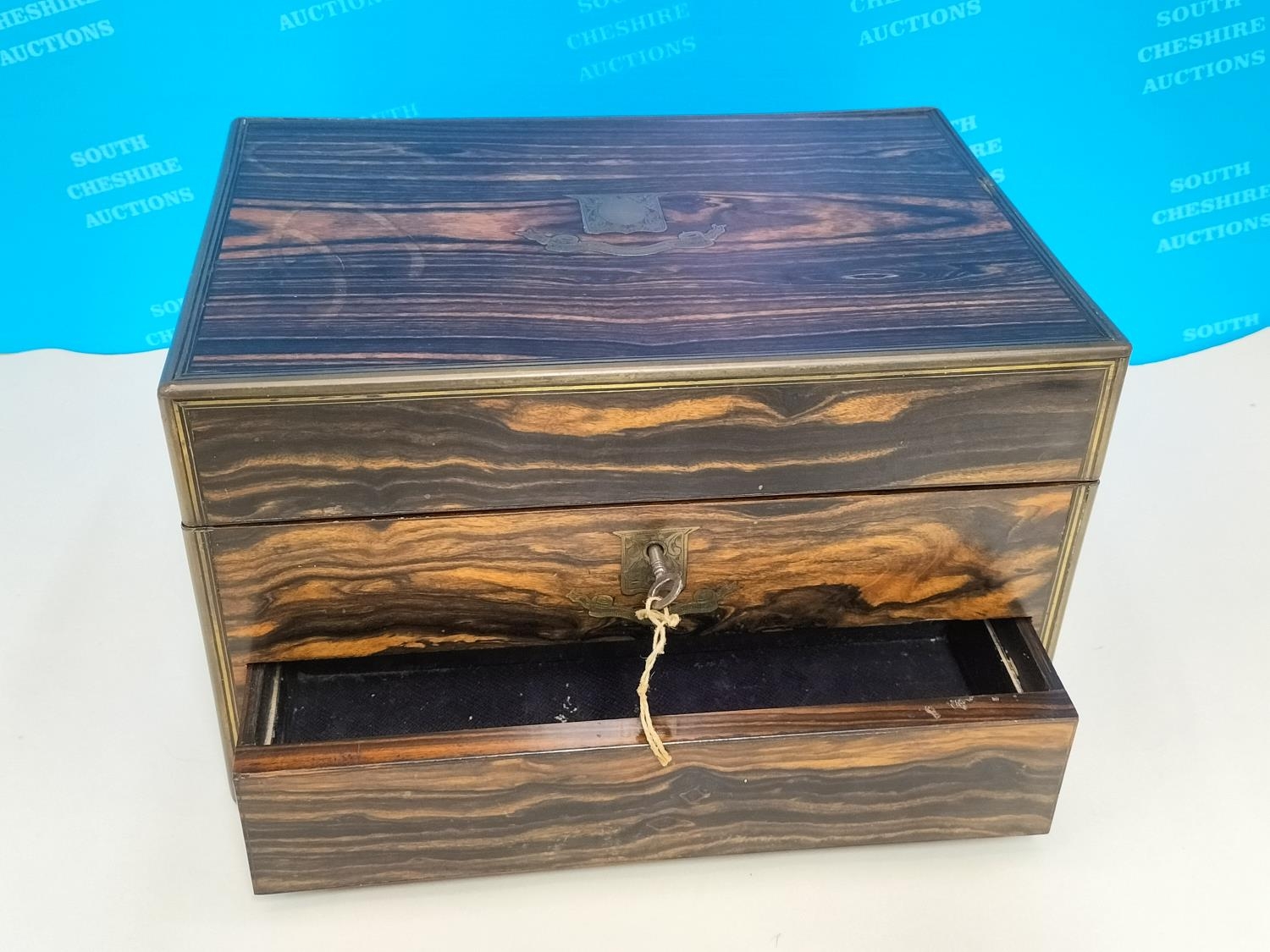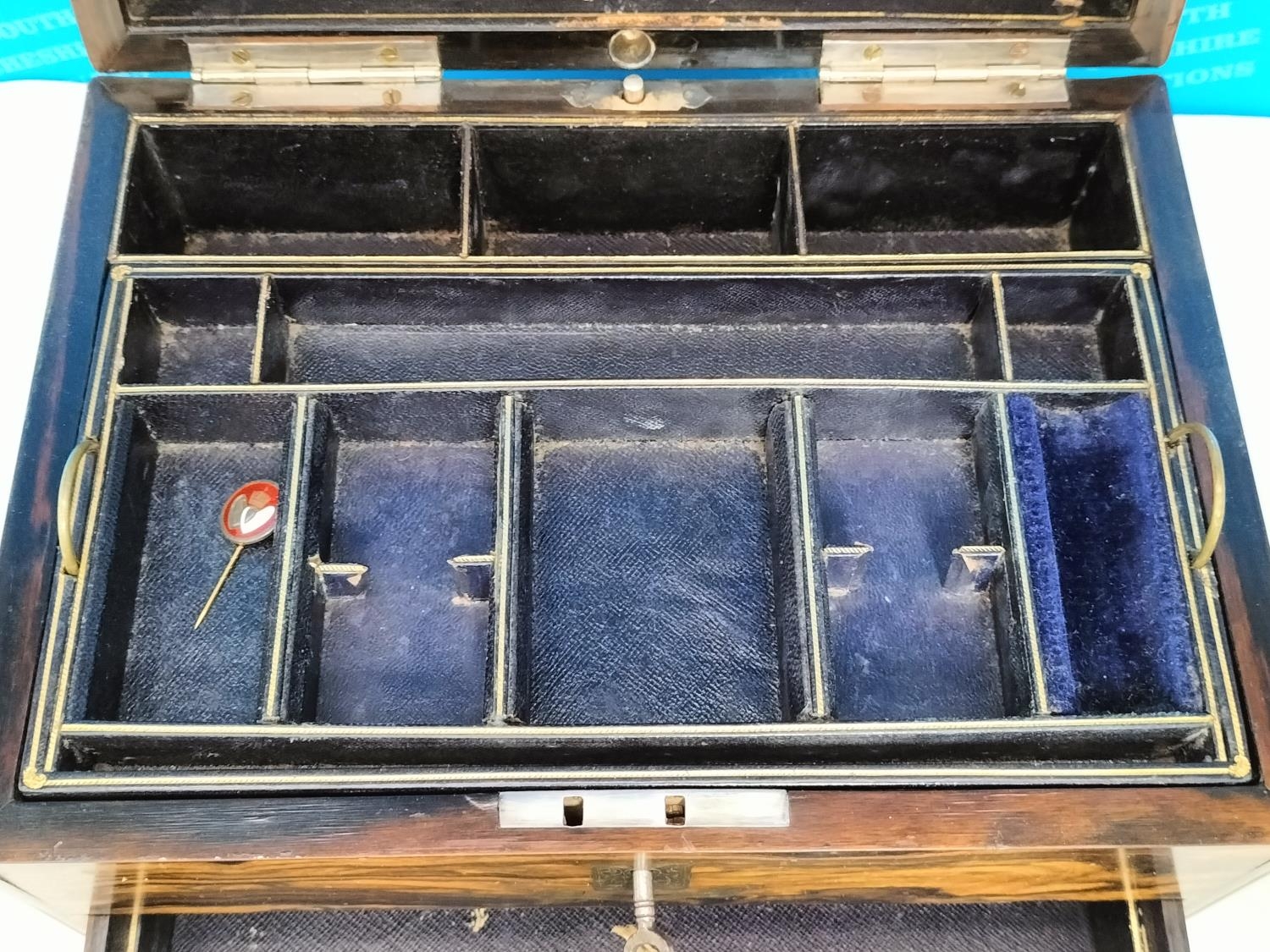 Early Victorian Gent's Rosewood Travelling Box with Key and Some Contents. Requires Attention to Clip That Holds the Drawer Closed. 16cm High, 28cm x 20cm.