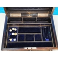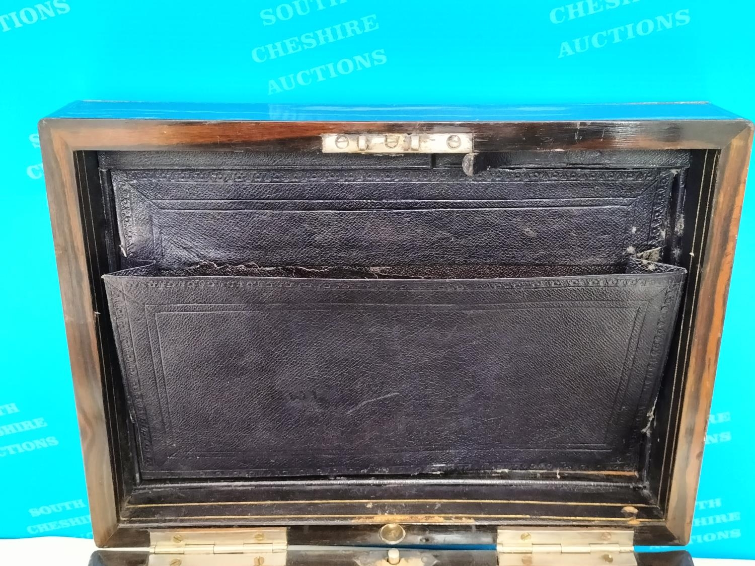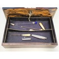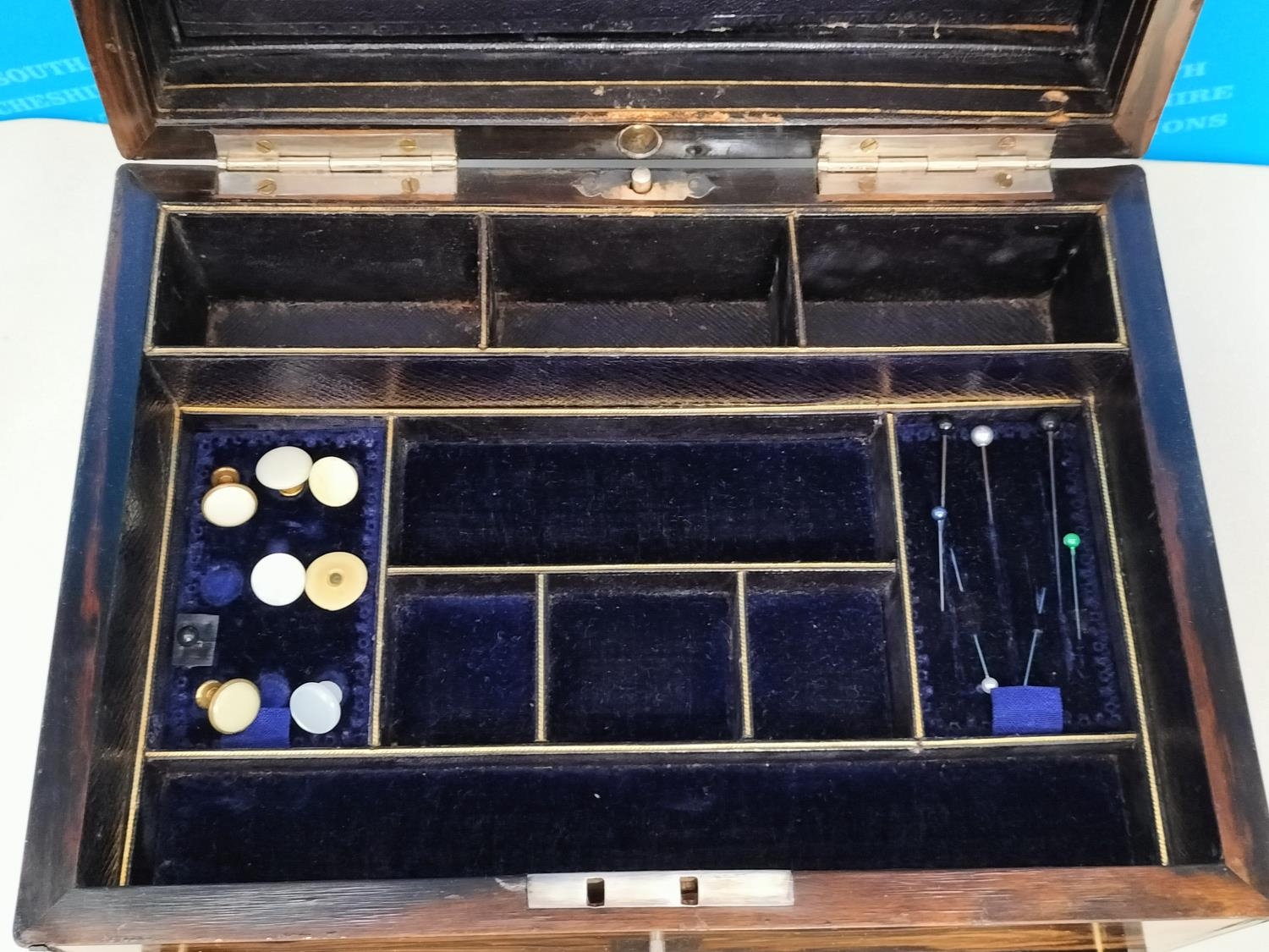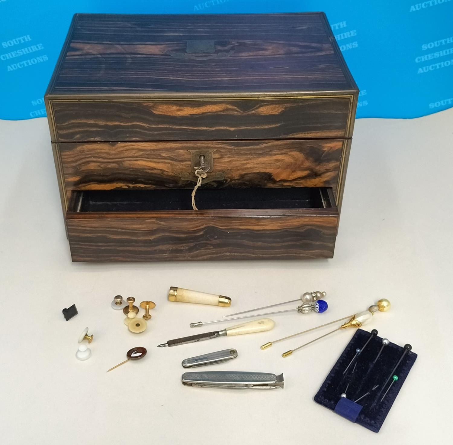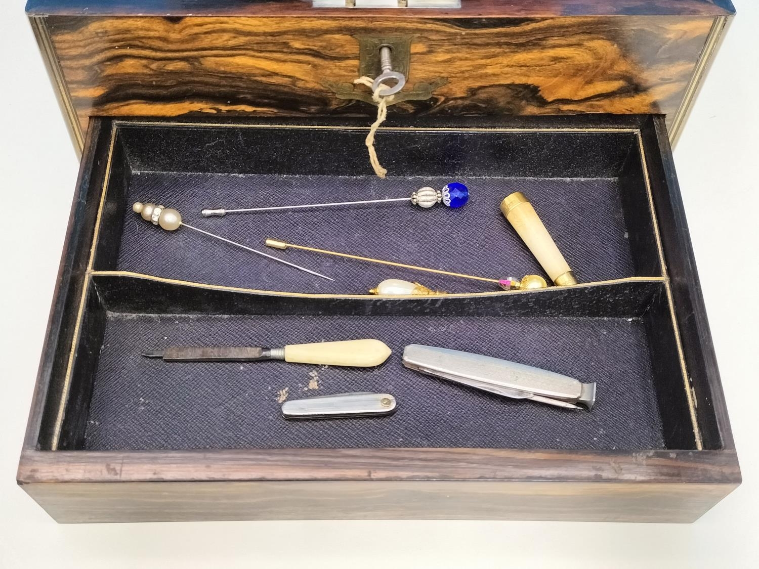 Early Victorian Gent's Rosewood Travelling Box with Key and Some Contents. Requires Attention to Clip That Holds the Drawer Closed. 16cm High, 28cm x 20cm.