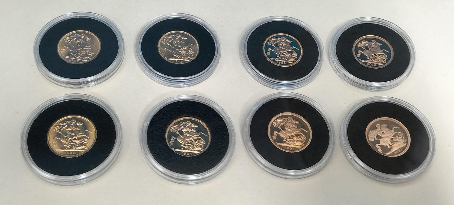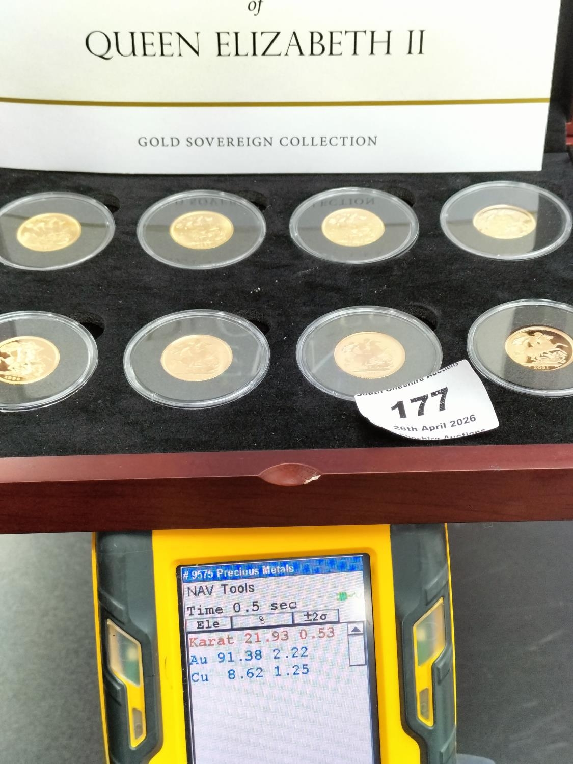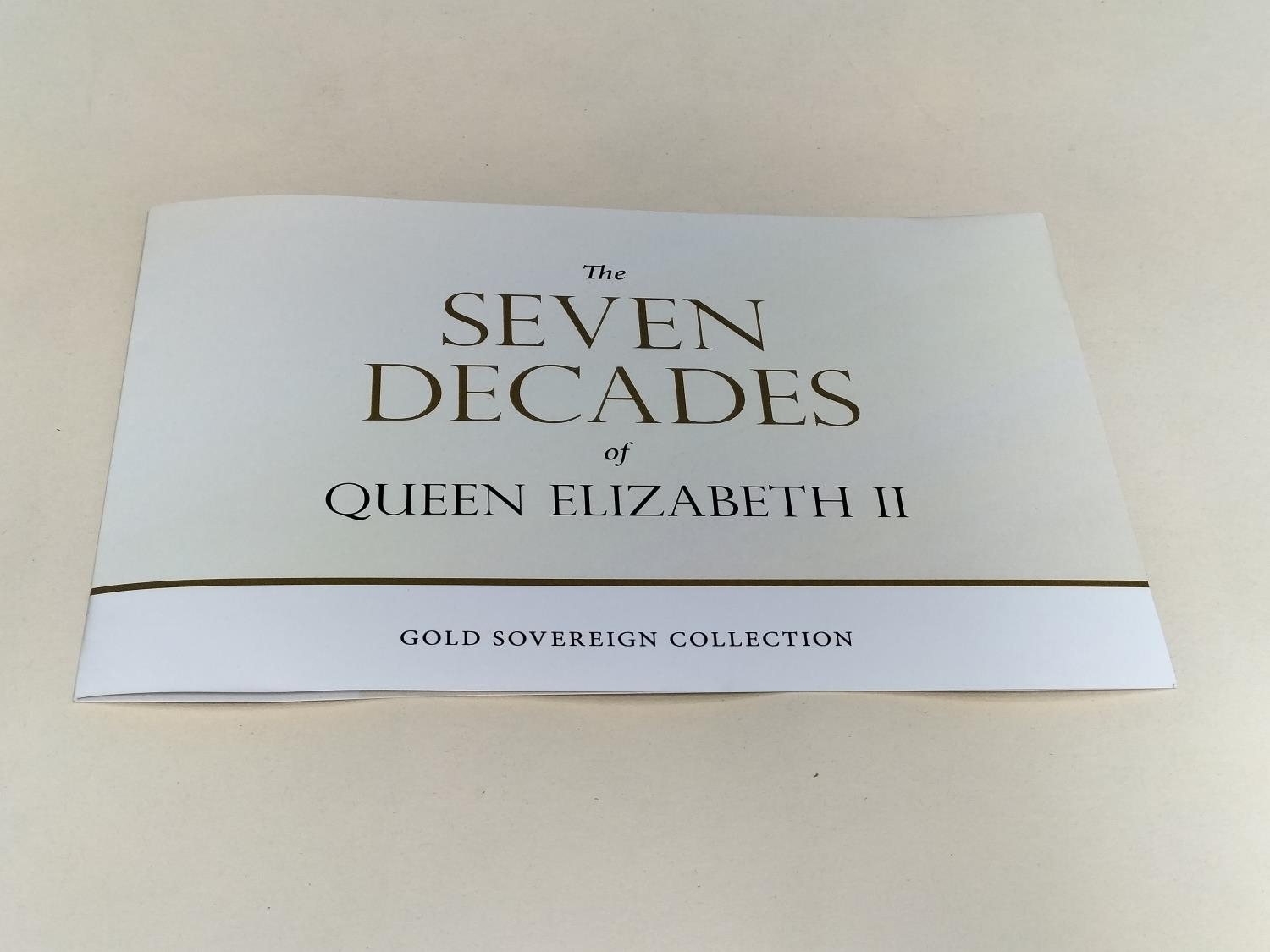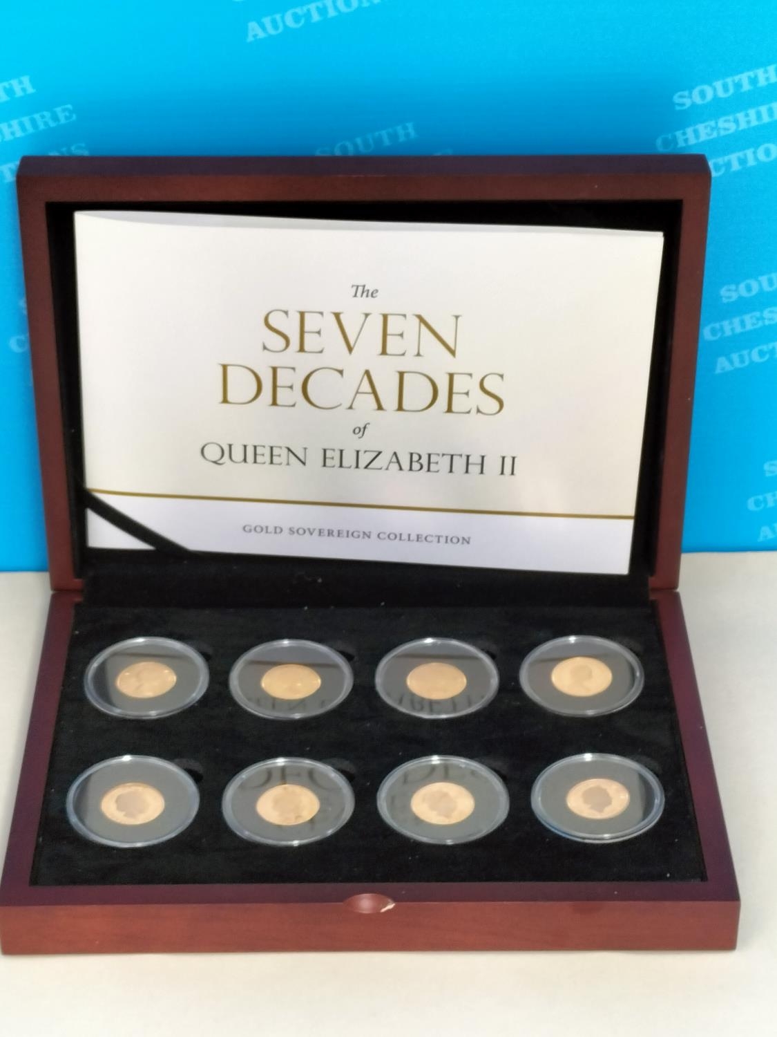 Westminster Collection Boxed Set of Eight Full 22ct Gold Sovereigns 'The Seven Decades of Elizabeth II'. Cased.