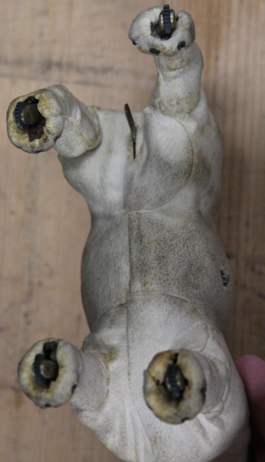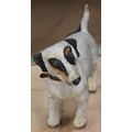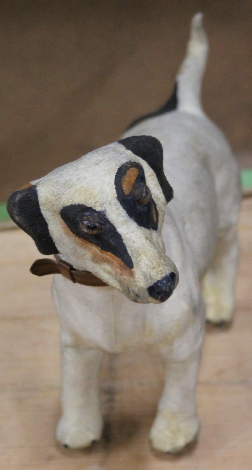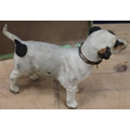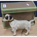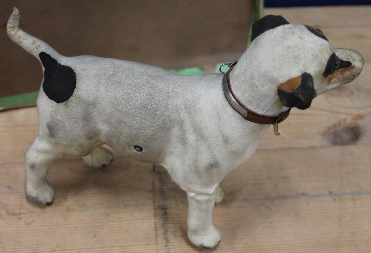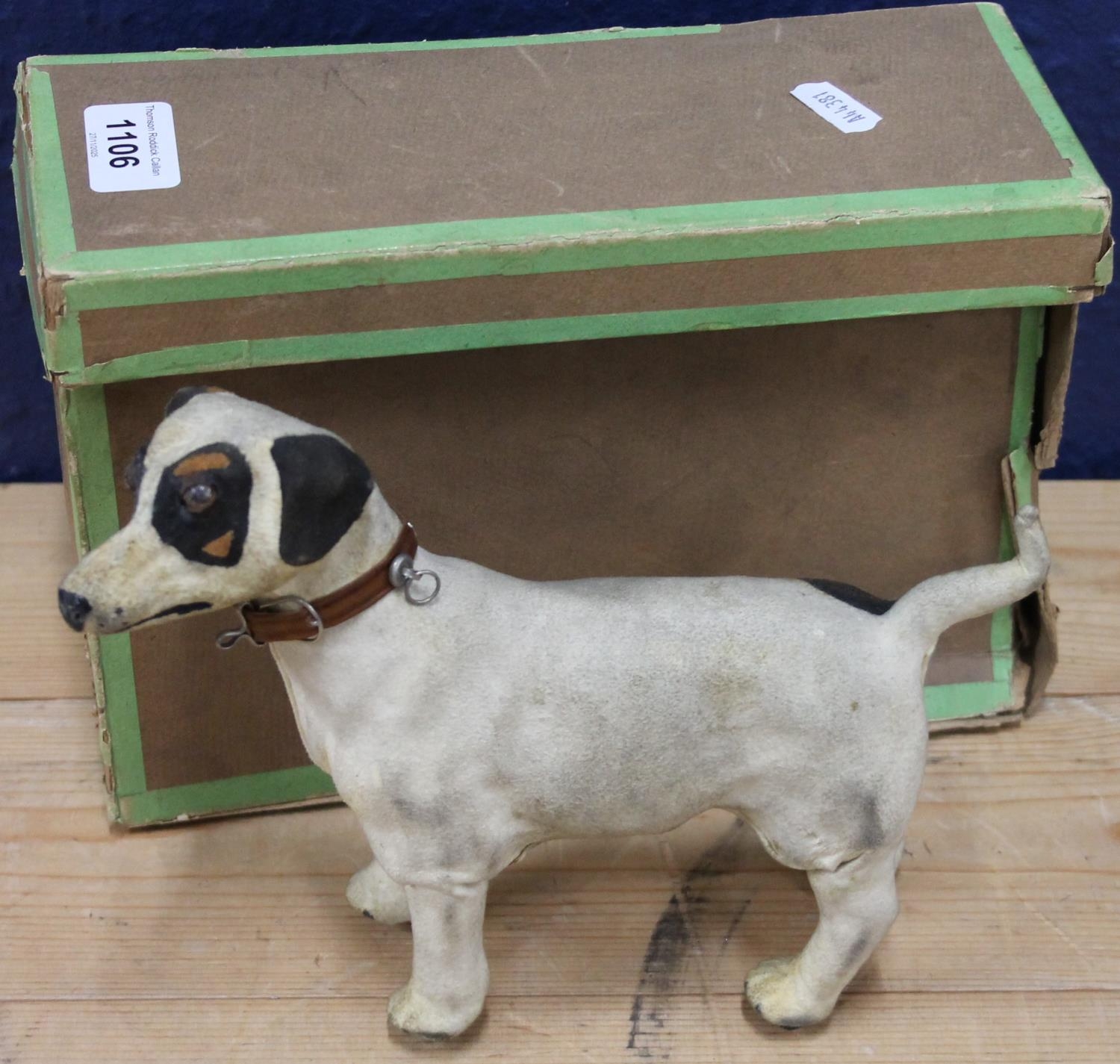 Antique clockwork automaton in the form of a Jack Russell dog, 18cm tall, held in cardboard box with Schwarz Toys of New York label.