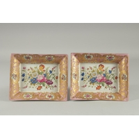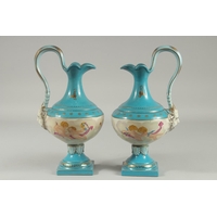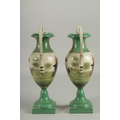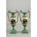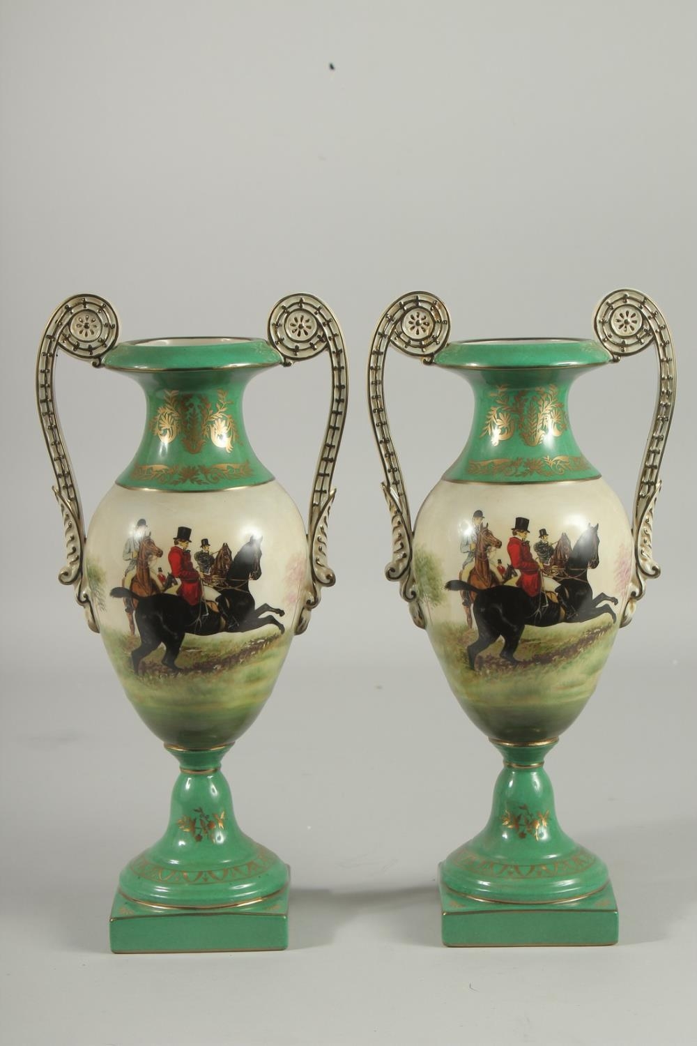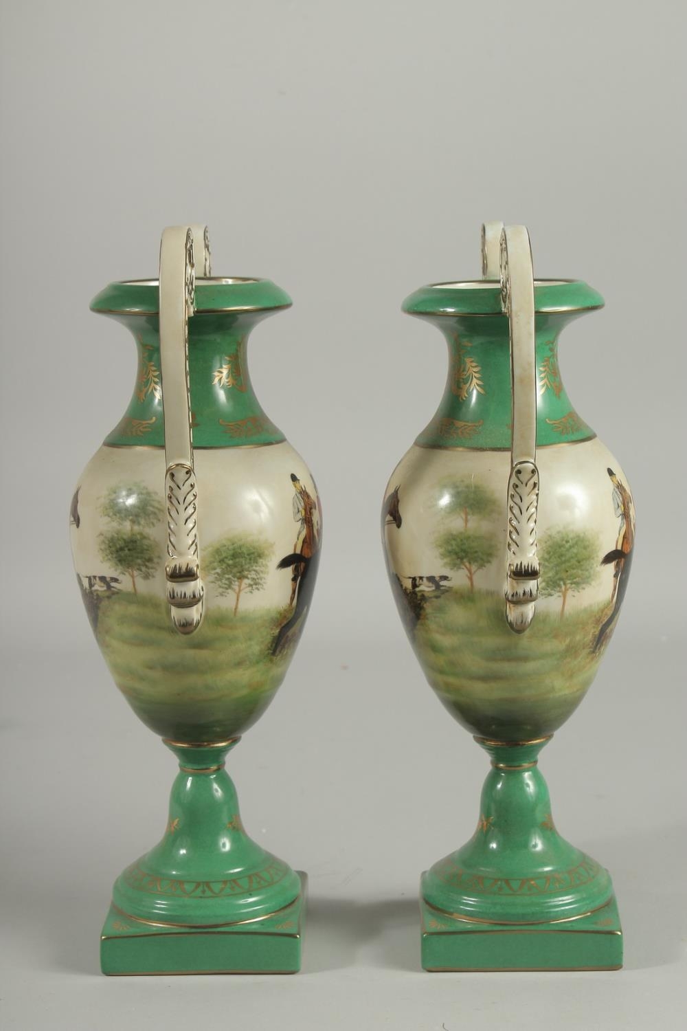 A PAIR OF SEVRES DESIGN TWO HANDLED GREEN HUNTING VASES. 13ins high.