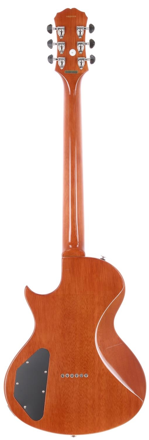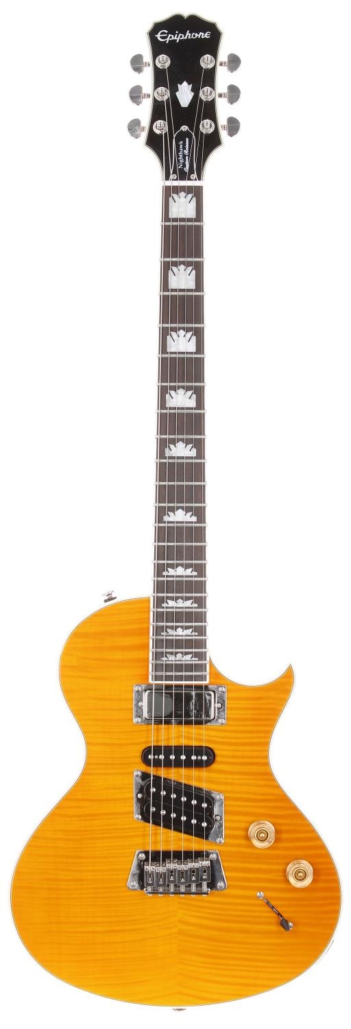 2011 Epiphone Nighthawk Custom Reissue electric guitar, made in Indonesia; Body: amber figured maple top upon natural mahogany back; Neck: mahogany; Fretboard: rosewood with crown position markers; Electrics: working; Hardware: good; Case: Ritter gig bag; Weight: 3.34kg; Overall condition: very good