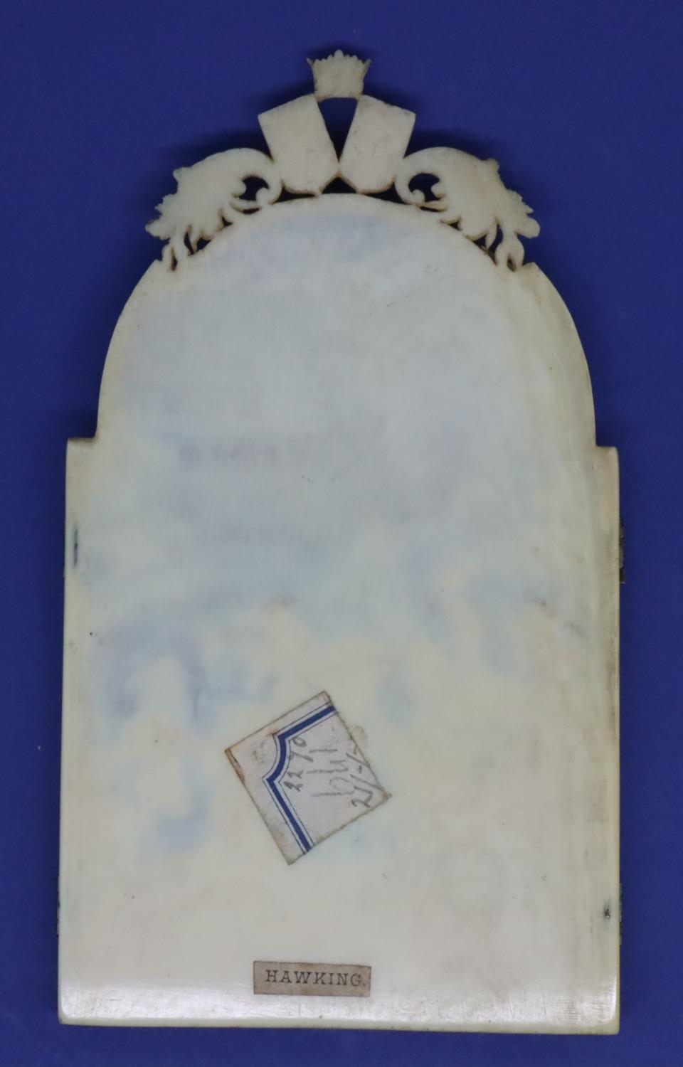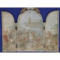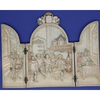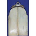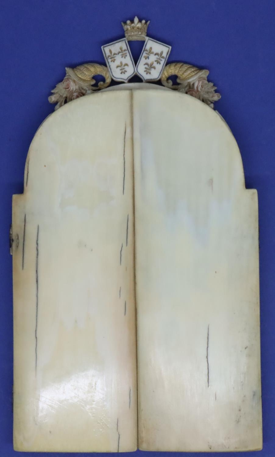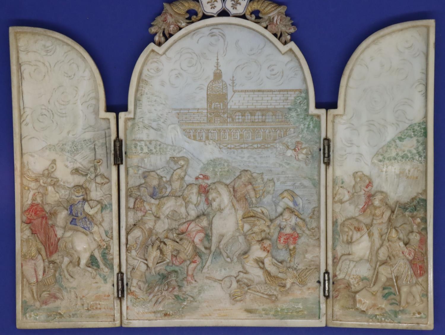 Dieppe ivory French triptych showing battle scenes with Royal crests above, H: 140 mm, 74g. Cracks to outer casing, no damages to seams. P&P Group 1 (£14+VAT for the first lot and £1+VAT for subsequent lots)