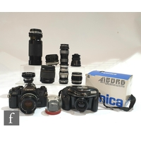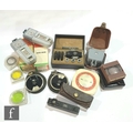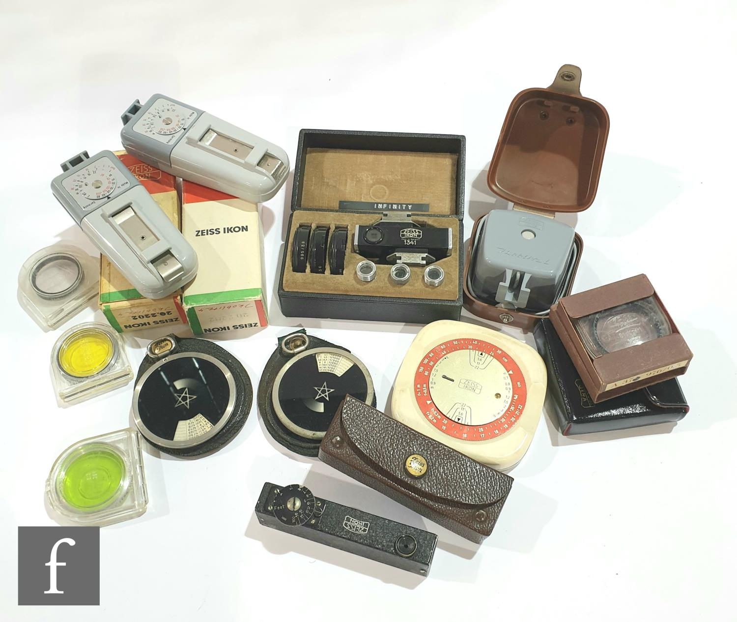 A collection of Carl Zeiss, Zeiss Ikon related photographic equipment, to include a Contax Contameter 1341, close up lens set, proxars 20, 50, 70, with viewfinder, boxed, two 1930s Diaphot extinction meters with leather cases, two 1960s Ikoblitz 4 flash bulbs, an Ikoblitz L folding flash in case and further items. (qty)