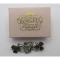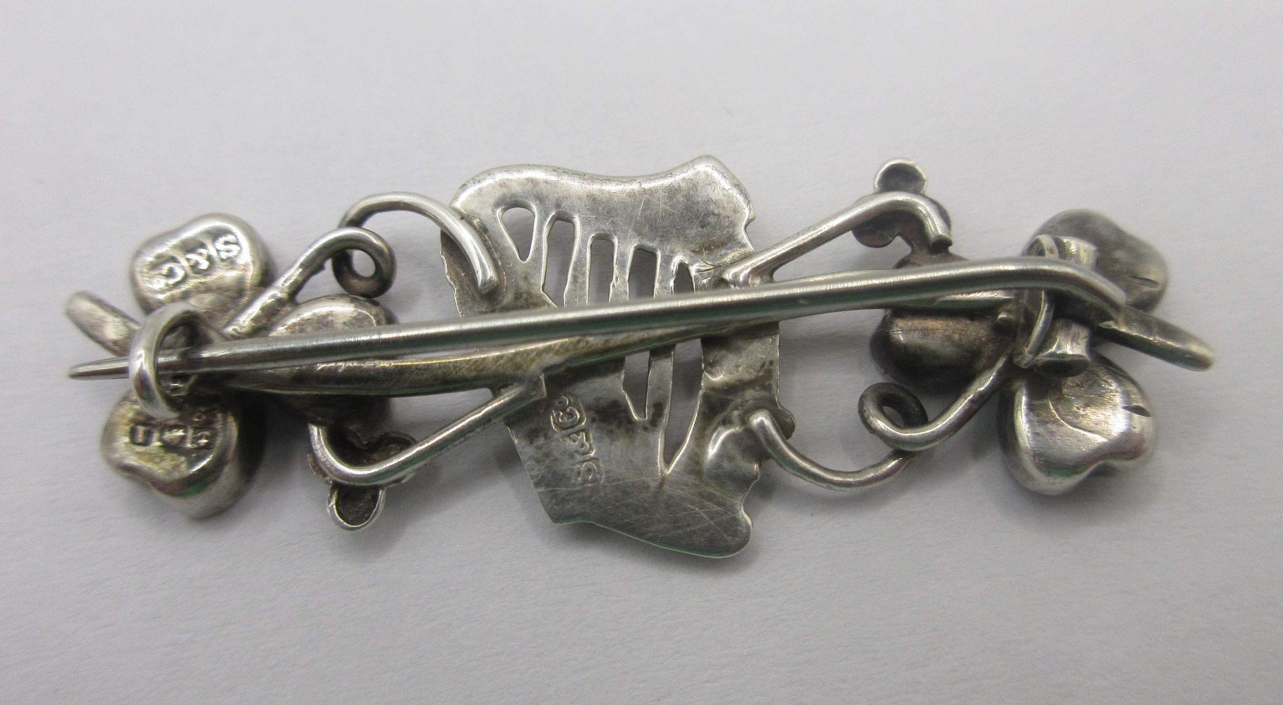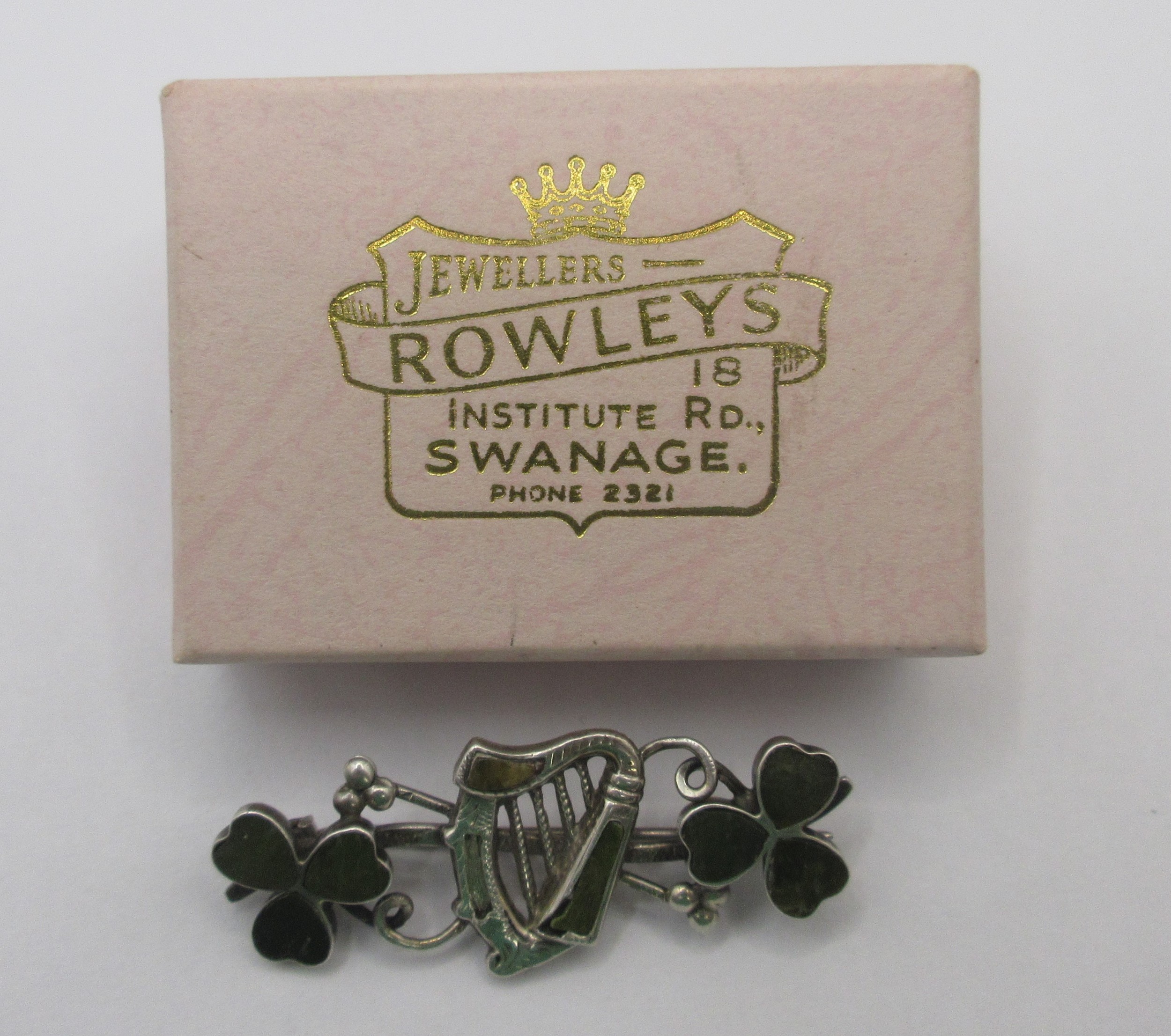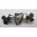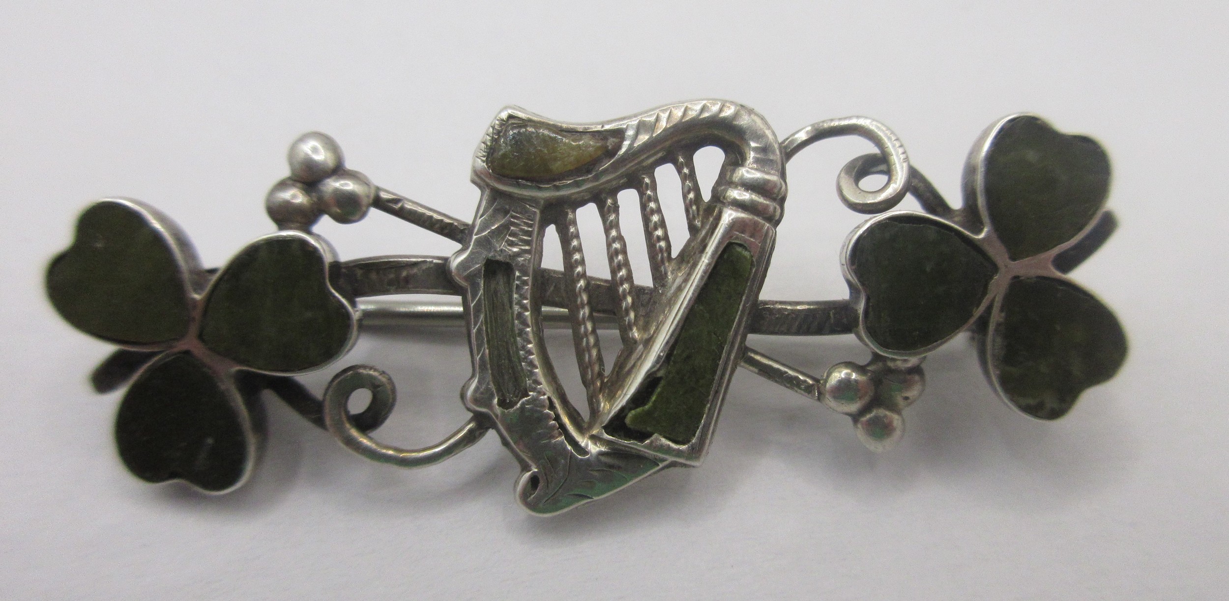 A sterling silver brooch with an Irish theme with a central harp of Erin flanked by shamrocks, the whole inset with green semi-precious stones, hallmarked for Birmingham, possibly 1910, likely by Sydney & Co. Total approx weight 3.74g