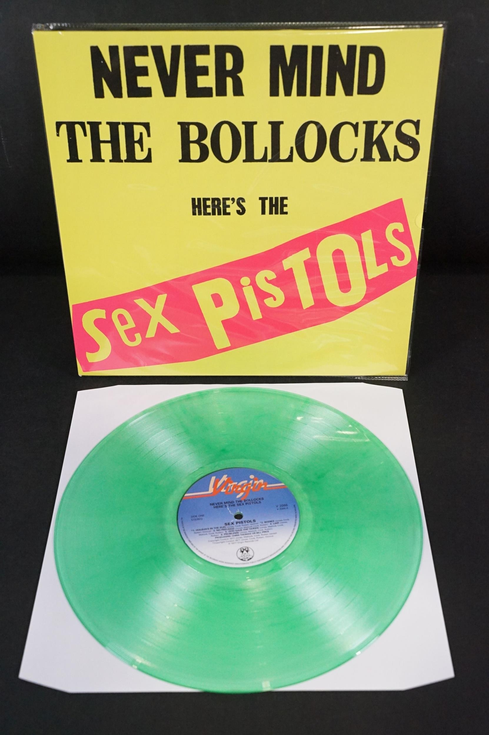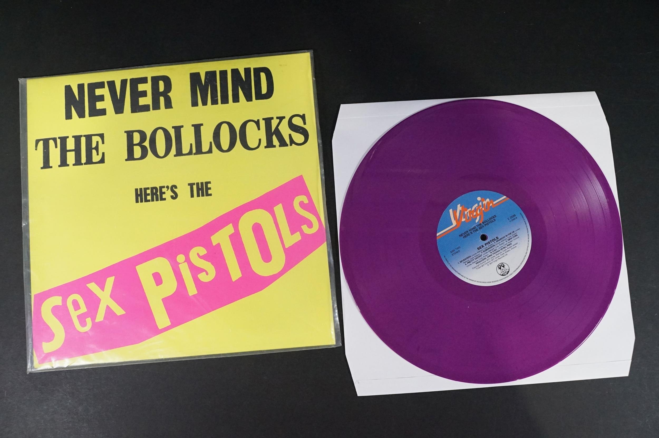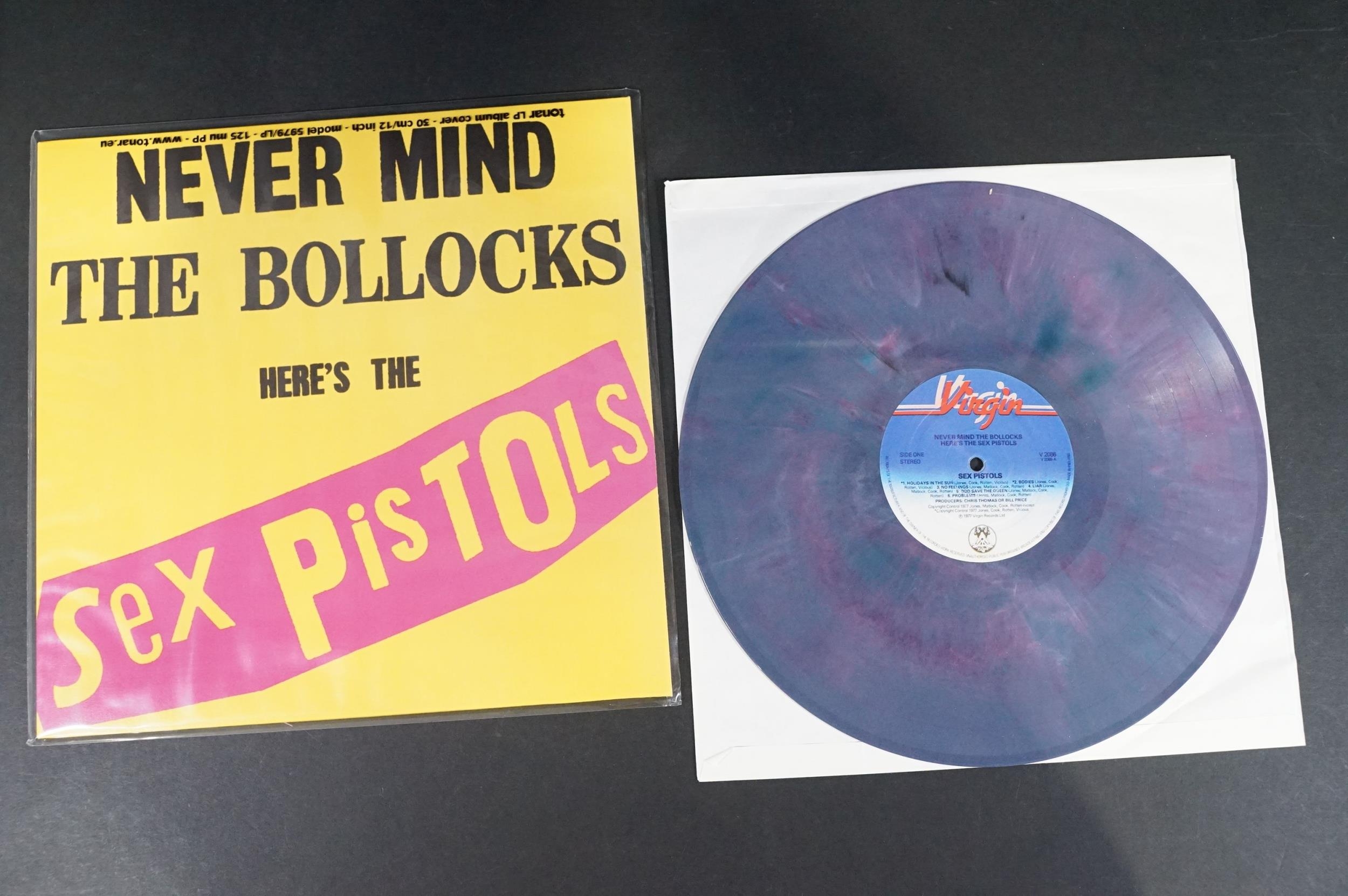 Vinyl - 4 Sex Pistols limited edition UK coloured vinyl re-issue LP’s of Never Mind The Bo****ks Here's The Sex Pistols, Virgin – V-2086, 2014 green, 2010 dark purple marbled, 2010 white vinyl, 2014 purple marbled. Condition EX+