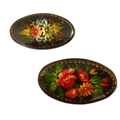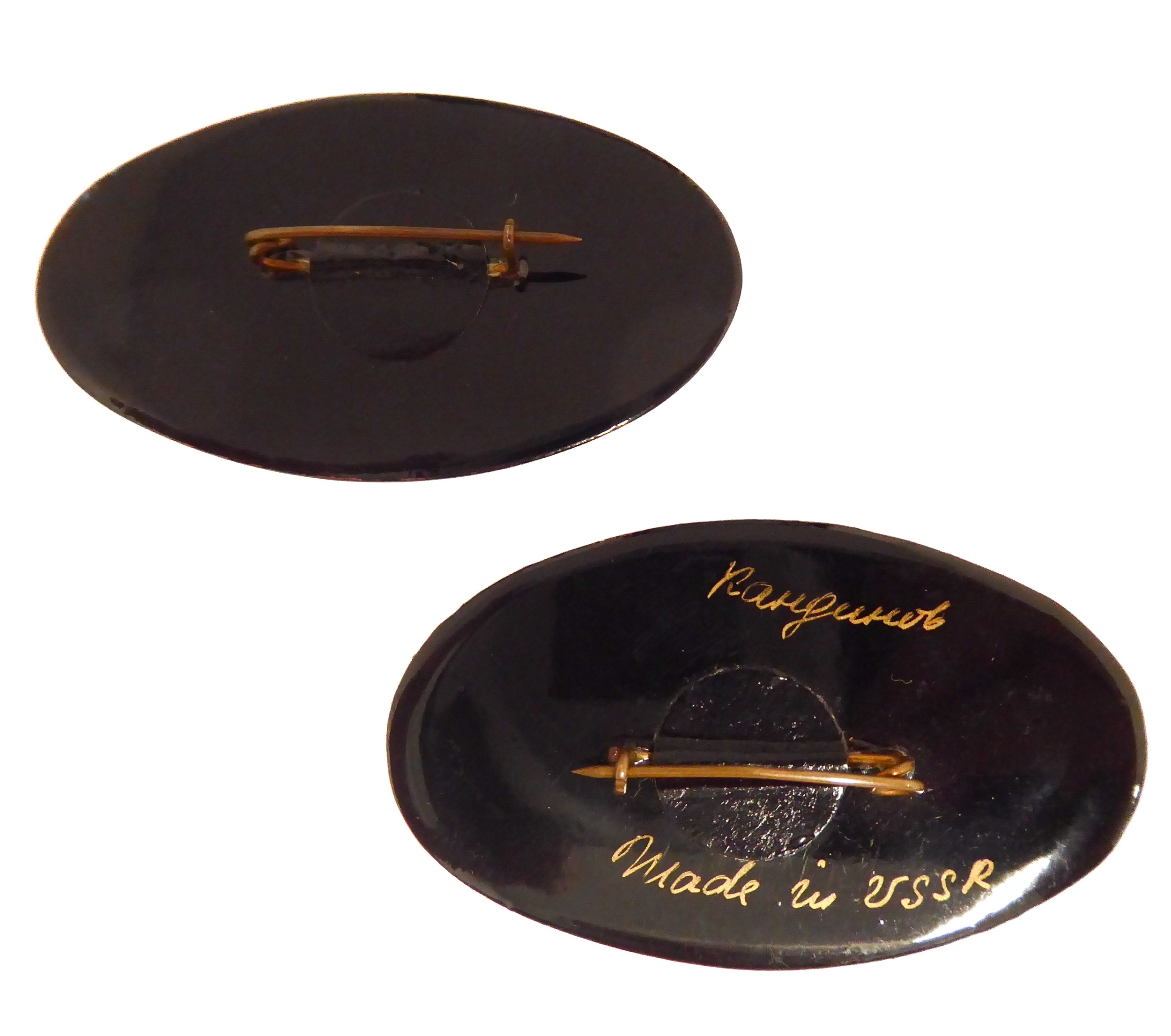 Two Russian oval papier-mâché brooches: hand-decorated with enamels with floral sprays