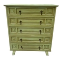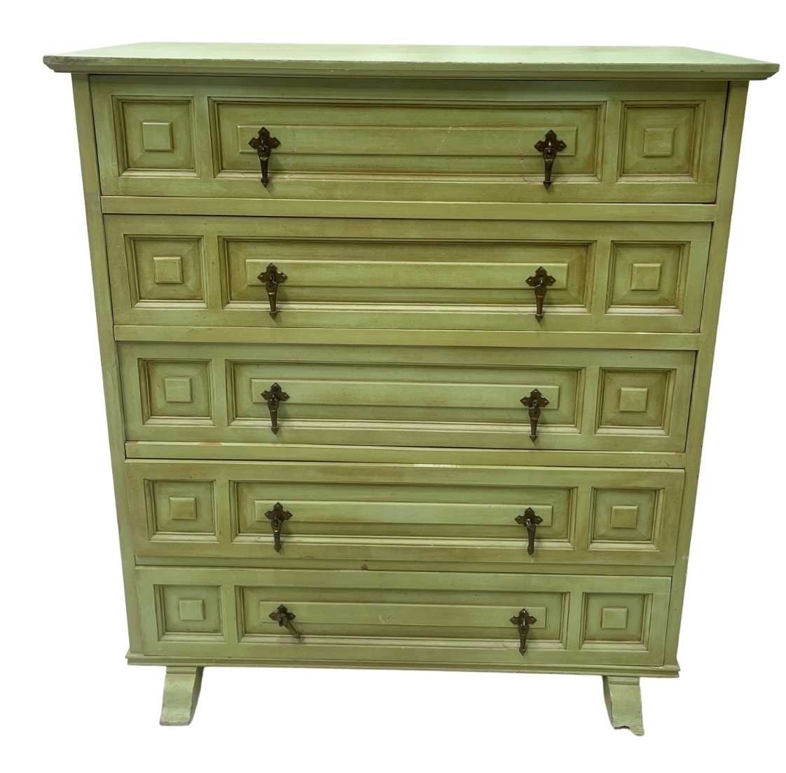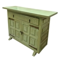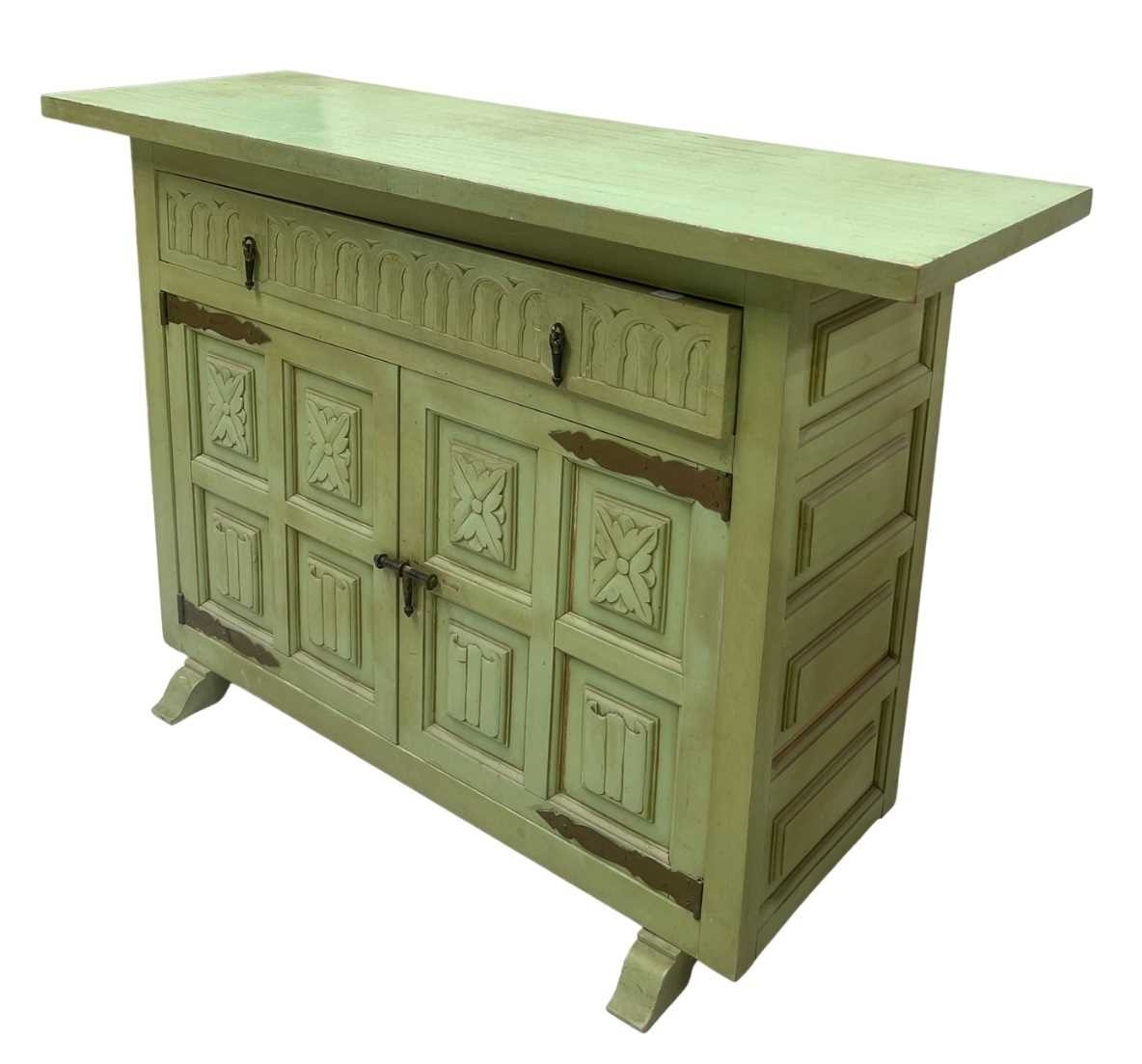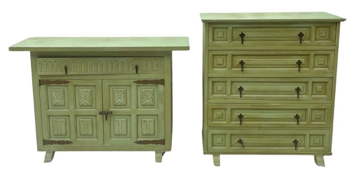 A green painted chest of drawers, five drawers loosely in a Spanish style, brass pulls, distressed finish, height 93cm, width 86cm, depth 40cm, together with a sideboard or storage unit en-suite, height 76cm, width 112cm, depth 38cm (2)