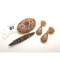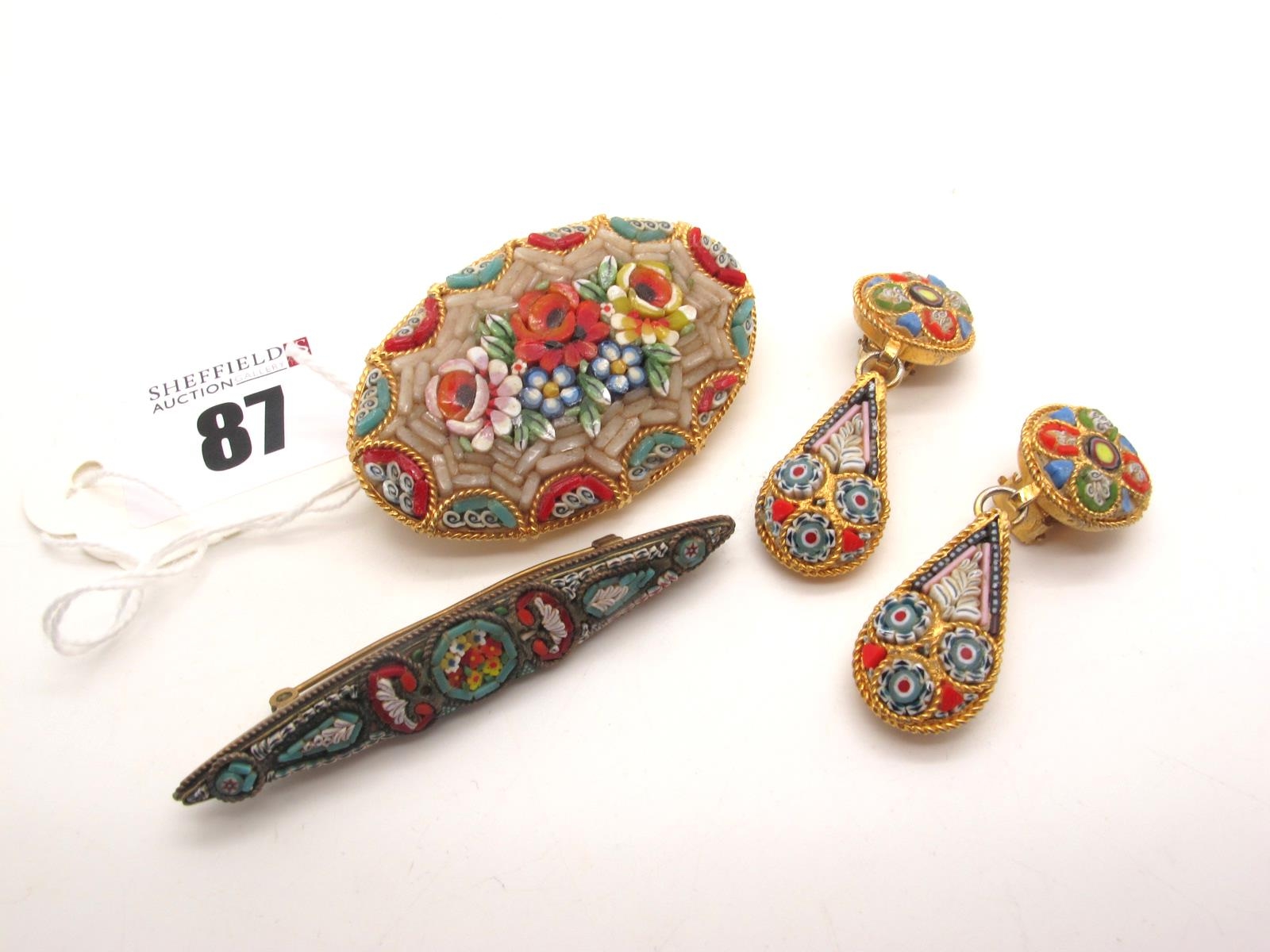 A Vintage Micromosaic Bar Brooch, together with a gilt metal oval micromosaic brooch and pair of (unpierced) clip on drop earrings.