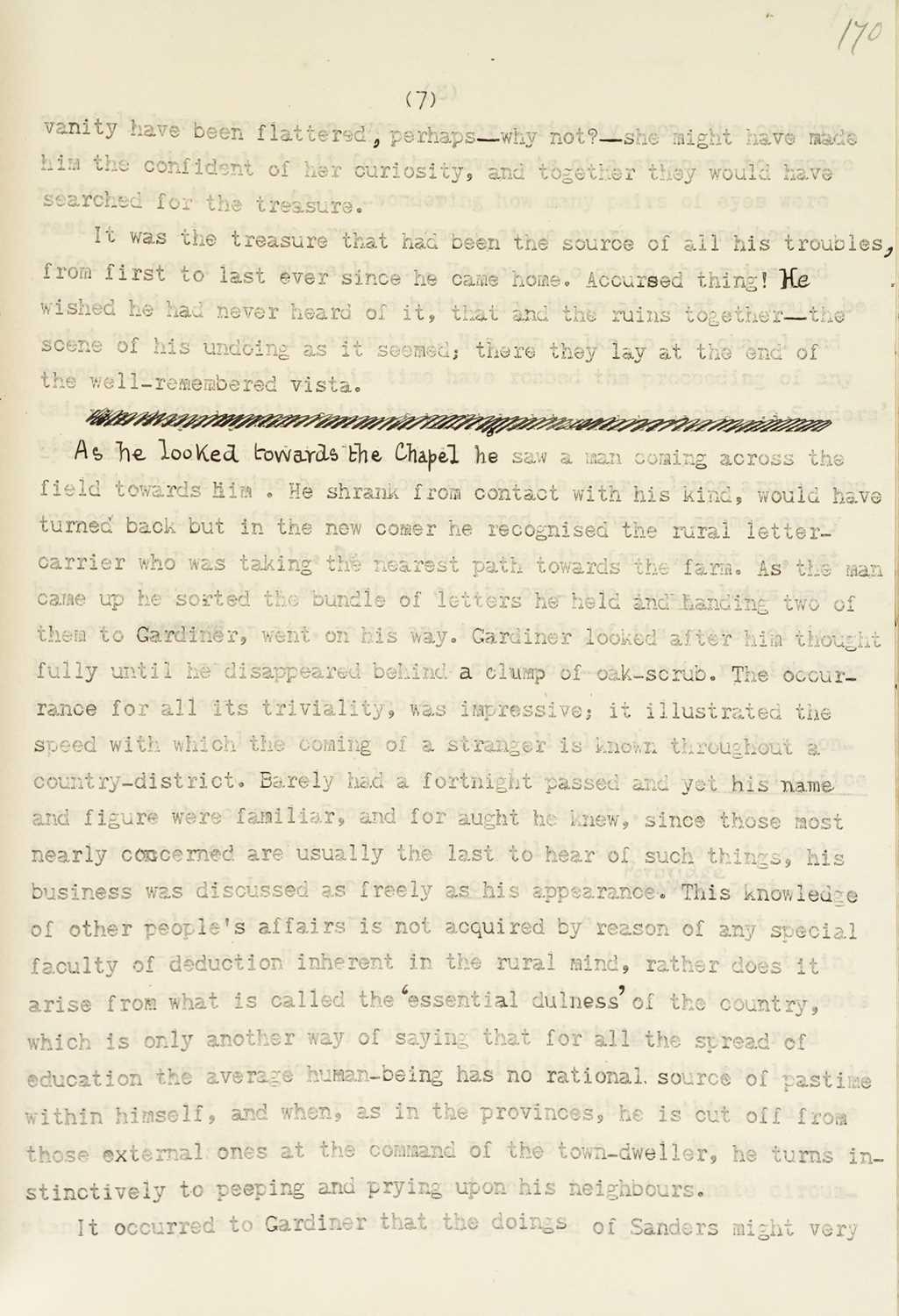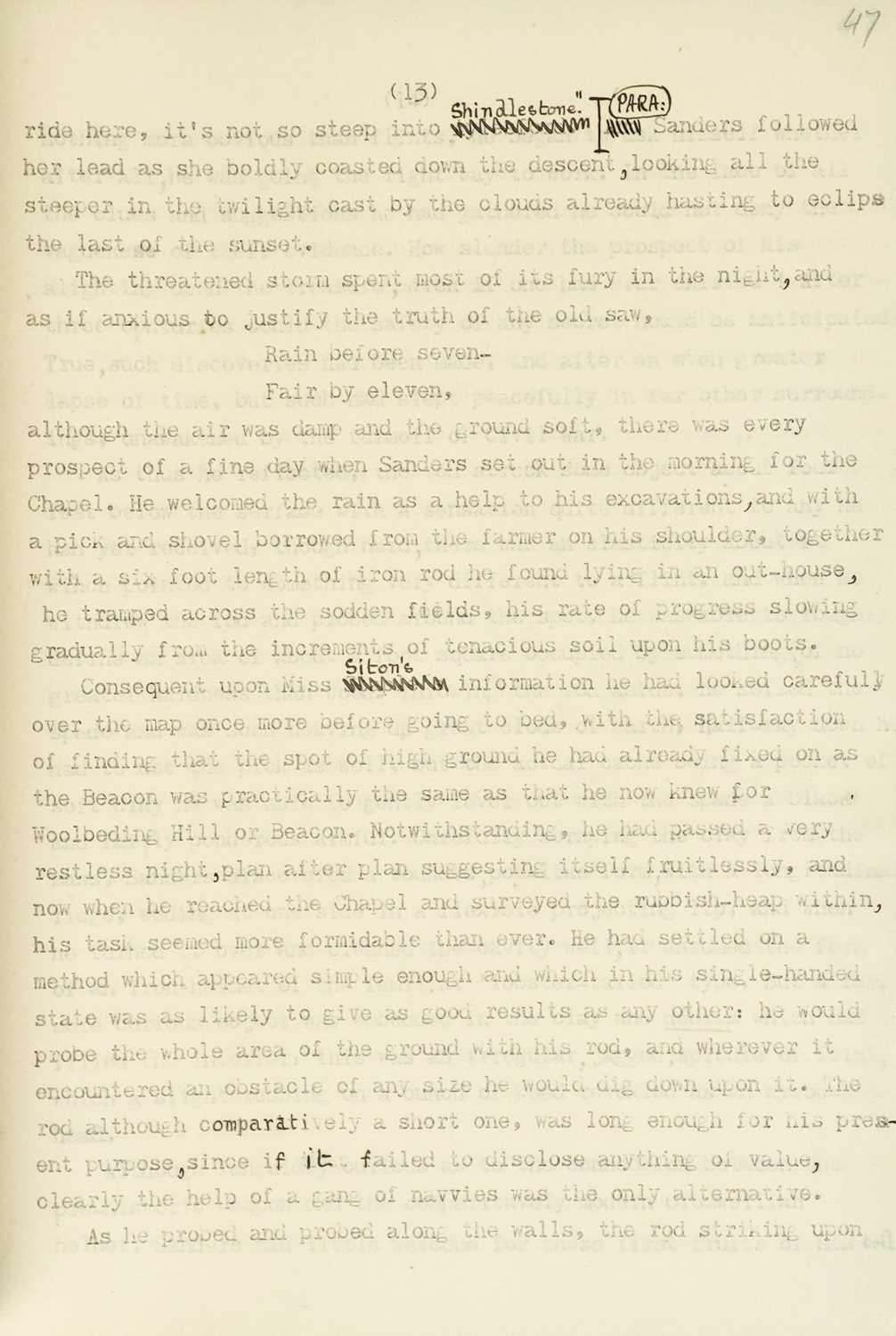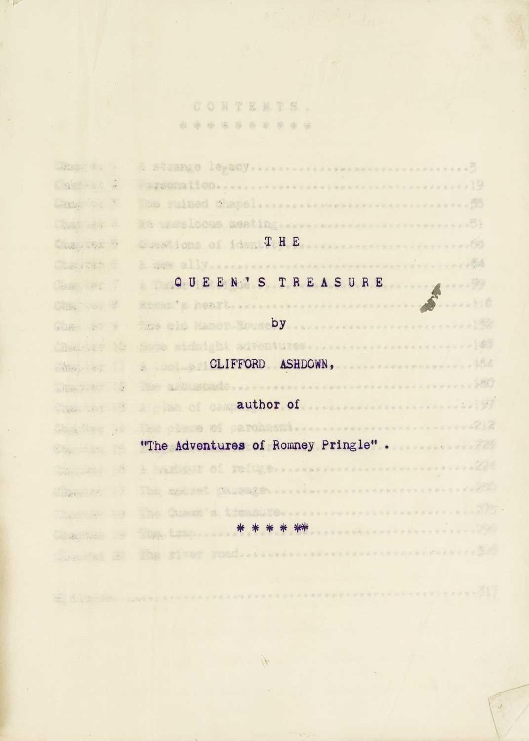 ASHDOWN, Clifford (pseud R. Austin Freeman and John James Pitcairn). 'The Queens Treasure' Typescript with text to recto, ink corrections throughout, pagination written in graphite to top corner, pp.317, house plan and map of ground floor, first floor, and surrounding villages loosely inserted, quarter cloth with printed label to front board, [c.1905]. Thought to be Pitcairn's original manuscript from the 'Pitcairn Family Papers', purchased from a charity auction in Truro (Pitcairn retired to Truro). The style is certainly Pitcairn's own with the prose bearing no trace of Freeman, with Miss Siton being corrected from 'Staple' throughout (xi, introduction to published edition).