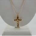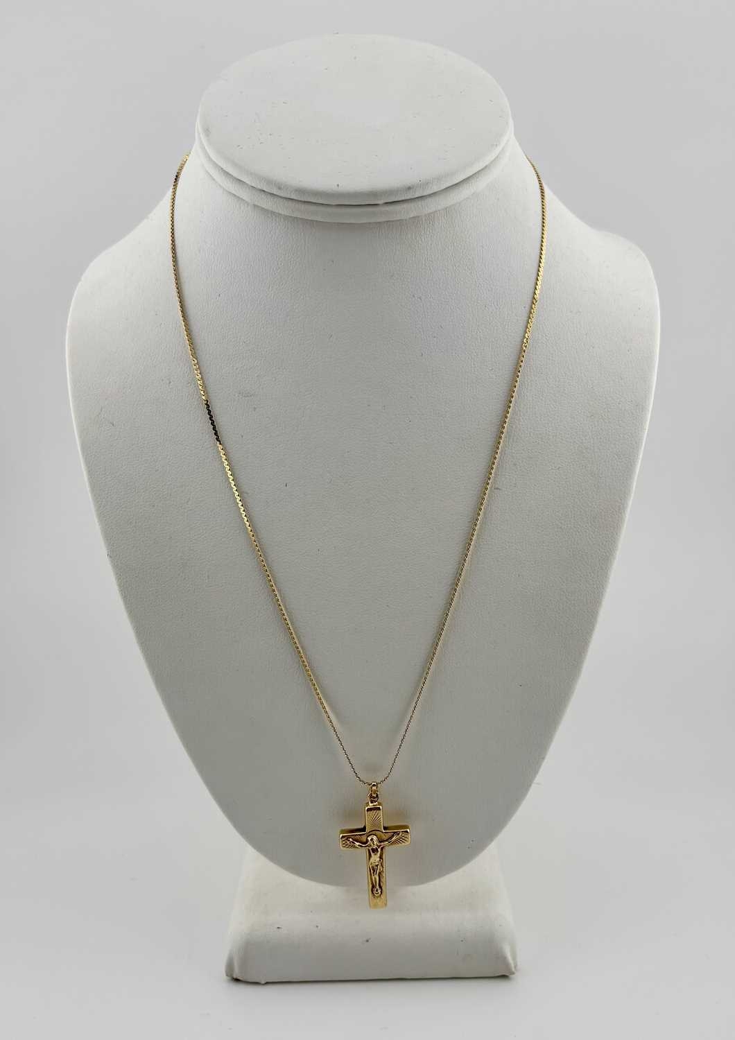 A crucifix pendant, with serpentine-link chain, both stamped 750, length of pendant 3.6cm, length of chain 50cm, 5.6g.
