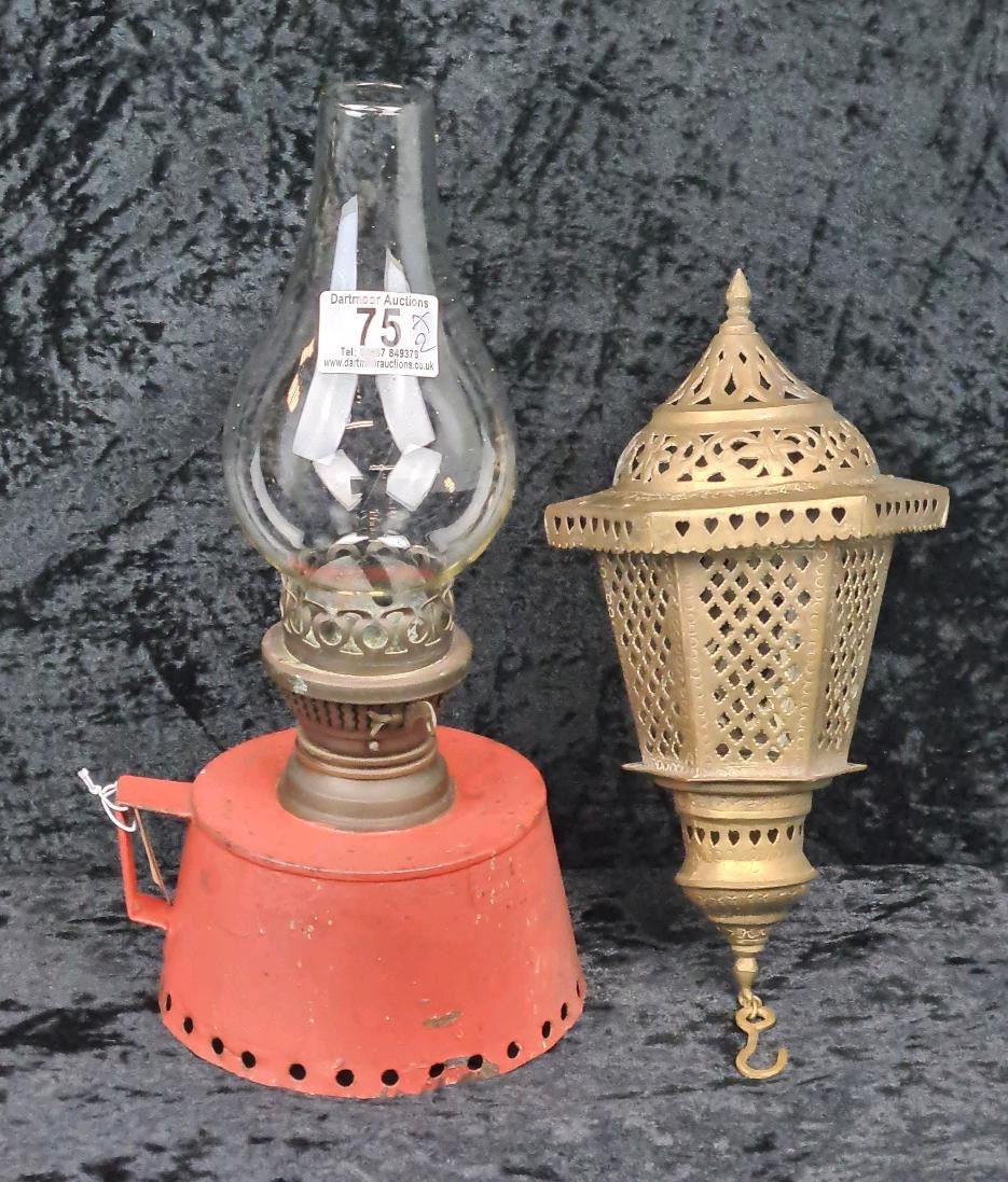 Red metal vintage oil lamp along with a Moroccan brass hangi...