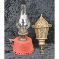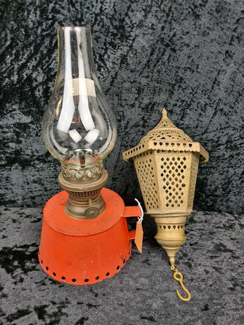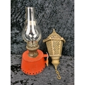 Red metal vintage oil lamp along with a Moroccan brass hanging lantern with wall mount. Tallest approx H32cm.