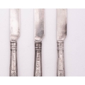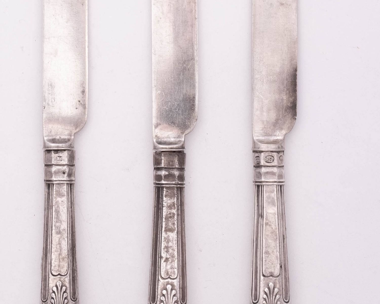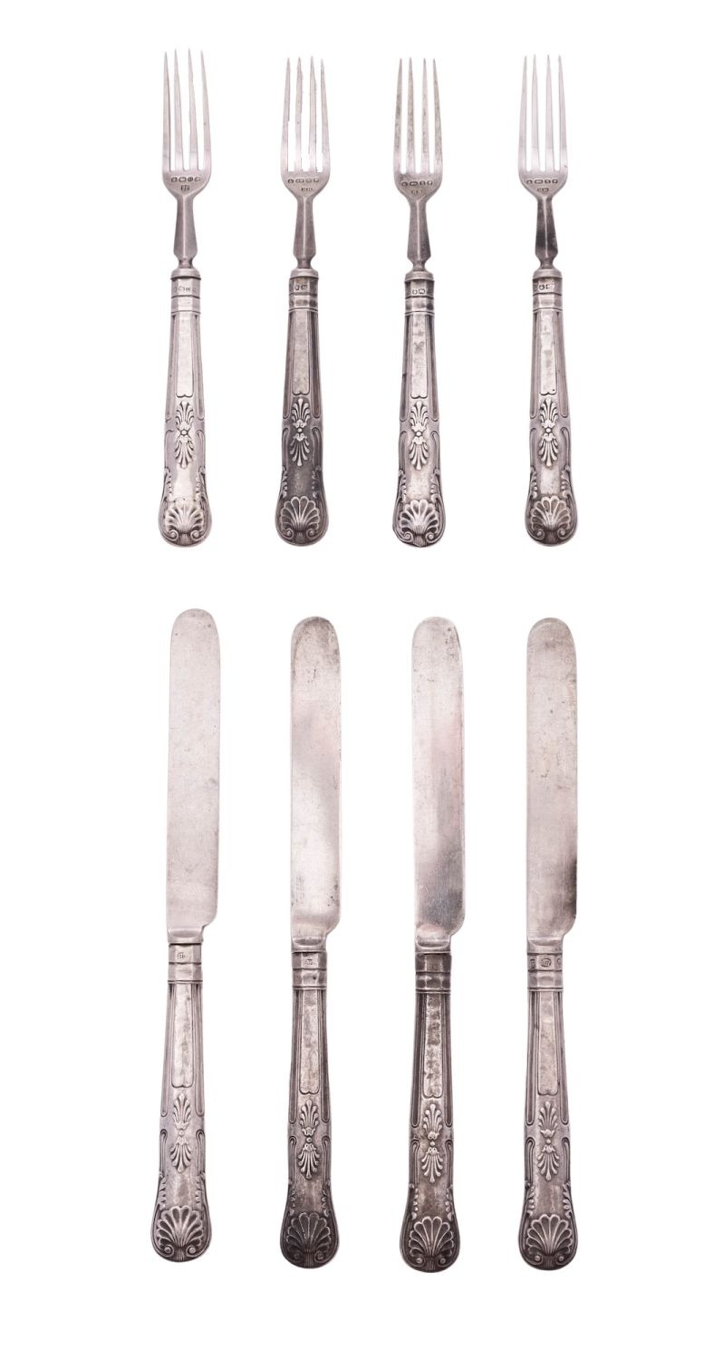 Three pairs of Victorian silver dessert knives & forks, King's pattern (loaded handles), all but one fork by Harrison Brothers & Howson, Sheffield 1884-1887 (8)