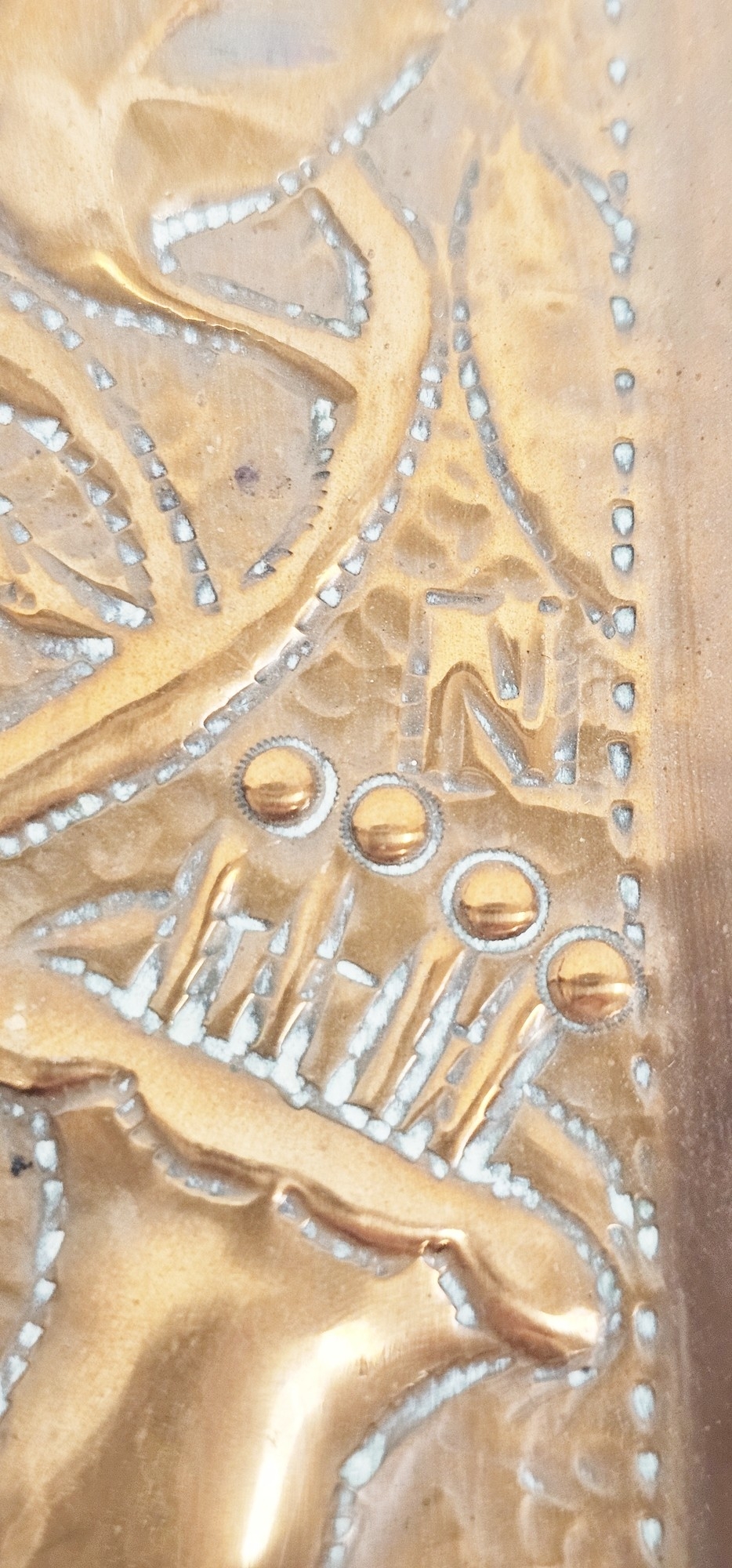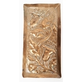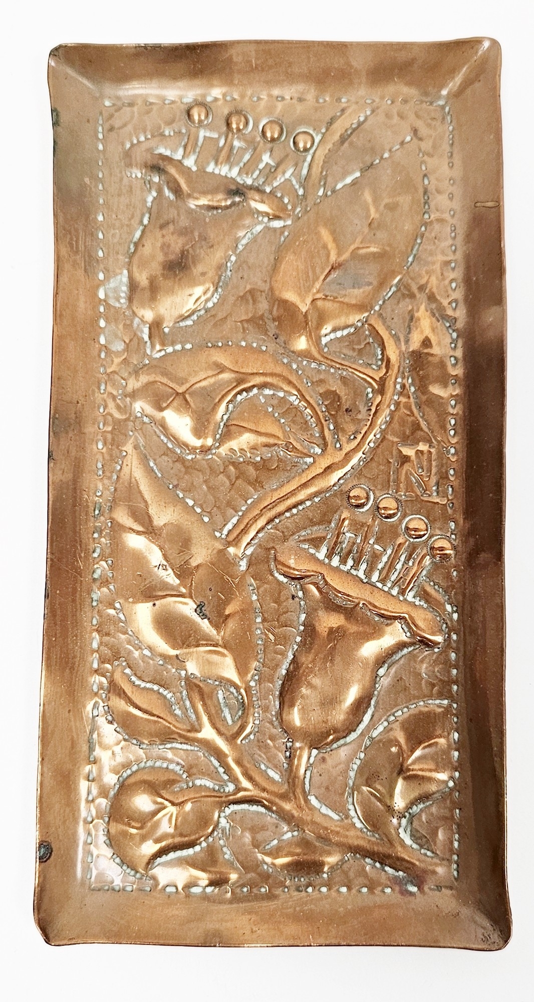 Arts and Crafts copper small tray with repousse decoration of flowers, leaves and the initial N (possibly for Newlyn), 18cm long