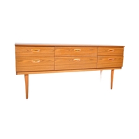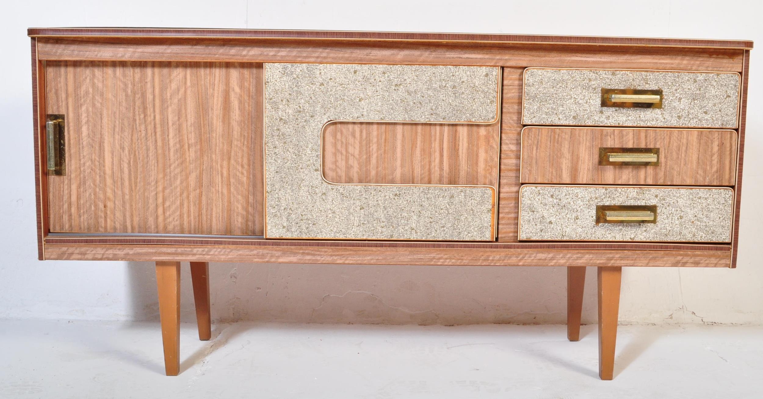 A retro 20th Century two tone formica sideboard credenza having two cupboard doors to the left housing a shelved interior flanked by a bank of three drawers to the right. All raised on tapering supports. Measures approx; 74cm x 147cm x 41cm.