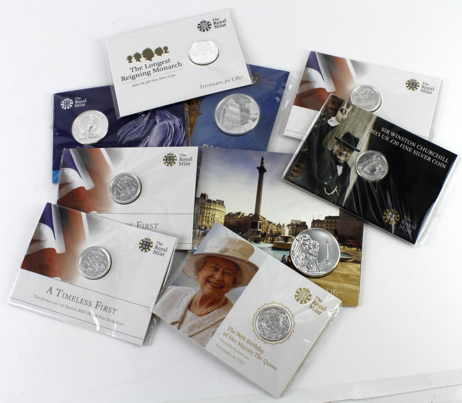 GB Royal Mint Silver Coin Packs (9): £100 2015, 2016; £50 2015; and various £20. (£370 face value)